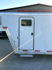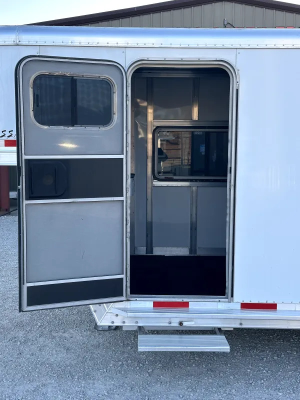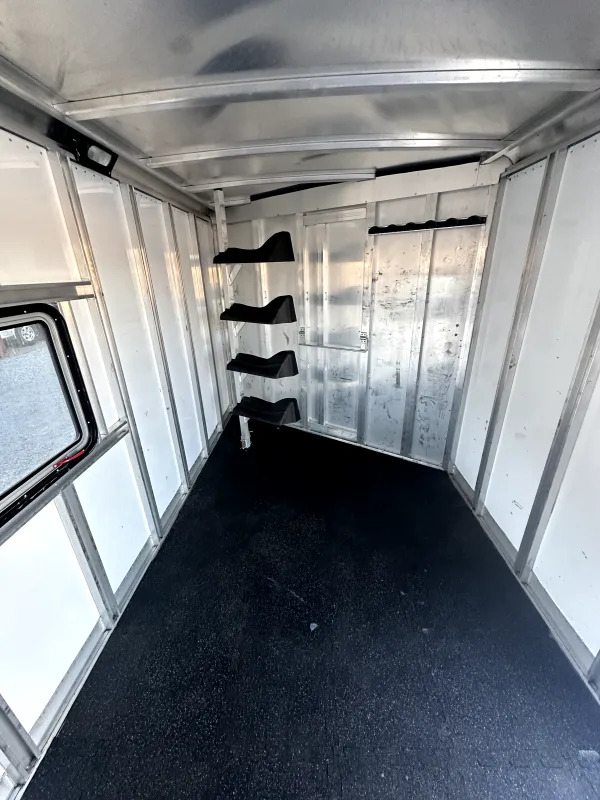 Dressing Room Features - pull-out step below camper door, swinging screen door, carpet on: nose & drop wall, rubber floor mats, aluminum brush box, 3 interior lights, 6 bridle hooks, 4-tier removable saddle rack, folding blanket bar, large 4’x2’ window.