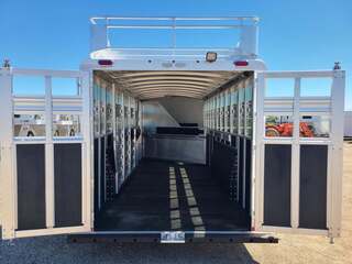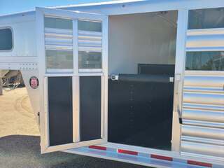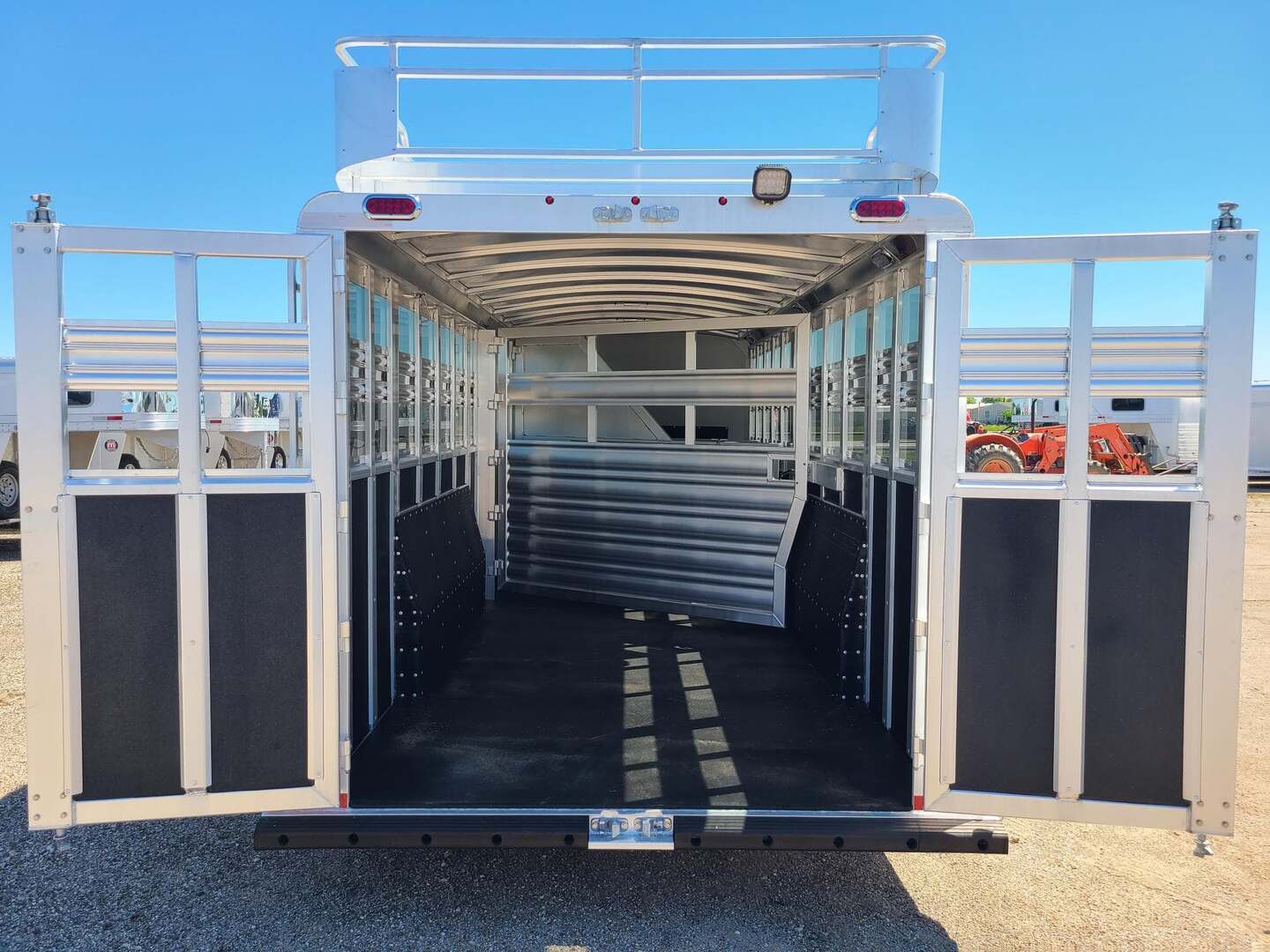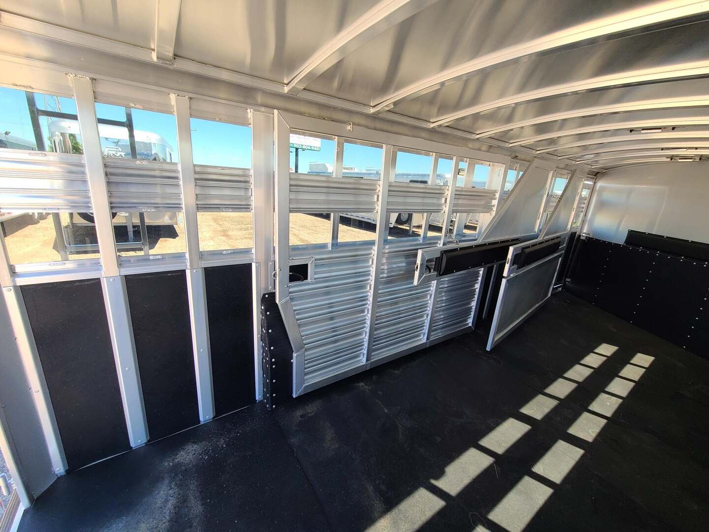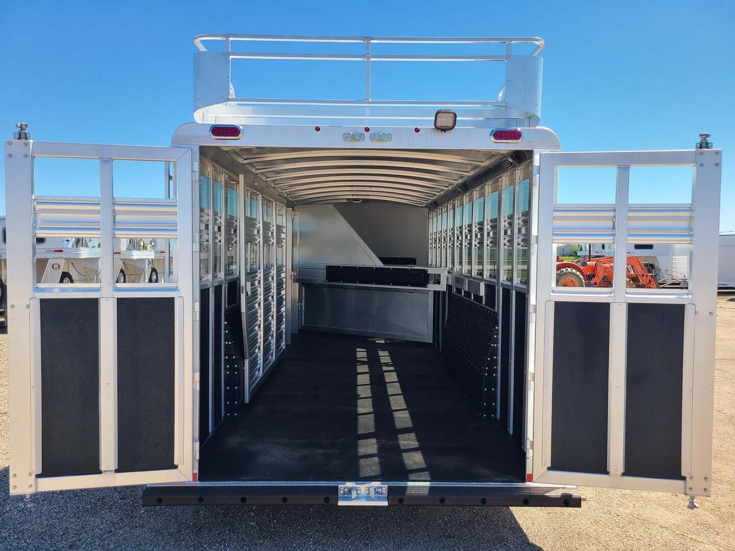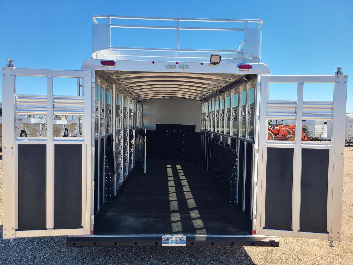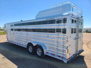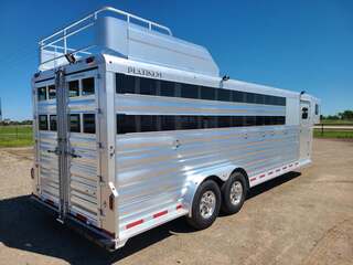 Platinum 25’ Stock Combo 7’6” x 25 x 7 tall Mill Finish skin Aluminum mag wheels Extremely versatile trailer!! 1st gate is horse divider with removable panel at bottom 2nd gate is normal horse divider 3rd gate is slatted center partition, keep horses and cattle separate!! Haul roping steers & 3 horses Haul 6 horses, 8 cows, haul whatever!! Plexiglas & Track on both sides of trailer Rubber in between wall studs on both sides 6’ hay rack & ladder 6 saddle racks, 15 bridle hooks, and 4 blanket bars in tack room!! 3 tier swing out saddle rack keeps all of your tack easily to grab!! Carpeted bulkhead wall to protect your gear Rubber mats in 30” dressing room floor for easy cleaning One brush tray and five hooks on tack door Stainless steel nose with Mill Finish exterior skin Double rear gates with double anti rack hardware Stock escape door on driver side 4 LED load lights and plenty of outside tie rings Two roof vents for maximum ventilation!! Ready for anything!!!