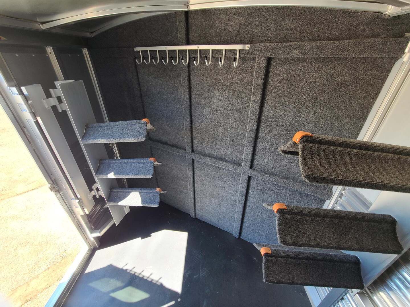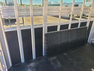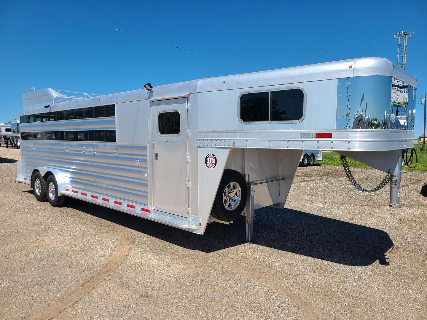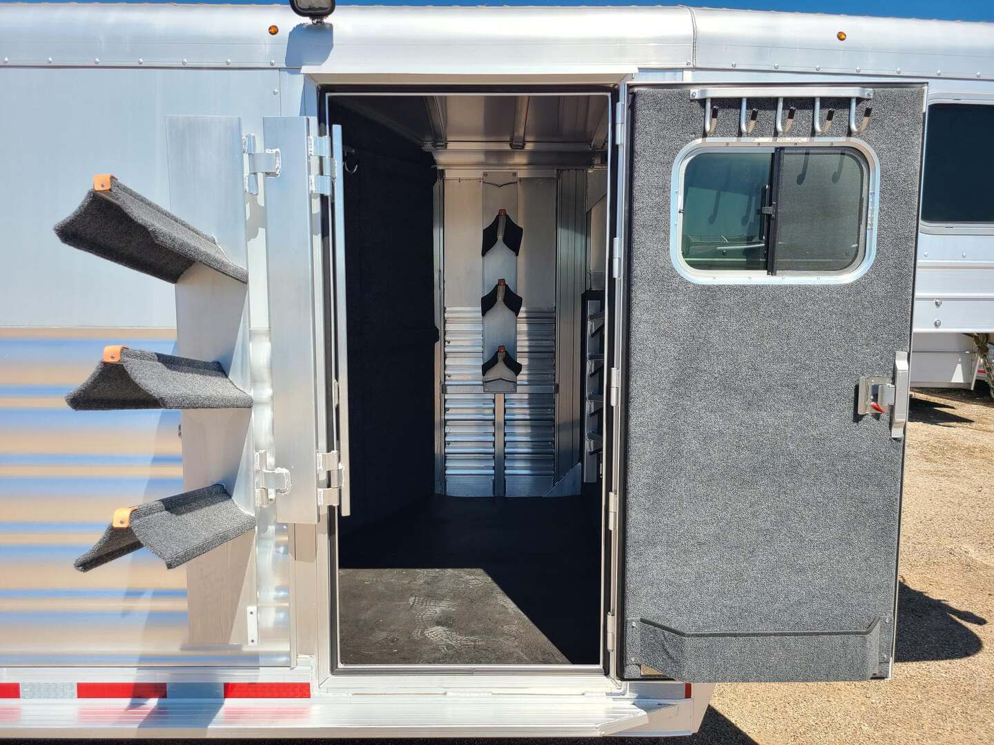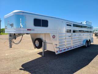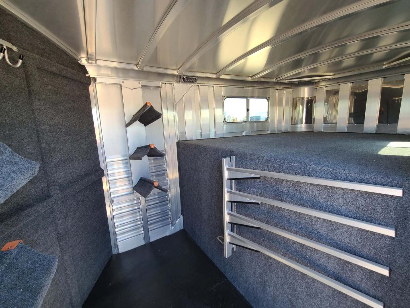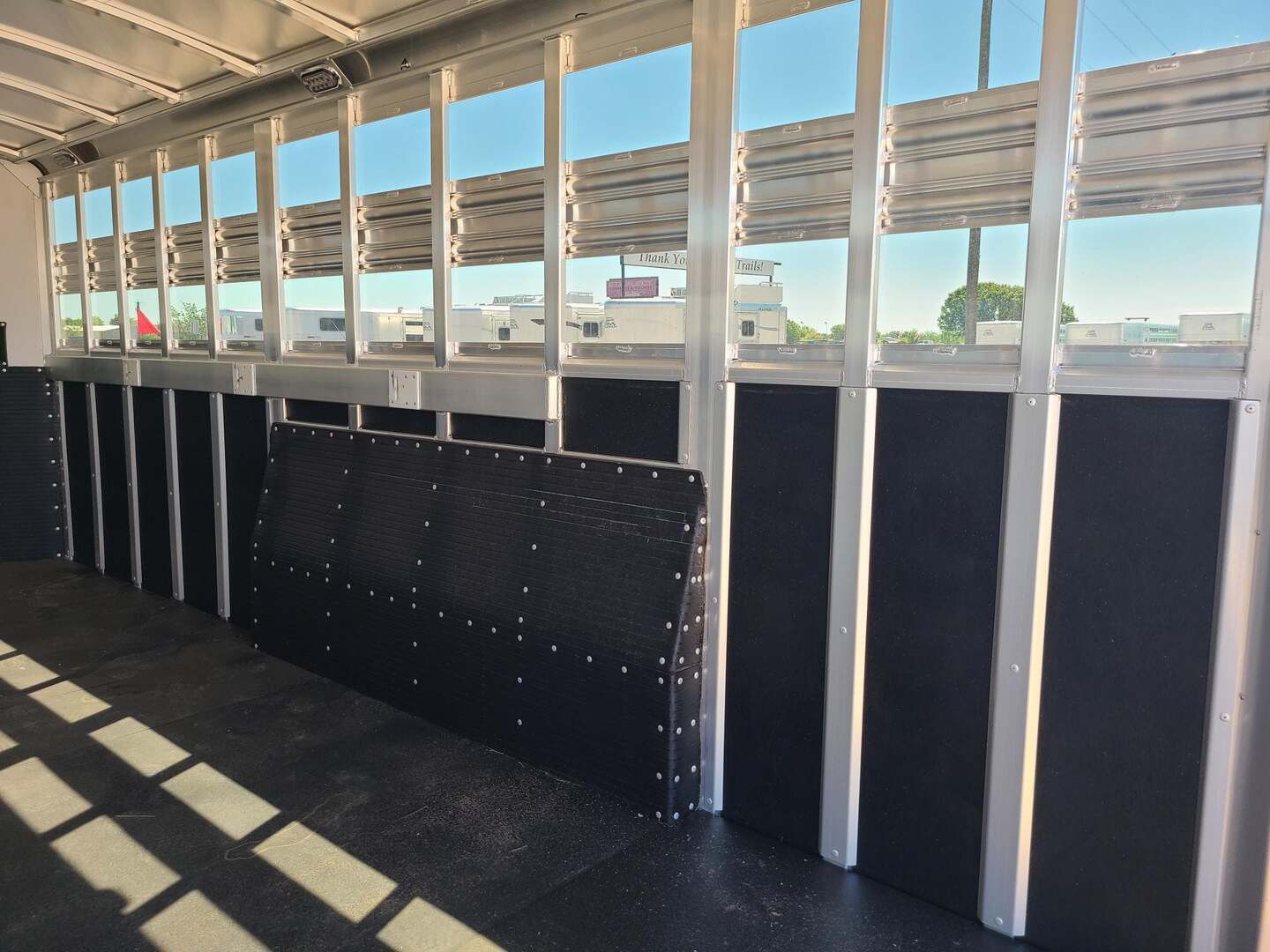 Platinum 25’ Stock Combo 7’6” x 25 x 7 tall Mill Finish skin Aluminum mag wheels Extremely versatile trailer!! 1st gate is horse divider with removable panel at bottom 2nd gate is normal horse divider 3rd gate is slatted center partition, keep horses and cattle separate!! Haul roping steers & 3 horses Haul 6 horses, 8 cows, haul whatever!! Plexiglas & Track on both sides of trailer Rubber in between wall studs on both sides 6’ hay rack & ladder 6 saddle racks, 15 bridle hooks, and 4 blanket bars in tack room!! 3 tier swing out saddle rack keeps all of your tack easily to grab!! Carpeted bulkhead wall to protect your gear Rubber mats in 30” dressing room floor for easy cleaning One brush tray and five hooks on tack door Stainless steel nose with Mill Finish exterior skin Double rear gates with double anti rack hardware Stock escape door on driver side 4 LED load lights and plenty of outside tie rings Two roof vents for maximum ventilation!! Ready for anything!!!
