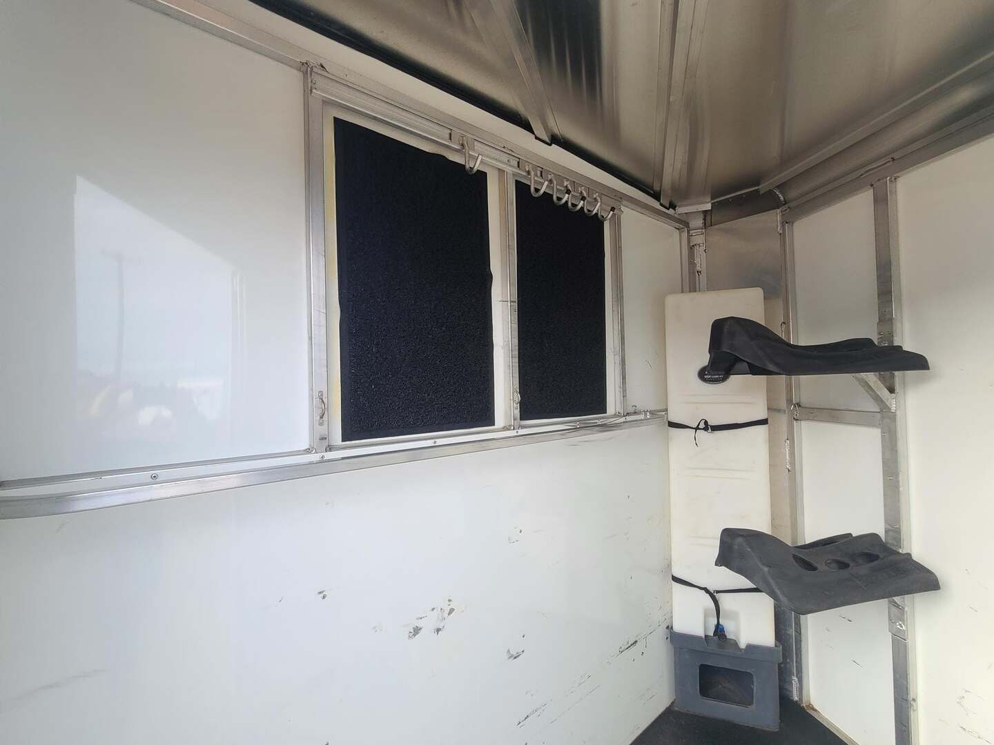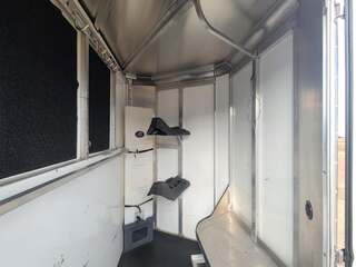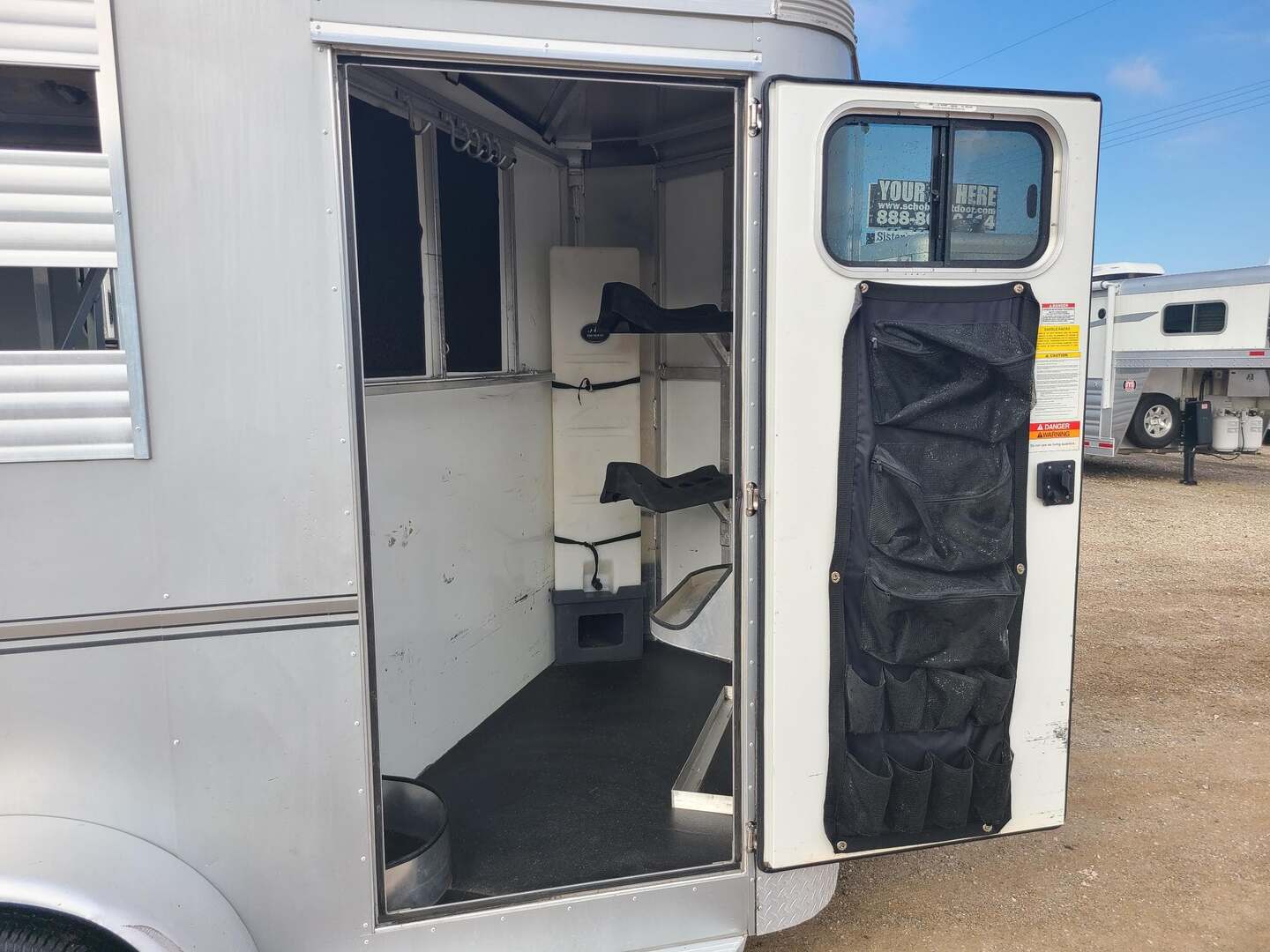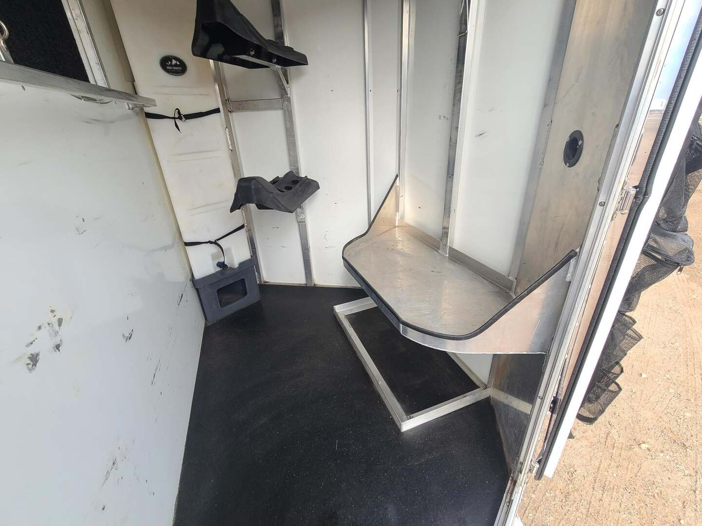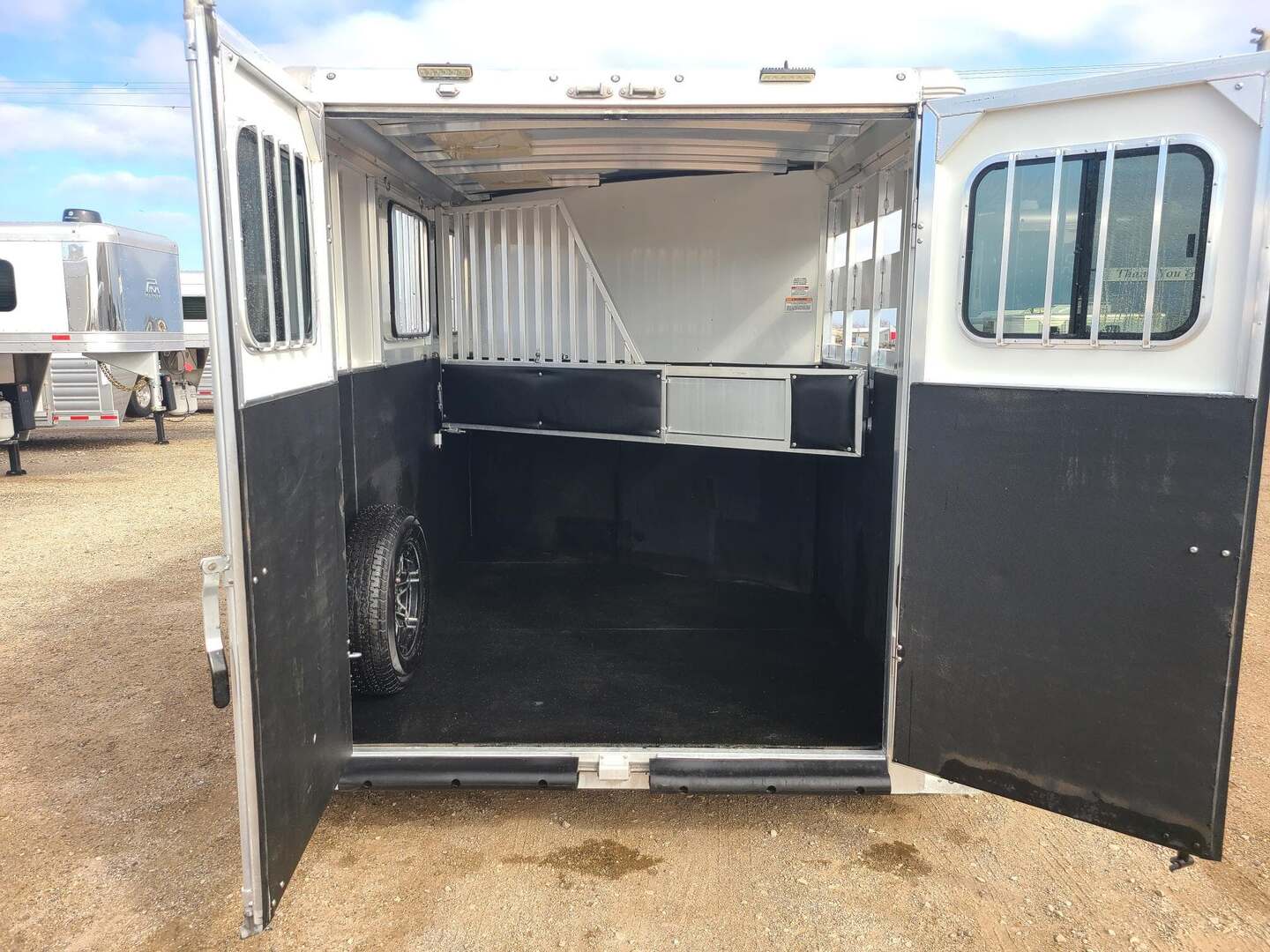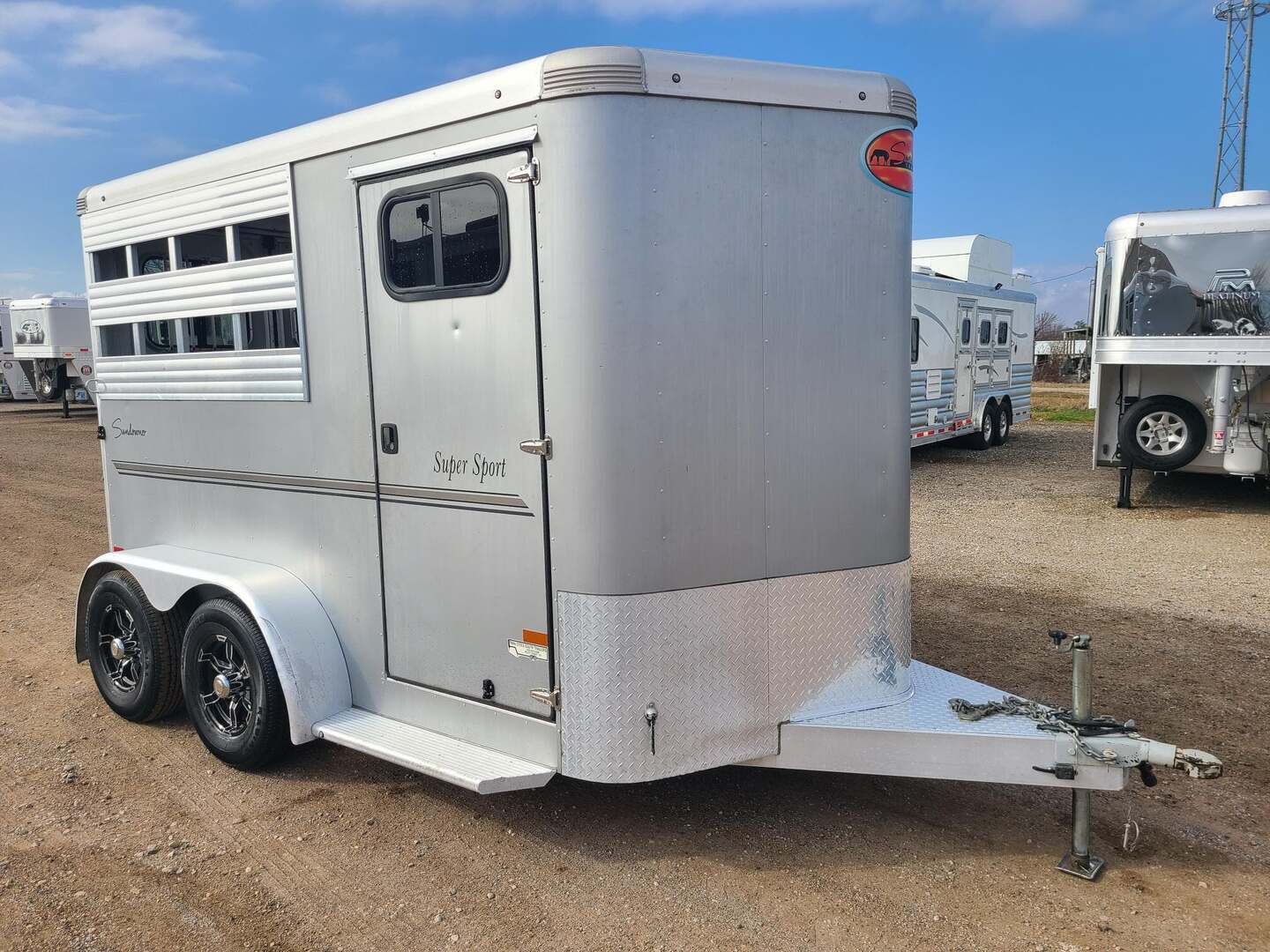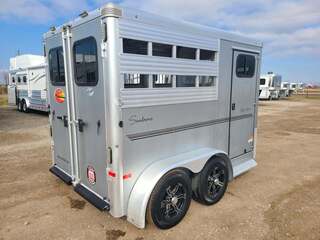 2021 Sundowner 2 Horse Bumper Pull SUPER SPORT 6’9” wide x 13’ long x 7 tall Drop down windows on head side, slats on rump wall 25 gallon water tank in front dressing room Shelves, clothes rod, saddle racks, hooks in dressing room Aluminum wheels on 15” tires 3500# axles Aluminum gravel guard