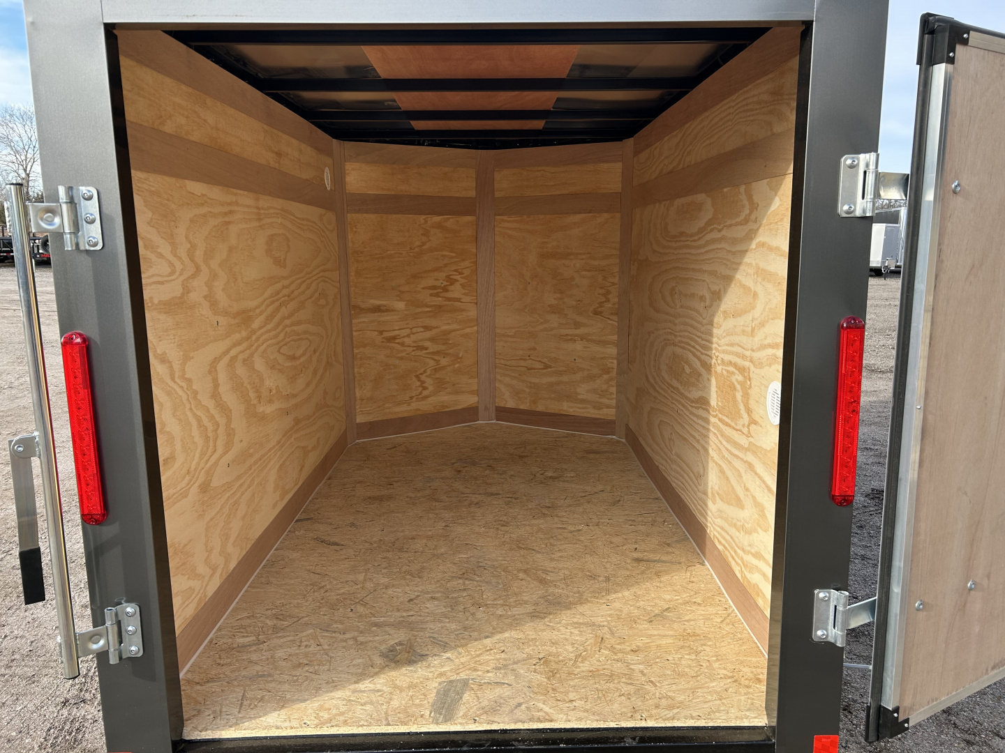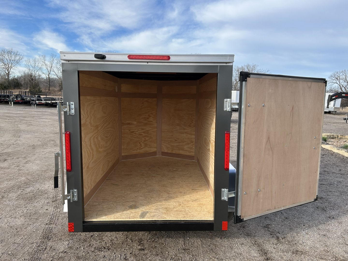 2026 CROSS 5X8’ BETA ENCLOSED TRAILER GVWR 2990# SINGLE 3500# SPRING RIDE AXLE ST205/75R15” LR-E TIRES 4 PRONG PLUG 60” INTERIOR HEIGHT SINGLE REAR DOOR, W/ BAR LOCK 2: COUPLER ON A FRAME 2000# CRANK JACK 3/8” PLYWOOD WALLS 3/4” WATER RESISTANT FLOOR 1 PIECE SEAMLESS ALUMINUM ROOF EXTERIOR SCREWED ON SEAMS 16” ATP GRAVEL GUARD BRUSHED ALUMINUM FENDERS