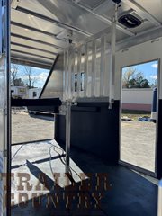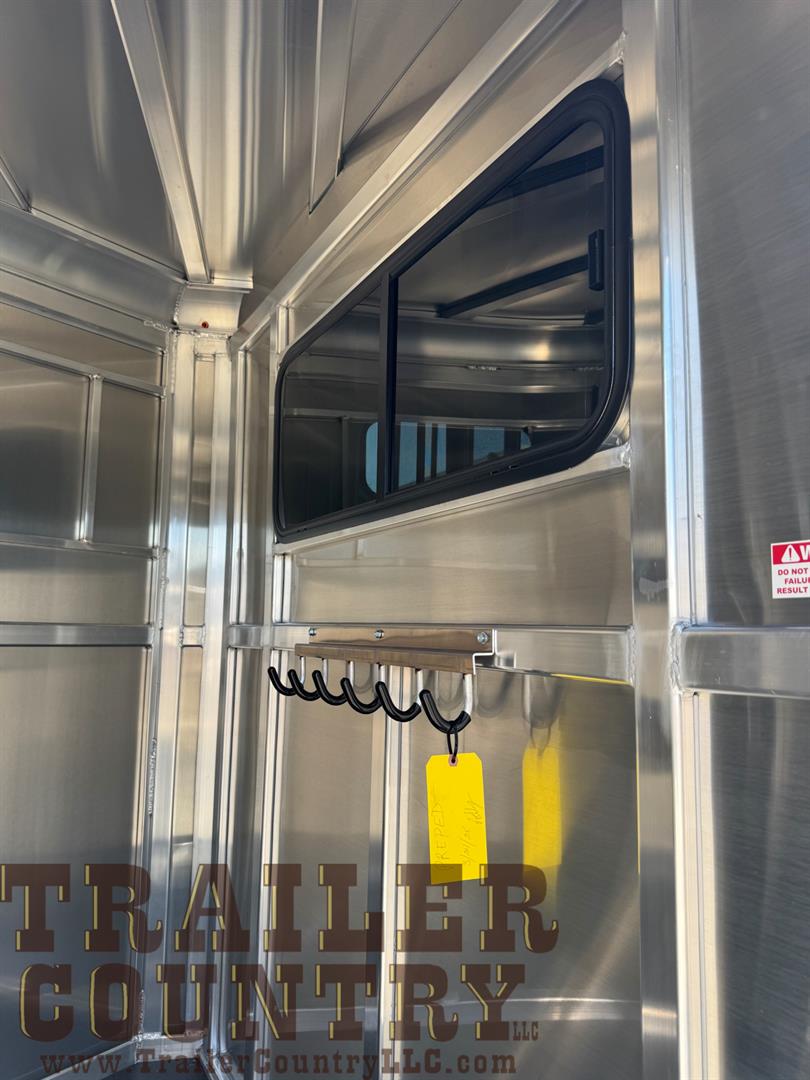 • 4′ dressing room includes 2 saddle racks, 6 bridle hooks, spare tire mounted in dress, camper style door with screen door and sliding window, sliding window over saddle racks, sliding window between horse area and dressing room, mats on dressing room floor ILO carpet