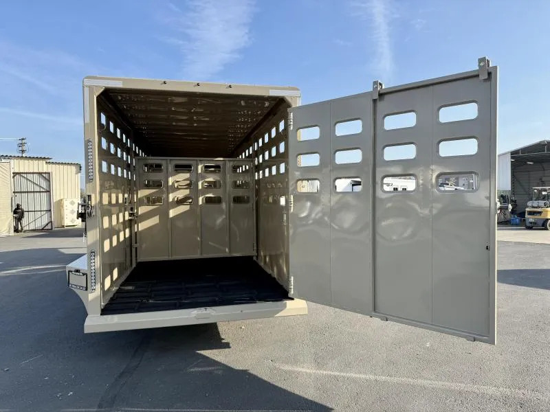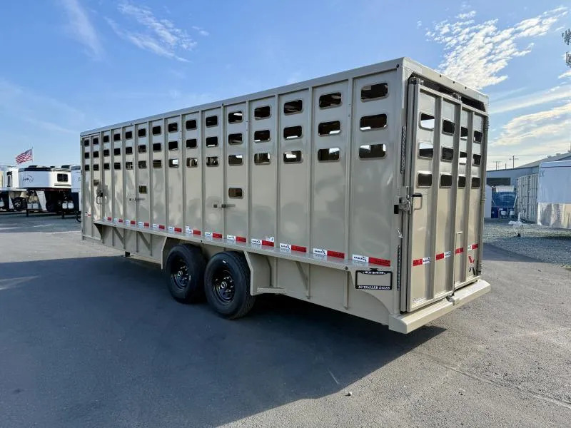 2026 EagleX 24’ GN Stock Trailer. * 6’8” Wide, 24’ Long, 7’ Tall * Powder Coated Steel 14 ga Walls * Punched Walls with 3 Vent Rows * 2” Smooth Rubber Floor with Last 4’ Cleated Rubber Floor * Brush Fenders * Tandem 7000# Torsion Axles * 14 Ply Radial Tires * 4 Wheel Electric Brakes * Spare Tire * 39” Side Escape Door * (2) Center Gates with External Releases and Hold Back Catches * Swing Calf Gates in Nose of Trailer * Interior Light on Exterior Switch * Rear Swing Gate with Slider * Interior Tie Loops * LED Lights * 2 5/16” Coupler Call D2 Trailer Sales 209-745-5480 or for more info www.d2trailersales.com
