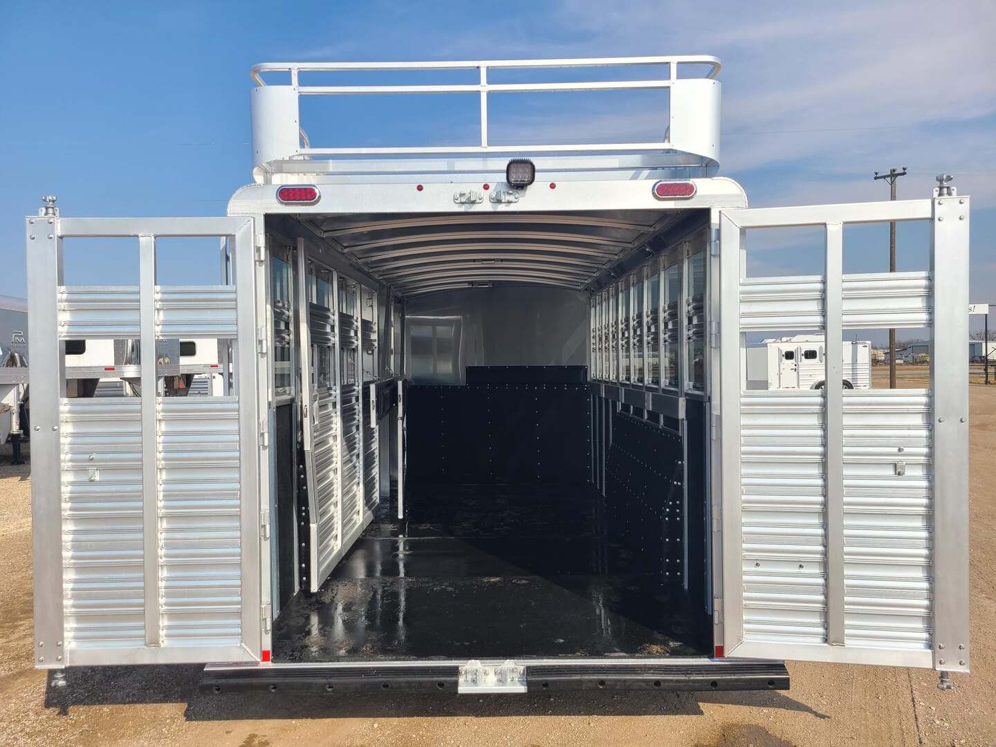 Platinum 22’ Stock Combo 7’6” x 22 x 7 tall Mill Finish exterior skin Aluminum mag wheels Extremely versatile trailer!! 1st gate is horse divider with removable panel at bottom 2nd gate is normal horse divider 3rd gate is slatted center partition, keep horses and cattle separate!! Haul roping steers & 3 horses Haul 6 horses, 8 cows, haul whatever!! Plexiglas & Track on both sides of trailer Rubber in between wall studs on both sides 6’ hay rack & ladder 6 saddle racks, 13 bridle hooks, and 4 blanket bars in tack room!! 3 tier swing out saddle rack keeps all of your tack easily to grab!! Carpeted bulkhead wall to protect your gear Rubber mats in 30” dressing room floor for easy cleaning One brush tray and five hooks on tack door Stainless steel nose with Mill Finish exterior skin Double rear gates with double anti rack hardware Stock escape door on driver side 3 LED load lights and plenty of outside tie rings Two roof vents for maximum ventilation!! Ready for anything!!!