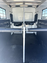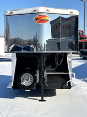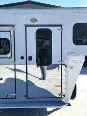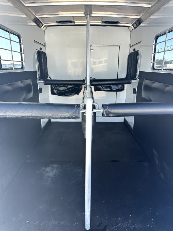 Horse Area - rubber mats, kick pads, padded solid swinging removable divider, removable head divider, 2 drop down windows w/ folding faceguards and nylon covers, 2 escape doors, rear load ramp, nylon hay bag mangers, walk thru door to dressing room, 2 tie rings per stall, 2 pop up roof vents, lined & insulated walls, padded chest & butt bars, interior load light.