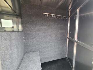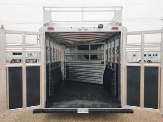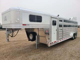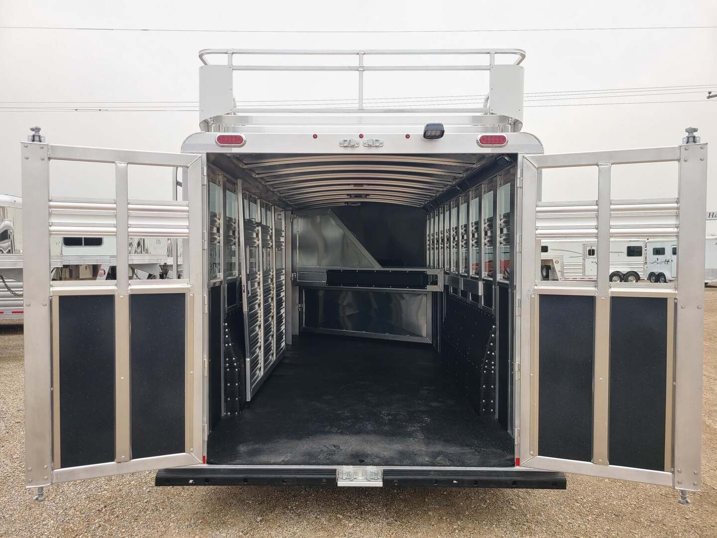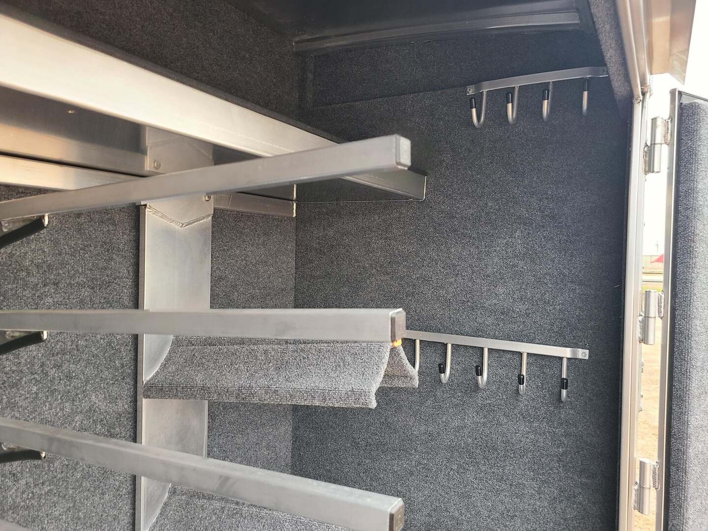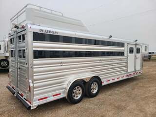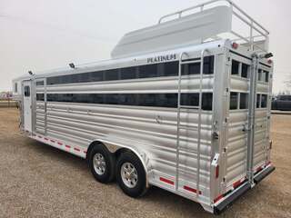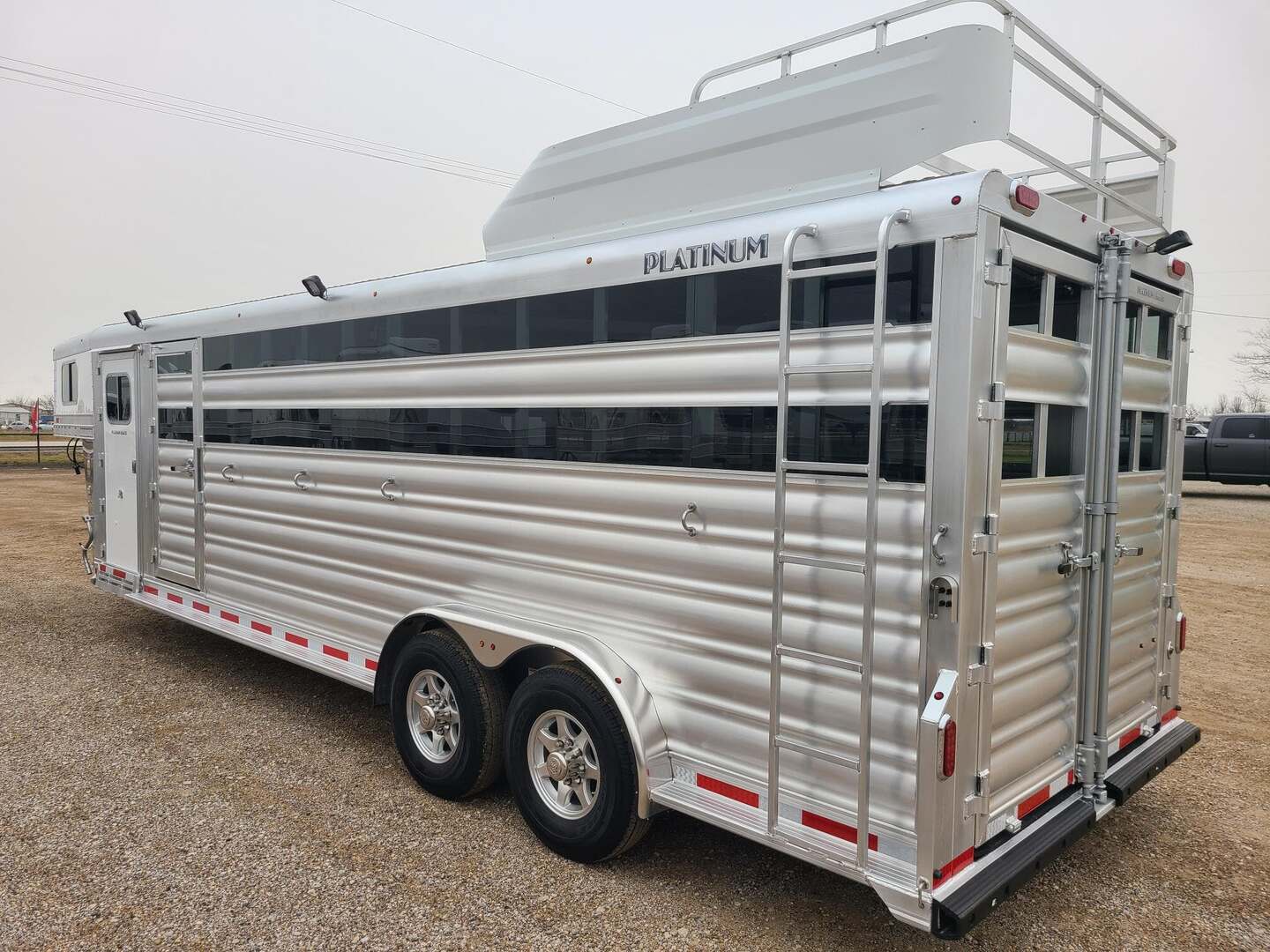 THIS TRAILER IS ON ORDER AND WILL ARRIVE IN FEBRUARY Platinum Coach 6 horse Perfect Trainer / Side Tack!! 7’6” wide x 25’ long x 7 tall Side tack with 6 saddles, 6 bars, 4 brush trays, 30 bridle hooks!!!! Dressing room with boot box, carpet on walls, and hooks on center wall Clothes rod in dressing room nose area, curb side Full width shelf above saddle racks & blanket bars Plexiglas & Track on driver and passenger side, not rear gates Horse divider in first stall with removable baby panel Horse divider on second stall Center gate on third section...haul three behind center gate Glued stall mats on driver and passenger side 3 two-way roof vents in horse compartment...MAX AIR FLOW!! Flow through steps for side tack and dressing room 6’ hay rack 7 round LED clearance lights on top rail 5 LED load lights 7000# axles & 10 ply tires Aluminum 16” wheels Stainless Steel on Nose White Exterior Skin