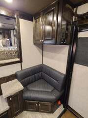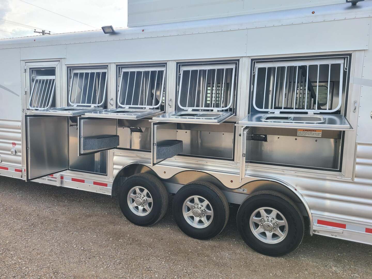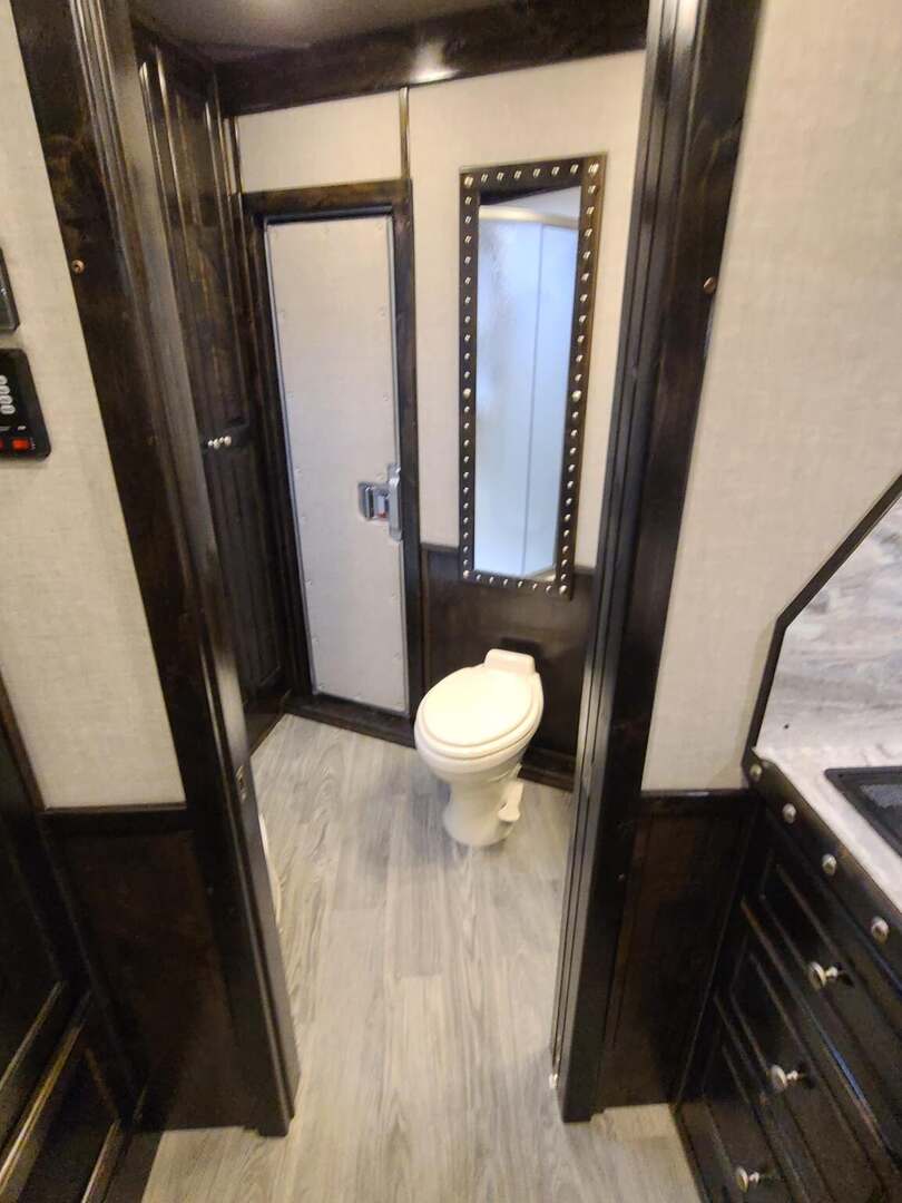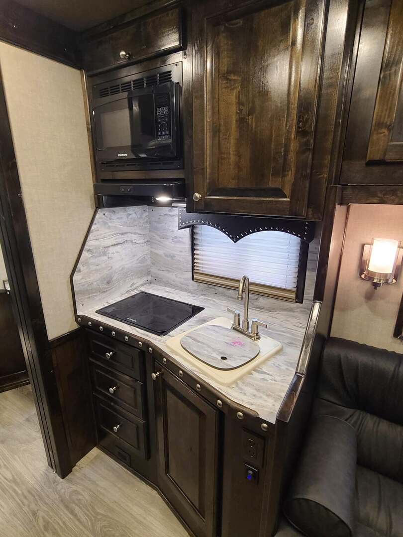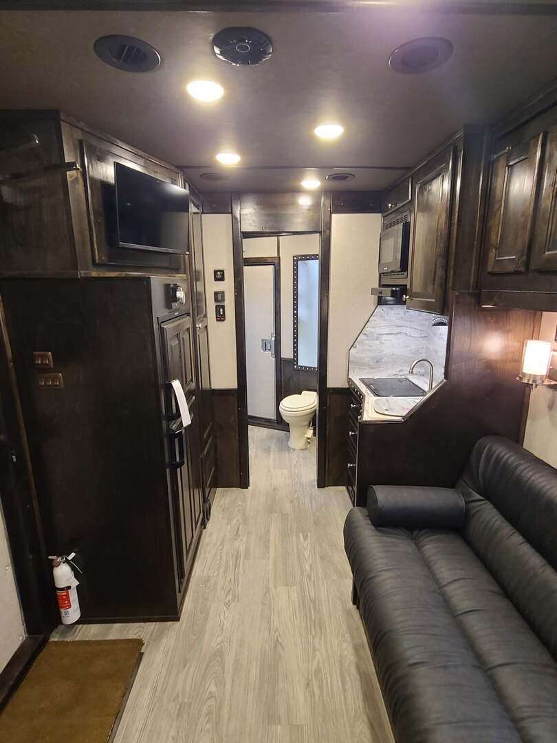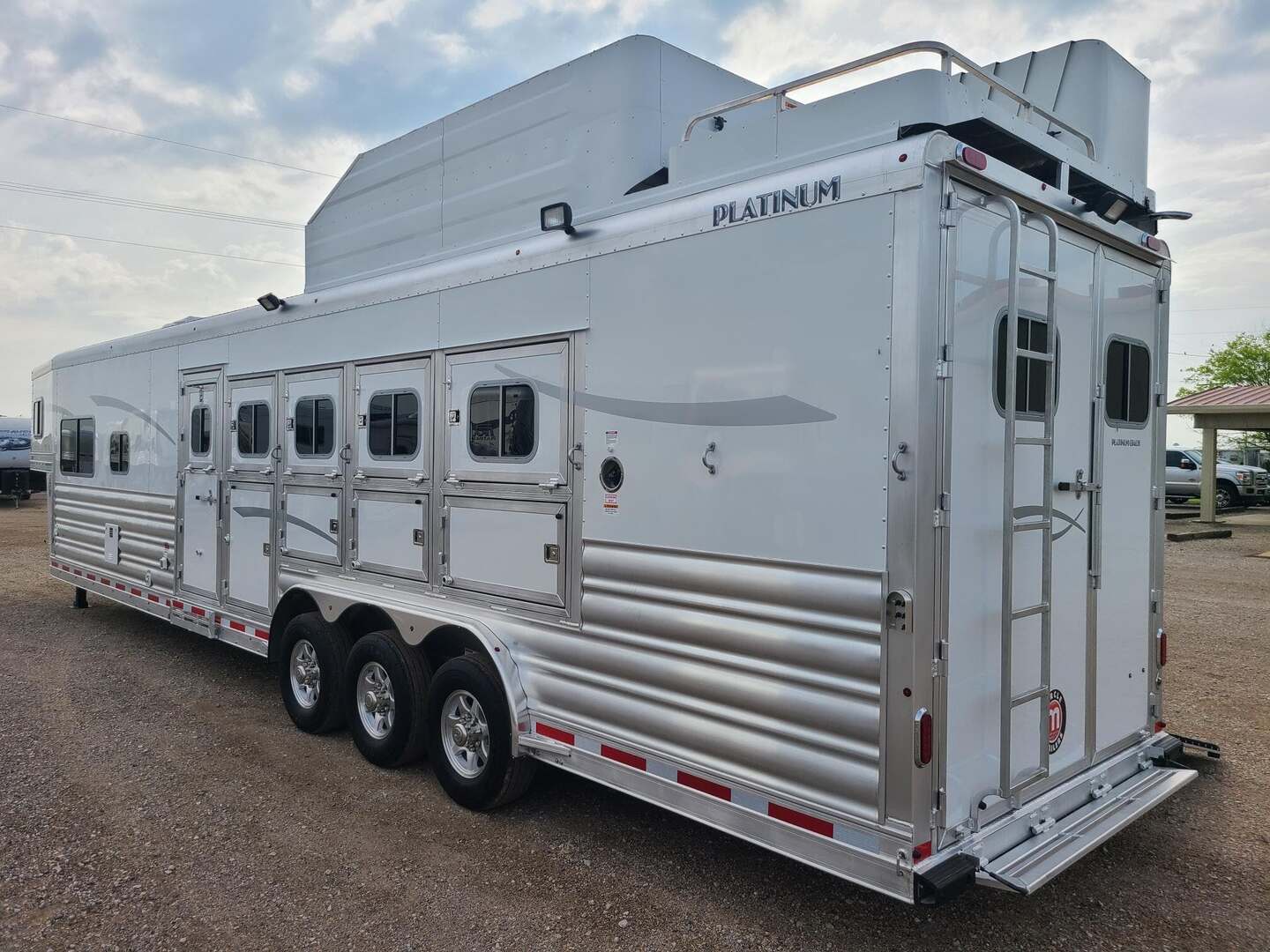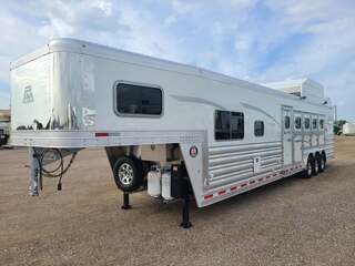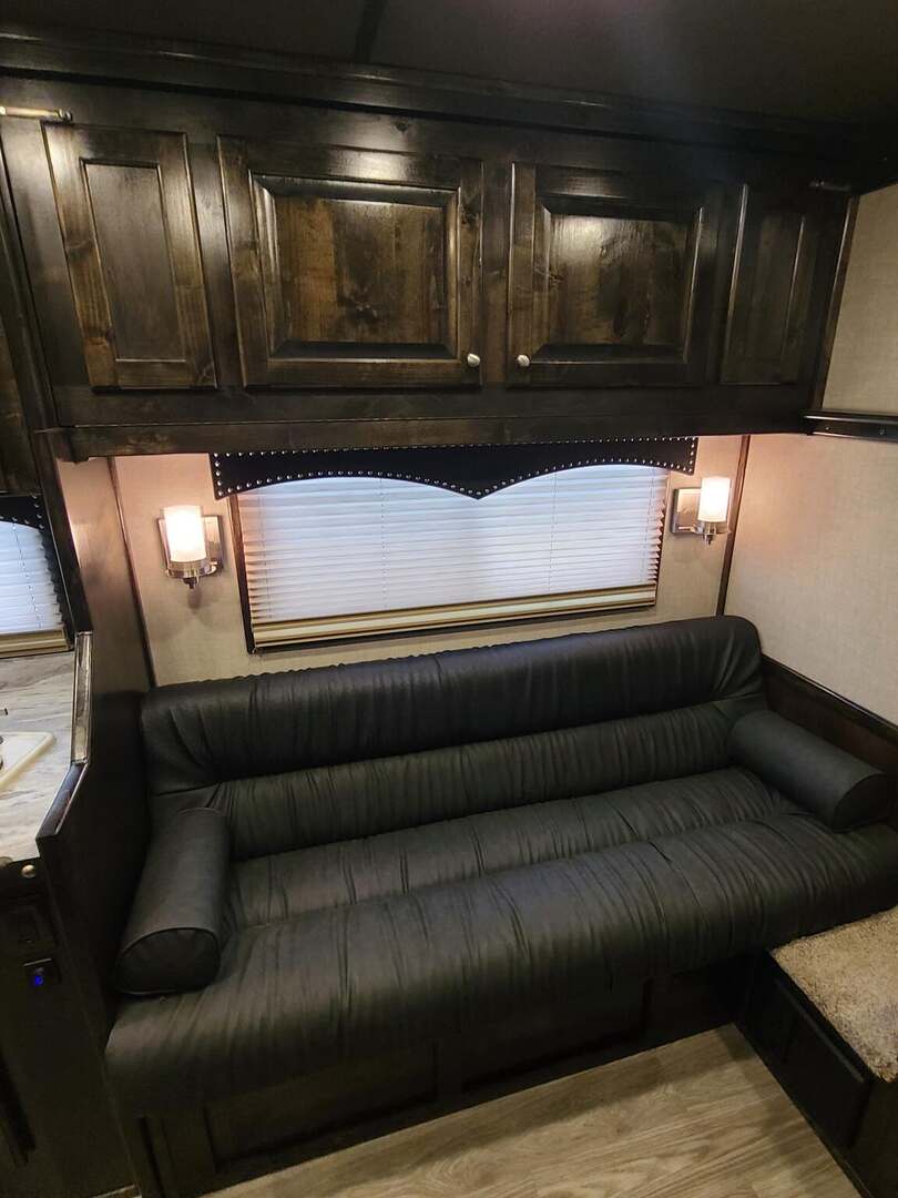 THIS TRAILER IS ON ORDER AND WILL ARRIVE IN MAY Platinum Coach 5 horse with 12’10” Proline XP by Outlaw Conversion  Proline XP by Outlaw Conversion features: Onan 4.0 generator with fuel tank behind saddle rack Flip down bunk over sofa, with corner bench...sleep 4 or 5! Two burner glass top cooktop Microwave with built-in vent hood Sinks in kitchen and bath 15,000 BTU A/C with HEAT PUMP 20,000 BTU furnace 6.0 propane / electric refrigerator 6 gallon water heater, 12V DC or 110V AC 60 gallon water tank Two 24” Smart TV’s one in living, one bed area AM/FM/CD/DVD player with 2 exterior speakers 14’ Dometic power awning with aluma guard cover 32” radius shower with power vent overhead Toilet in front of vanity / sink area Large closets in living and bath area 3 drawers under kitchen counter Two hat racks over door with sliding screen 24” walk through door to horse compartment Dual leg hydraulic jacks Double aluminum battery box Two 30# propane bottles Platinum Coach features: 8 x 35 x 8 tall Side load configuration LOADED rear tack, shelves, splint boots, EVERYTHING!! 4 mangers, escape door on first stall Drop down windows head and hip Drop down window bars on head side Flow through and spring-back dividers Stud divider on first stall 8’ enclosed hay pod  Three 8k axles, 14 ply tires, Aluminum wheels