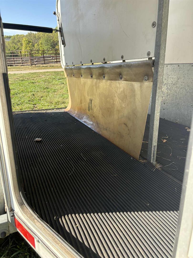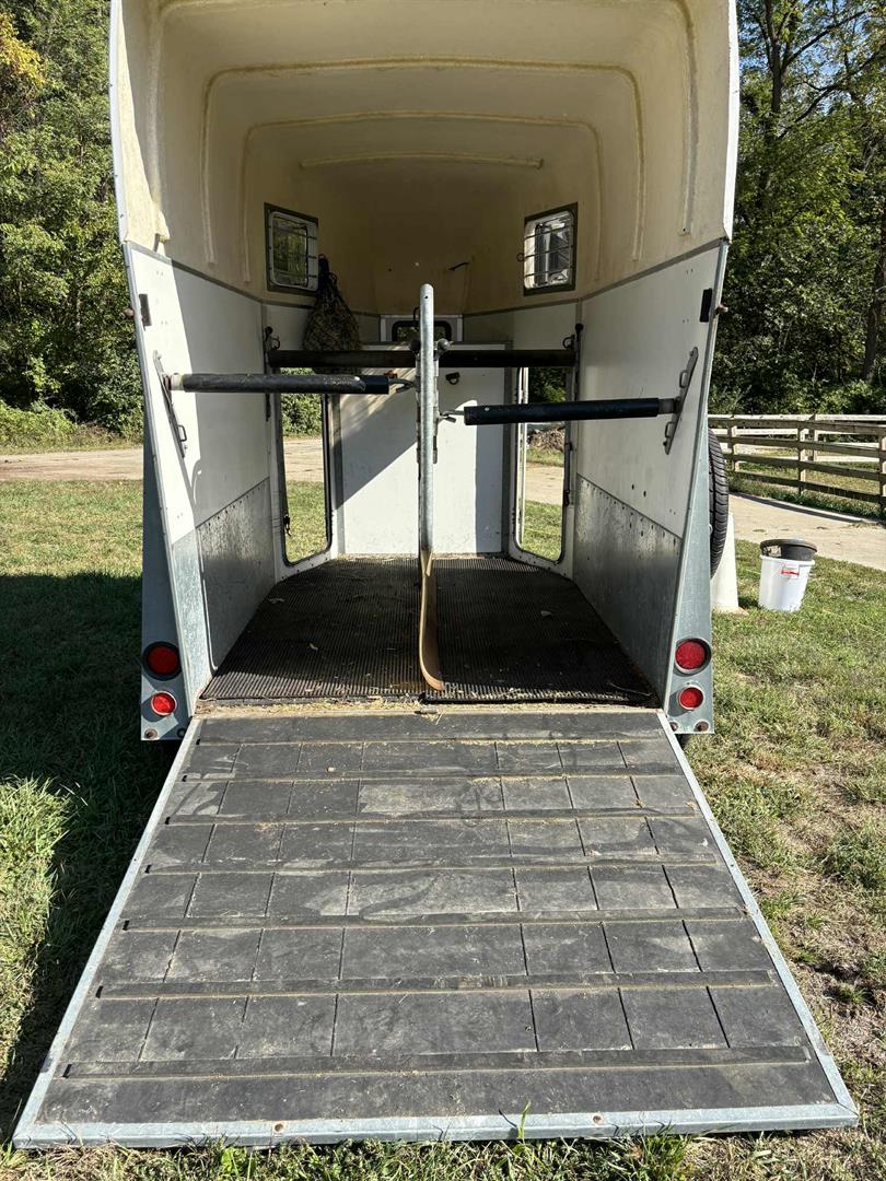 Horse Area: A straight-load, 2-horse trailer designed for horses up to 17 hands. It includes a 5-foot tall easy-lift ramp, adjustable chest and butt bars, a removable head divider, and 5-way opening windows for ventilation.