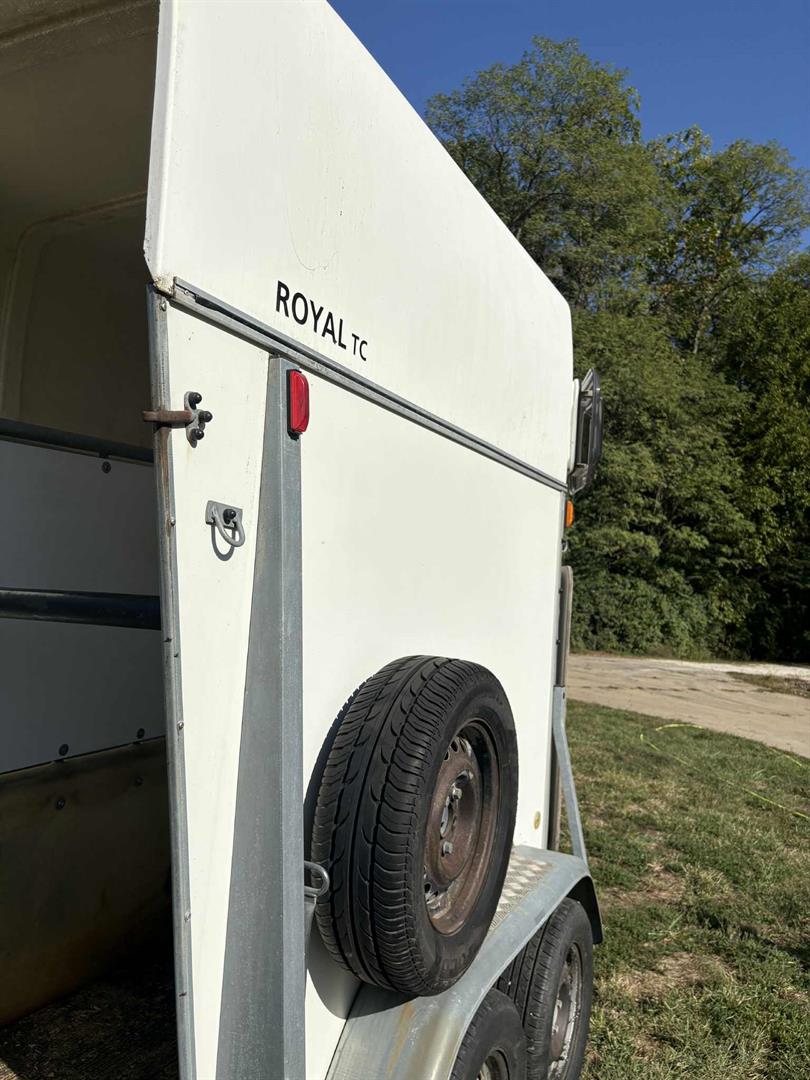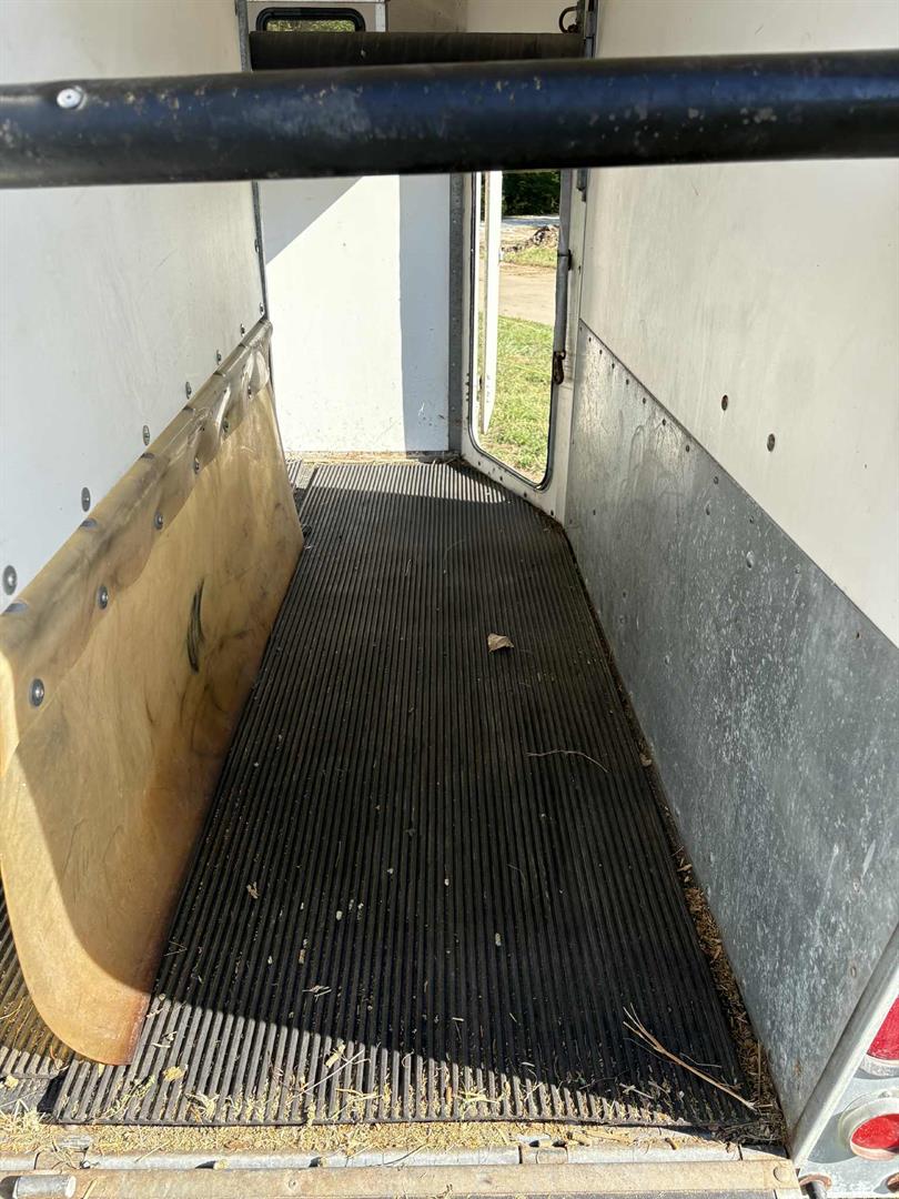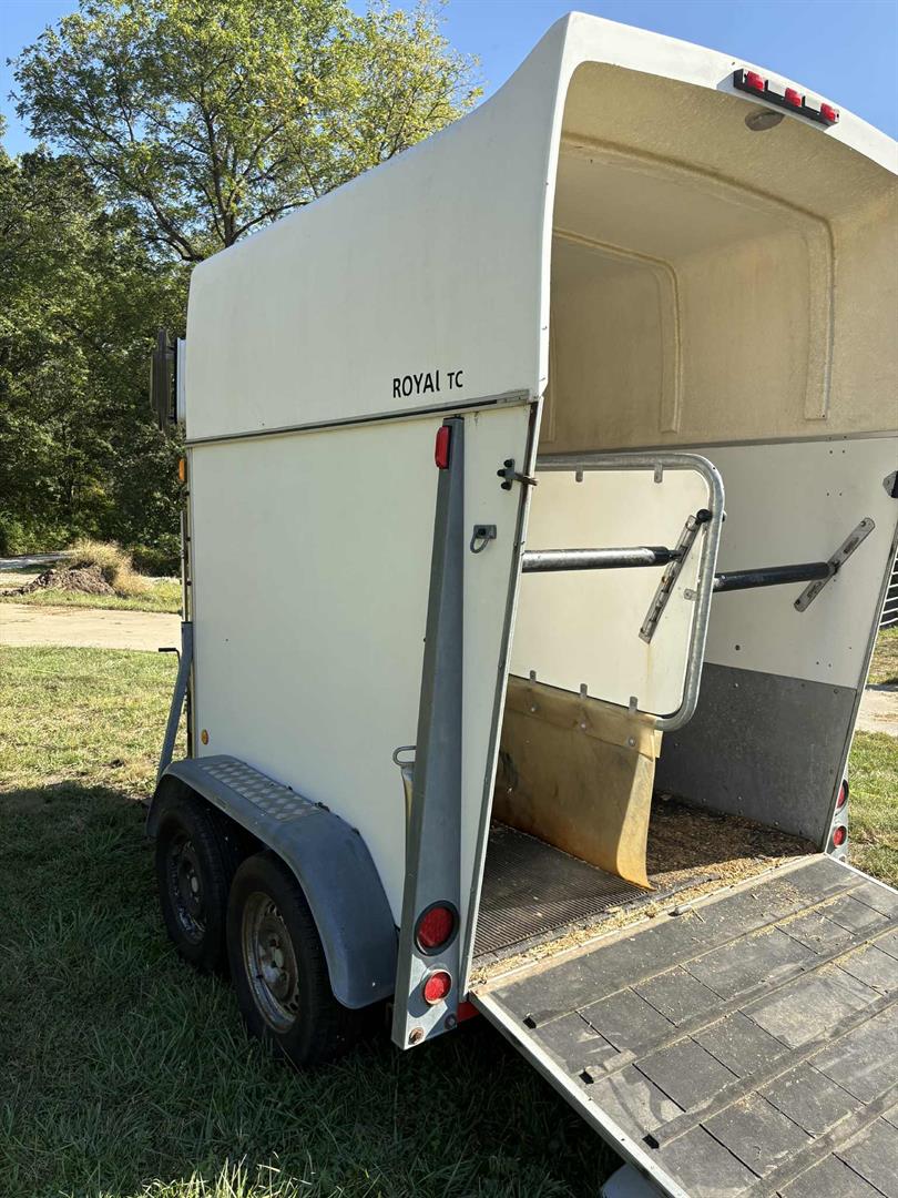 2,000 kg). This two-horse bumper pull trailer has an empty weight of approximately 1,950 lbs, providing a cargo capacity of over 2,400 lbs, and features inertia brakes that do not require a controller.