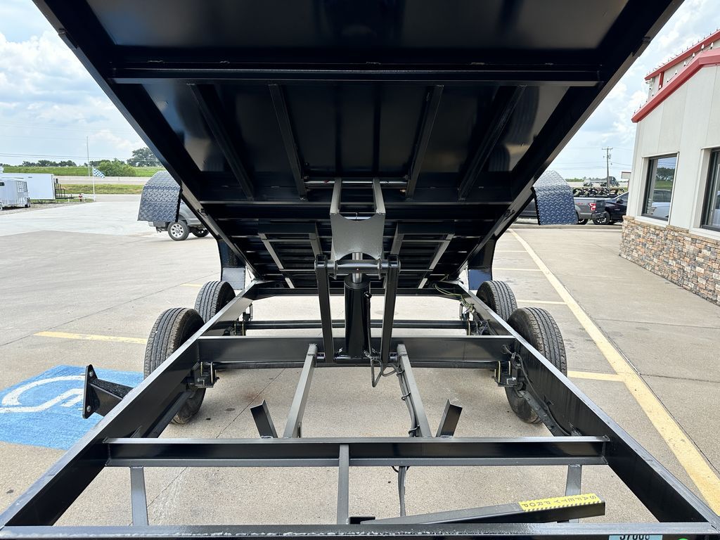 83 in x 14’ Tandem Axle Dump Low Profile Frame Hand Crank Tarp 2 x 7,000 lb. Self Adjusting Brake Axles 2 5/16 in Adjustable EZ Latch Coupler 7K Drop Leg Top Wind Jack 6 in Channel Frame and Tongue ST 235 80 R16 in LR E (8 Hole) (10 Ply Radials) Lockable Pump and Battery Box Fully Self Contained Elec. Hyd. Scissor Lift Power Up & Down + Gravity Option Option To Gravity Lower To Save Battery Included 48 in Sides10 Gauge Steel Sides With Formed Channel Supports 10 Gauge Steel Floor 3 in x 2 in Tube Top Rail Diamond Plate Steel Fenders Barn Style Rear Gate (Spreader) 5 AMP On Board Charger 4 ½ in D Rings Rear Stabilizer Jacks 6’ 6 in Rear Slide Out Ramps LED Lights 3 Stake Pockets on Each Side (Accepts Board Brackets) 7 Way RV Plug Empty Weight 4,190 lb. G.V.W.R. 14,000 lb. Carrying Capacity 9,810 lb. 14.5 Cubic Yards Black