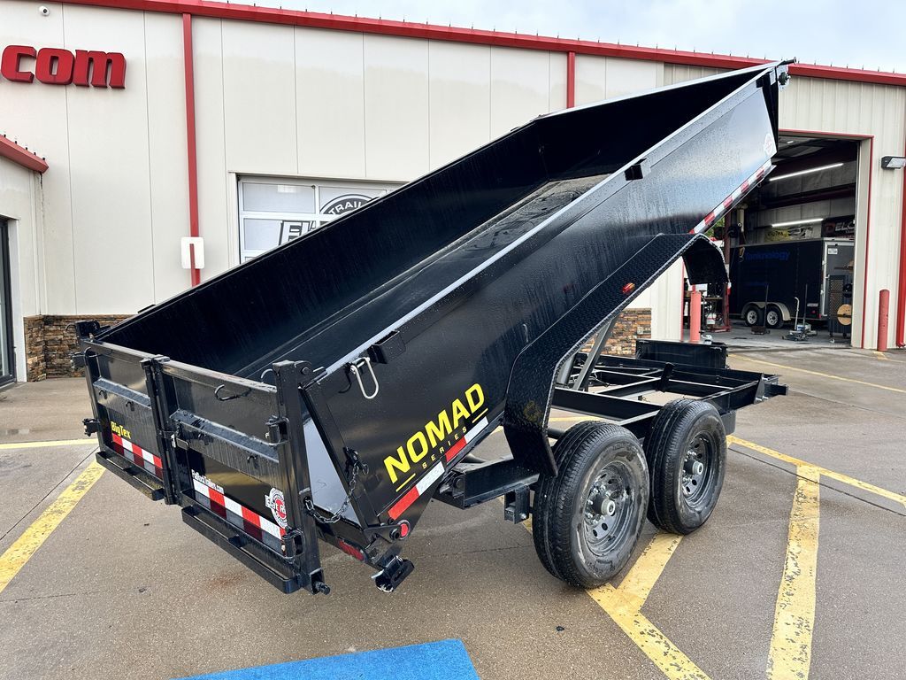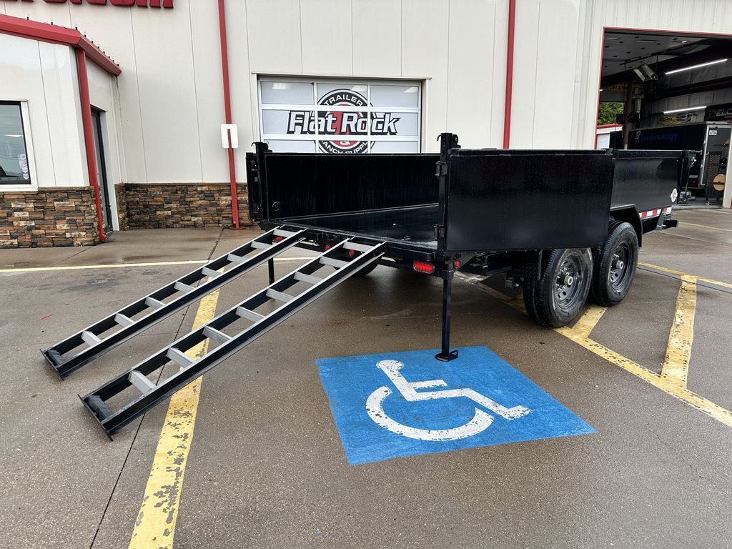 83 in x 14ft Tandem Axle Dump Low Profile Frame Hand Crank Tarp 2 x 7,000 lb. Self Adjusting Brake Axles 2 5/16 in Adjustable EZ Latch Coupler 7K Drop Leg Top Wind Jack 6 in Channel Frame and Tongue ST235 80 R16 in LR E (8 Hole) (10 Ply Radials) Lockable Pump and Battery Box Fully Self Contained Elec. Hyd. Scissor Lift Power Up & Down + Gravity Option Option To Gravity Lower To Save Battery Included 24 in Sides 10 Gauge Steel Sides With Formed Channel Supports 10 Gauge Steel Floor 3 in x 2 in Tube Top Rail Diamond Plate Steel Fenders Barn Style Rear Gate (Spreader) 5 AMP On Board Charger 4 x ½ in D Rings Rear Stabilizer Jacks 6ft 6 in Rear Slide Out Ramps LED Lights 3 Stake Pockets on Each Side (Accepts Board Brackets) 7 Way RV Plug Empty Weight 3,660 lb. G.V.W.R. 14,000 lb. Carrying Capacity 10,340 lb. 7.25 Cubic Yards Black