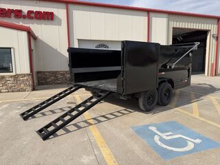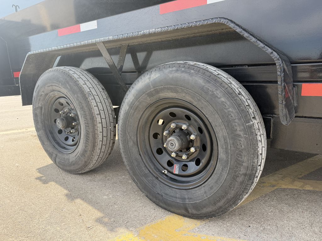 7’ x 14’ x 4’ Flare Side Dump Trailer 2 x 7,000 lb. EZ Lube 8 lug (Brakes on both axles) Heavy Duty Slipper Spring Suspension Tires: New ST235 80R16 LRE 10 Ply Radials) Main Frame: Full 6 in. channel Gooseneck Tongue: 8 in. Channel Risers and Beams Tilt Frame: 3 in. x 2 in. tubing Cross Members: 3 in. channel Bed Flooring: 1/8 in. thick sheet steel Bed Siding: 1/8 in. thick sheet steel Deck width: 82 in. Deck Length: 14’ Deck Height: Approximately 28 in. Side Wall Height: 48 in. Rear Doors: Double swing doors (open like barn doors) Battery: Group 24 deep cycle marine Pump: Electric over hydraulic (1.7 gpm) Controller: 15’ corded remote control Front locking toolbox contains battery and pump Hydraulics: Single 3 stage hydraulic cylinder (14,000 lb.) 2 5/16 in. Adjustable GN Coupler Two heavy duty safety chains Fenders: 14ga heavy duty tread plate Lighting: All flush mount or recessed lifetime LED Empty Weight 4,400 lb. G.V.W.R. 14,000 lb. Carrying Capacity 9,600 lb.