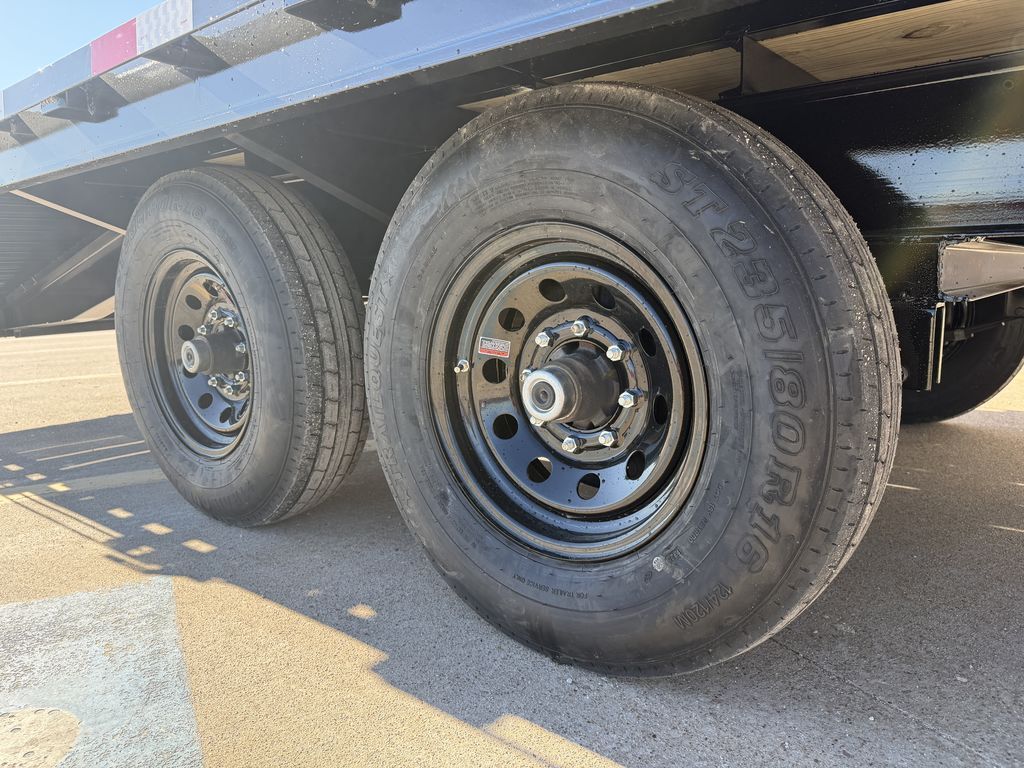 25’ Tandem Axle BP Single Deck Over (20’ + 5’) 2 x 7,000 lb. Electric Brake Axles 2 5/16 in Adj. Ram Coupler 102 in Overall Width 2 x 10K Drop Leg Jacks 8 in I Beam Frame and Tongue 3 in Channel Cross Members 6 in Tube w/ HD Rub Rail and Stake Pockets Mega / Macho Ramp System ST 235 80 R16 Load Range E Tires & Wheels Black Out Wheel Spare Mount All LED Lights Treated Wood 7 Way RV Plug Empty Weight: 4,500 lbs. GVWR: 14,000 lbs. Carrying Capacity: 9,500 lbs.