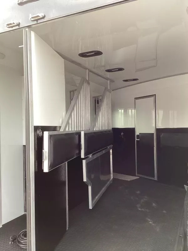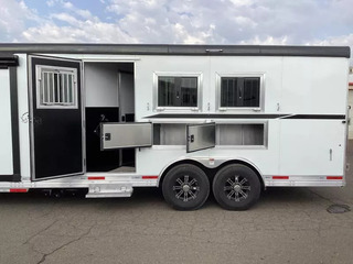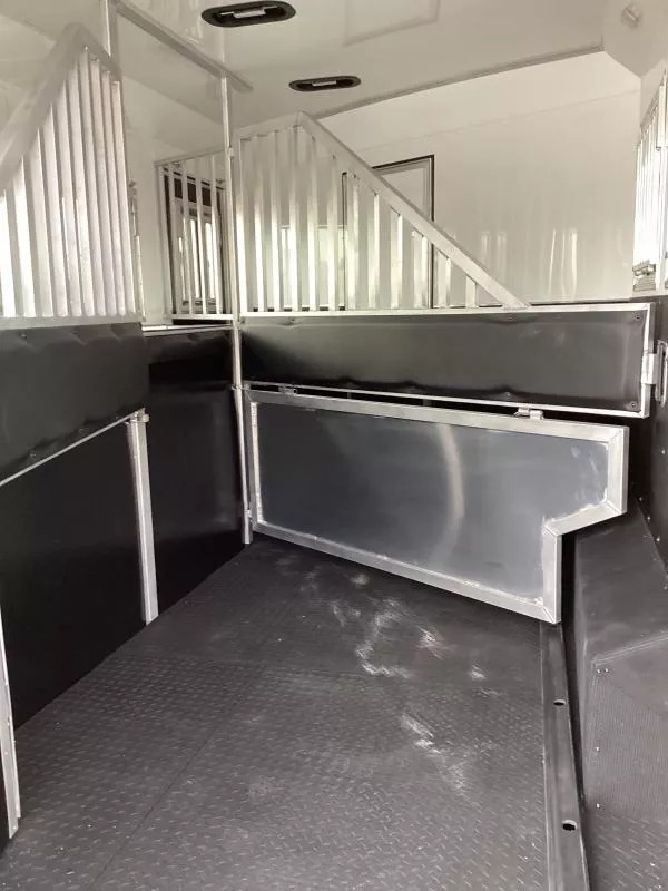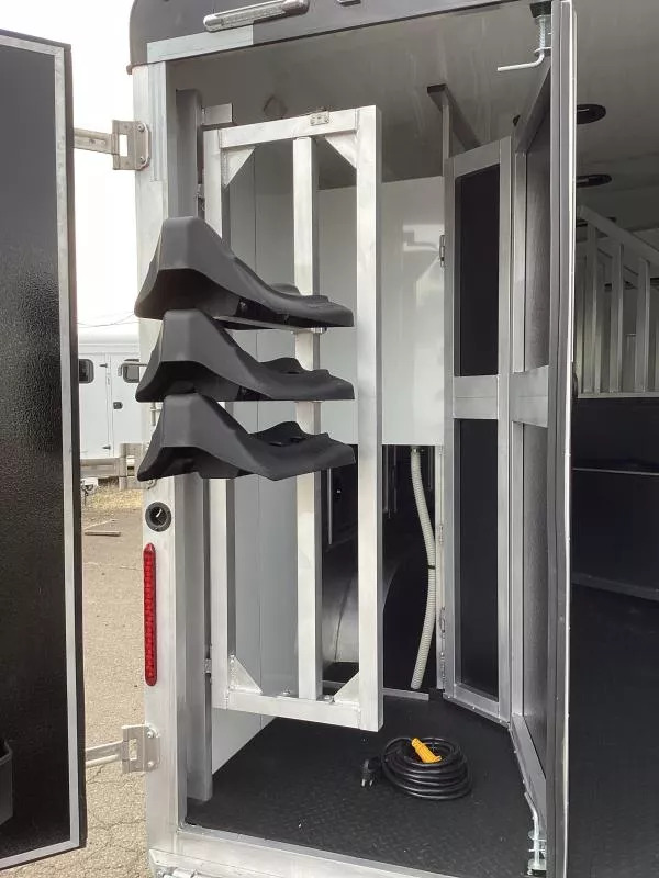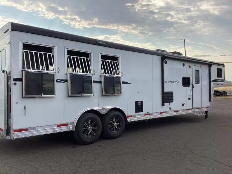 Introducing the Silverado aluminum frame luxury coach! Embrace the perfect balance of elegance and sturdiness as you embark on unforgettable journeys. With the Silverado’s superior craftsmanship and thoughtful design, you’ll experience the pinnacle of comfort and convenience, all while benefiting from its lightweight advantage. Welcome endless possibilities with the Bison Silverado - The Ultimate Companion for Your Travel Dreams. Upgrades: Aluminum Rear Ramp Dual Leg Hydraulic Jack Sofa & Dinette 32” LCD TV w/Locking Swing Arm Lined & Insulated Horse Area Ceiling Trailer Features: 8’0” Wide 7’ 4” Inside Height 30 Amp Service w/Detachable 30 Amp Power Cord 7000# Axles Exterior Water Spigot LED Exterior Lights (2) LP Tanks w/Dual Regulator Step at Entrance Door Spare Tire & Rim TV/Radio Antenna (2) Batteries-GRP 24 w/Shut-off White Exterior Powered Awning w/LED Light Strip Brite Nose-Front Panel Living Quarters Features: Chestnut Brown Interior Westport Mink Flooring Artist Maple Cabinetry Residential Faucets Roller Shades w/Valance Glass Shower Door LED Lighting Throughout Microwave Recessed Cooktop w/Range Hood Radius Shower w/Dual Control Handles 18,000 BTU Furnace Refrigerator Shirt Closet Sink Covers Skylight in Shower Stainless Steel Kitchen Sink 6 gal. DSI Water Heater Gas 15,000 BTU A/C, Ducted- to Horse Area Stereo w/Interior & Exterior Speakers Bunk Privacy Curtain Cable Inlet Countertop Extension Porcelain Toilet Queen Mattress w/Bed Sheet Horse Area Features: 3-Way Switch for Horse Area Heavy Duty Drop Down Windows Head & Tail Side 60/40 Rear Load Doors Aluminum Air Flo Dividers (4) Load Lights RV Door Latch at Escape Door Step at Escape Door Heavy Duty Kick Wall & Horse Door Liner Mangers Stud Wall Tack Area Features: Swing Out Saddle Rack - Adjustable tiers Bridle Hooks Brush tray Light ** Descriptions Subject to Error** For more information on this trailer please contact Double J Trailers at 541-812-1234. Thank You! Financing available to qualified buyers! All trailer prices are cash prices. Thank you! Trades Welcome Two Lots To Better Serve You! Woodland Washington & Albany Oregon We have over 250 trailers in stock. Please view our entire inventory at [www.double-j.com](http://www.double-j.com/) thank you! *Double J imposes a surcharge of 3% on credit card purchases of amounts greater than $500*