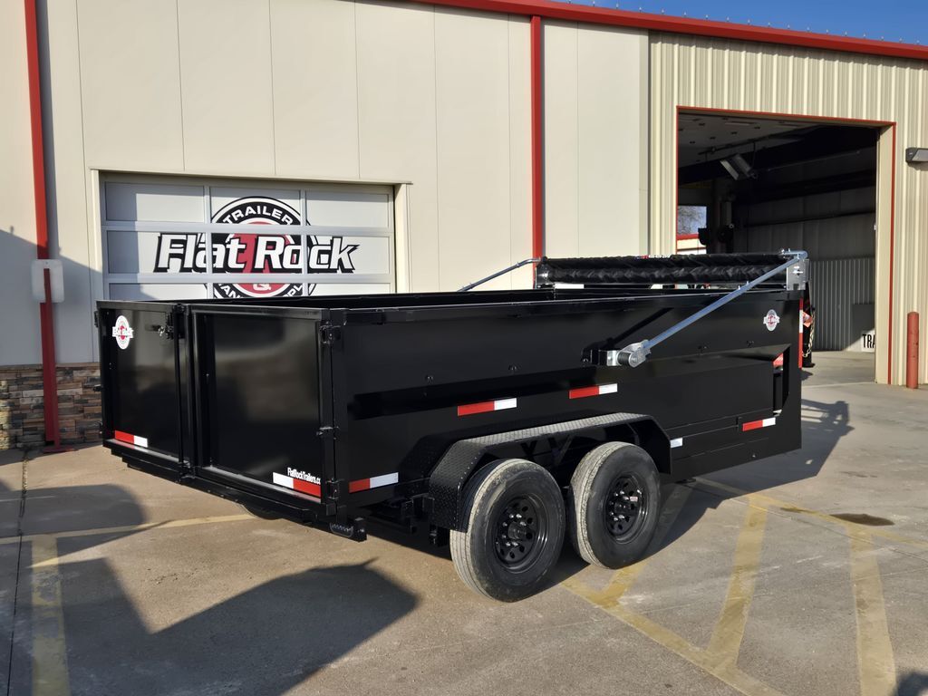 7’ x 14’ x 3’ Flare Side Dump Trailer (+/ 12 Cubic Yards) 2 x 7,000 lb. EZ Lube 8 lug (Brakes on both axles) Heavy Duty Slipper Spring Suspension Electric Flip Arm Tarp Kit Tires: New ST235/80R16 LRE 10 Ply Radials) Main Frame: Full 6 in. channel Gooseneck Tongue: 8 in. Channel Risers and Beams Tilt Frame: 3 in. x 2 in. tubing Cross Members: 3 in. channel Bed Flooring: 1/8 in. thick sheet steel Bed Siding: 1/8 in. thick sheet steel Deck width: 82 in. Deck Length: 14 in. Deck Height: Approximately 28 in. Side Wall Height: 36 in. Rear Doors: Double swing doors (open like barn doors) Battery: Group 24 deep cycle marine Pump: Electric over hydraulic (1.7 gpm) Controller: 15’ corded remote control Front locking toolbox contains battery and pump Hydraulics: Single 3 stage hydraulic cylinder (14,000 lb.) 2 5/16 in. Adjustable GN Coupler Two heavy duty safety chains Jack on Gooseneck: 12,000lb spring loaded drop leg Fenders: 14ga heavy duty tread plate Lighting: All flush mount or recessed lifetime LED Empty Weight: 4,200 lb. G.V.W.R. 14,000 lb. Carrying Capacity: 9,800 lb.
