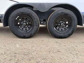 BUMPER PULL3.5K EZ LUBE IDLER SPRING AXLE & ELECTRIC BRAKE SPRING AXLE205/75 R15 (C) 6PLY TIRE WITH BLACK WHEELSPARE TIRE MOUNT2” 10K DEMCO ADJ CAST COUPLER2K TOP-WIND FLIP JACKWRAP TONGUE2’ DOVEPAIR OF SLIDE-IN RAMPSREMOVABLE ROUND DIAMOND PLATE TEARDROP FENDERSSTANDARD STAKE POCKETS5” CHANNEL FRAME24” CENTER-TO-CENTER CROSSMEMBERSRUB RAILTREATED YELLOW PINE FLOORWIRINGLED PACKAGEDECAL PACKAGELAMAR GRAY POWDER COATWeight: 2,375 lbs.