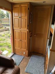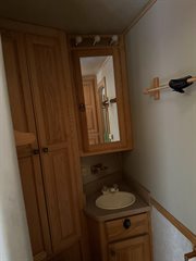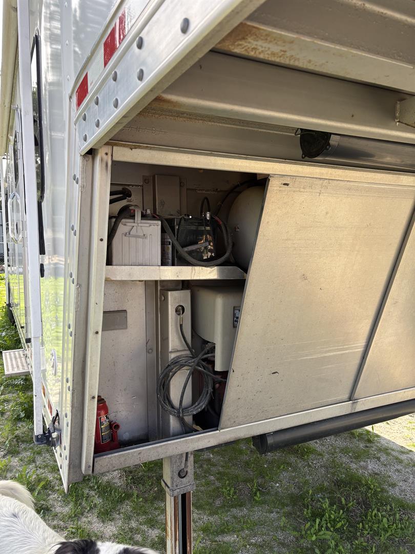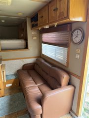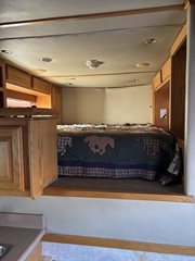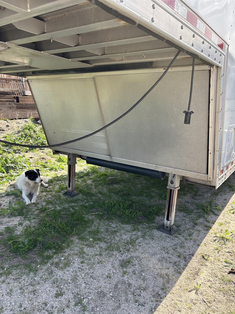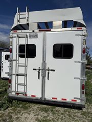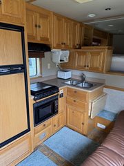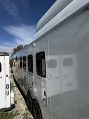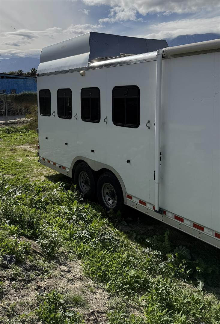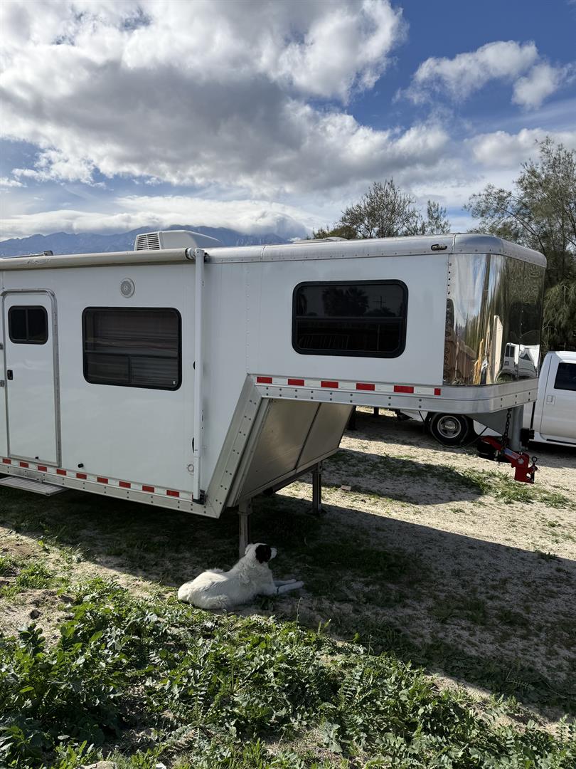 This 4-horse living quarters trailer sleeps 6. Queen size bed above, sofa pulls to a double, twin size bunk beds. Microwave, 3-burner stove, new air-conditioning unit, propane generator with its own tank. The trailer measures 7'5" floor to ceiling, 8'5-1/2" width, 32' floor length (including living quarters), 14' shortwall. Mangers, drop down windows with bars that also drop down. Hay storage above with attached ladder. Awning. Trailer is wrapped in a white irridescent film so it looks new and there's no waxing and polishing to be done. Located in Southern California.