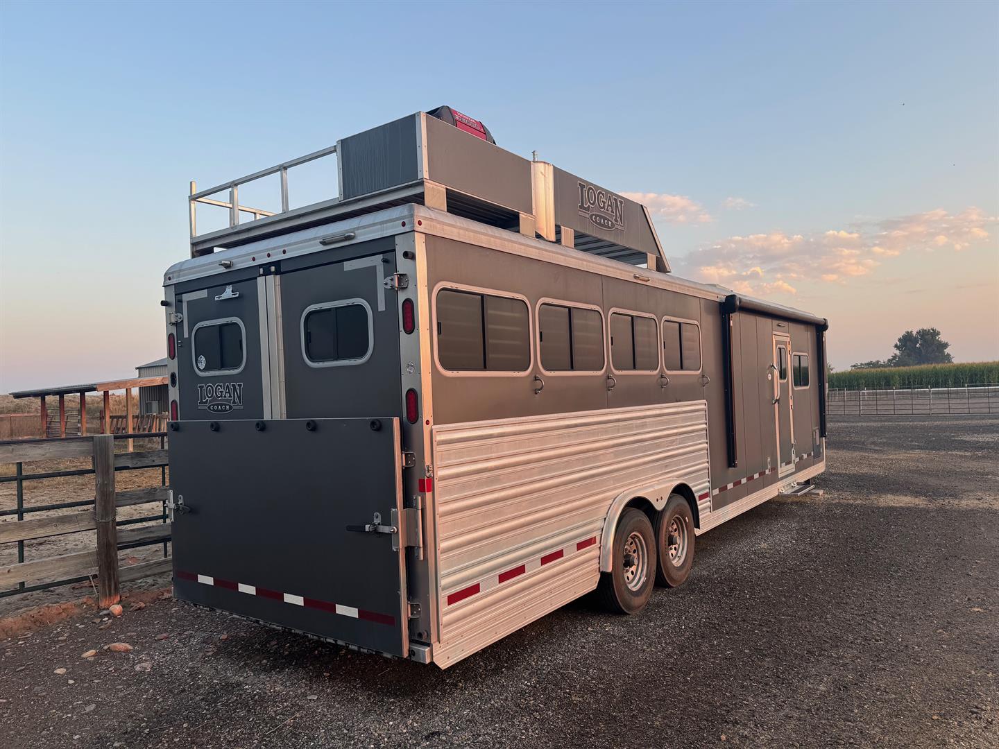 Keywords: toy hauler, camper, RZR hauler, golf cart hauler, gooseneck, living quarters trailer, LQ trailer, generator, slide out, Logan Coach, Riot, 4 horse trailer, Platinum 811, RV, off-grid camper, overlanding trailer