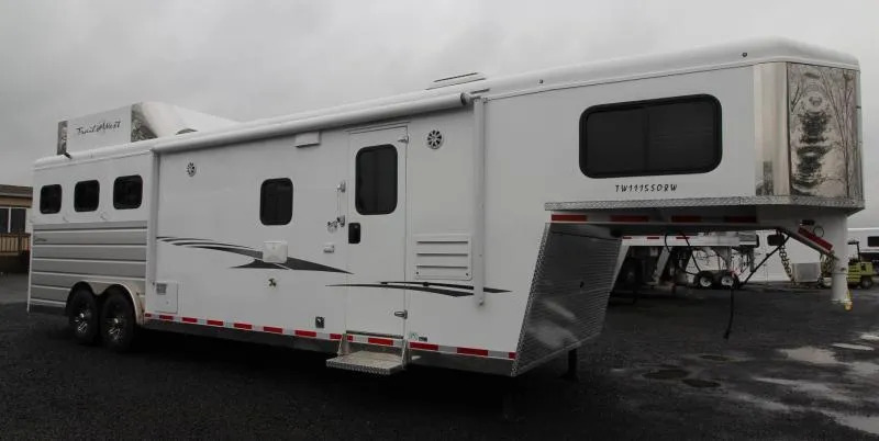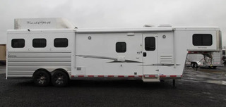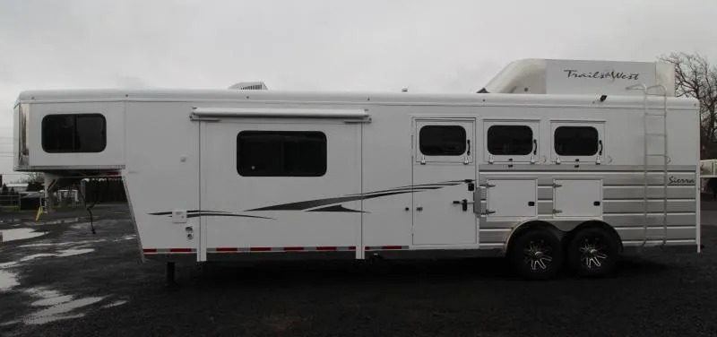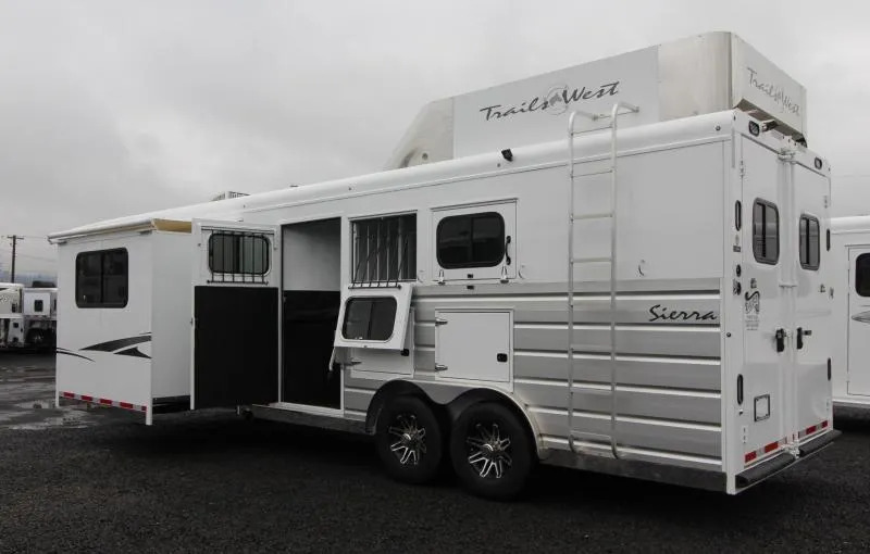 This trailer is in excellent shape looks new, Pictures are original pictures, updated pictures will be added soon. Overall, the trailer still looks new, minor wear in horse area. ** Trails West builds their horse trailers on solid Steel frames encased in Aluminum similar to the way aircraft and automobiles are manufactured, with strength and durability as their #1 goal. This hybrid process creates a safer and stronger trailer making it more resilient to the stress and flex naturally caused by travel. Trails West uses .050 Aluminum sheets on the outside of each of their horse trailers. They coat these sheets with Automotive Primer and .03 mils of polyurethane paint, which produces a high gloss, automotive quality finish. The trailers are washed easily with soap and water; no need to use cumbersome acid washes ** Trails West Living Quarters are beautiful top quality must see trailers! Financing and nationwide delivery available! Trades welcome! 2019 Trails West Sierra 3 Horse 11’ x 15’ Living Quarters with lots of Upgrades such as Slide-out, Fold-up Rear Tack, Mangers, Hay Rack & Ladder, Upgraded 8 cu.ft. Refrigerator and Power Awning Upgrade, Convenience Package, 3 Burner Cooktop w/ Oven and much more! *UPGRADED KICK WALLS TO PUCK BOARD* STANDARD TRAILER FEATURES: Steel Frame Aluminum One Piece Aluminum Roof 7’6” Tall 8’ Wide 9685 lbs Dry Weight LED Lights Tandem 7000# Rubber Torsion Axles ST235/85R16 LRG Spare Tire 4 Wheel Electric brakes Dual Batteries Dual Propane Tanks UPGRADED Power Awning Aluminum Tread Brite Enclosed Front Mangers with Storage (Upgrade) Hayrack and Ladder (Upgrade) Gas Generator READY (Upgrade) SLEEPING QUARTERS FEATURES: Full-size Bed Fully Insulated Floor, Roof and Walls Soft Touch Ceiling Recessed Lighting Bench with Step Wardrobe Closet Dinette converts to a Sleeper Removable Table Day/ Night Shades Roll Out Screen Door GALLEY FEATURES: Large Refrigerator Convection Microwave 2 Burner Cooktop Flip up Countertop Extension Single Basin Sink Vinyl Floor with Wood Print Throughout Wood Trimmed Cabinets and Countertop WATER/ELECTRICAL FEATURES: 48 gal. Fresh Water Tank 28 gal. Black Water Tank 28 gal. Gray Water Tank 6 gal. DSI Water Heater Water Heater Bypass 18,000 BTU Furnace Smoke Detector Fire Extinguisher L.P. Detector Exterior 110V Outlet UPGRADE Exterior Shower UPGRADE Exterior Water Spigot UPGRADE Exterior Speakers UPGRADE Water Heater Bypass BATHROOM FEATURES: Large 36” x 40” Shower with Glass Door Shower Dome Sky Light Sink with Vanity and Mirror Fresh Water Flush Toilet Closet 12 volt Exhaust Fan Pass Though to Horse Area UPGRADE Shower Dome HORSE COMPARTMENT FEATURES: Puck board on kick walls in place of rubber mat Mangers with Storage Lined and Insulated Ceiling and Walls First Stall Escape Door With Drop Down Feed Door Triple Wall Construction Drop Down Feed Doors with Drop Down Face Bars Tail Side Slider Window with Screen per Stall and Rear Doors 2 Way Roof Vent in each Stall Interior Tie Rings Rotary Latch Divider with Recessed Latch Pocket Padded Jail Bar Dividers Gas Shock Divider Hold back Exterior Tie Rings LED Interior Dome Lights LED Exterior Load Lights Double Rear Doors STALL MEASUREMENTS: Pin to Pin Measurement: 40 1/2” Actual Stall Width: 32 1/2” Diagonal Divider Length: 130” REAR TACK ROOM: Swing out 3 Place Saddle Rack 25 Gallon Water Tank Dome Light Bridle Racks Mesh Door Organizer Swing-out Saddle Pad Rack PAINT & EXTERIOR TRIM: Anodized Extruded Aluminum Panels Exterior of Horse Area Phosphate Wash Polymer Coating Epoxy Primer Baked on Polyurethane Paint Stainless Steel Nose Aluminum Wheels LED Lights Load Light in Rear Exterior lights each Side of Trailer Hoof-Grip Easy Care Flooring is a high traction, shock absorbing permanent flooring. It will make your horses safer, more comfortable, and perform better, all the while enhancing the appearance and functionality of your trailer and saving you time and money on shavings and clean-up. Drain holes are drilled in the trailer floor and then the floor is coated with a sealant to prevent moisture from coming in contact with the trailer floor. Then 3/4” of previous rubber is trawled in to the trailer to create a permanent shock absorbent floor which lets urine drain straight through to the ground. No more shavings. No more slippery, heavy mats. No more muck. Manure can be shoveled out and then the remains can be easily rinsed out with a hose. NO MORE SHAVINGS IN YOUR HORSES EYES AND LUNGS. Hoof-Grip Easy Care Flooring reduces the impact and shock on horses’ hooves and legs, which means that even horses with hoof and leg soreness are more stable and comfortable. Since your horses don’t have to strain to maintain their footing, they can be more relaxed. And since Hoof-Grip Easy Care Flooring is a noise suppressant and heat barrier, the cooler, quieter ride will further reduce mental and physical stress normally associated with trailering your horses. ** Descriptions Subject to Error** For more information on this trailer please contact Double J Trailers at 360-225-1234. Thank You! Financing available to qualified buyers! All trailer prices are cash prices. Thank you! Trades Welcome Two Lots To Better Serve You! Woodland Washington & Albany Oregon We have over 250 trailers in stock. Please view our entire inventory at [www.double-j.com](http://www.double-j.com/) thank you! *Double J imposes a surcharge of 3% on credit card purchases of amounts greater than $500*