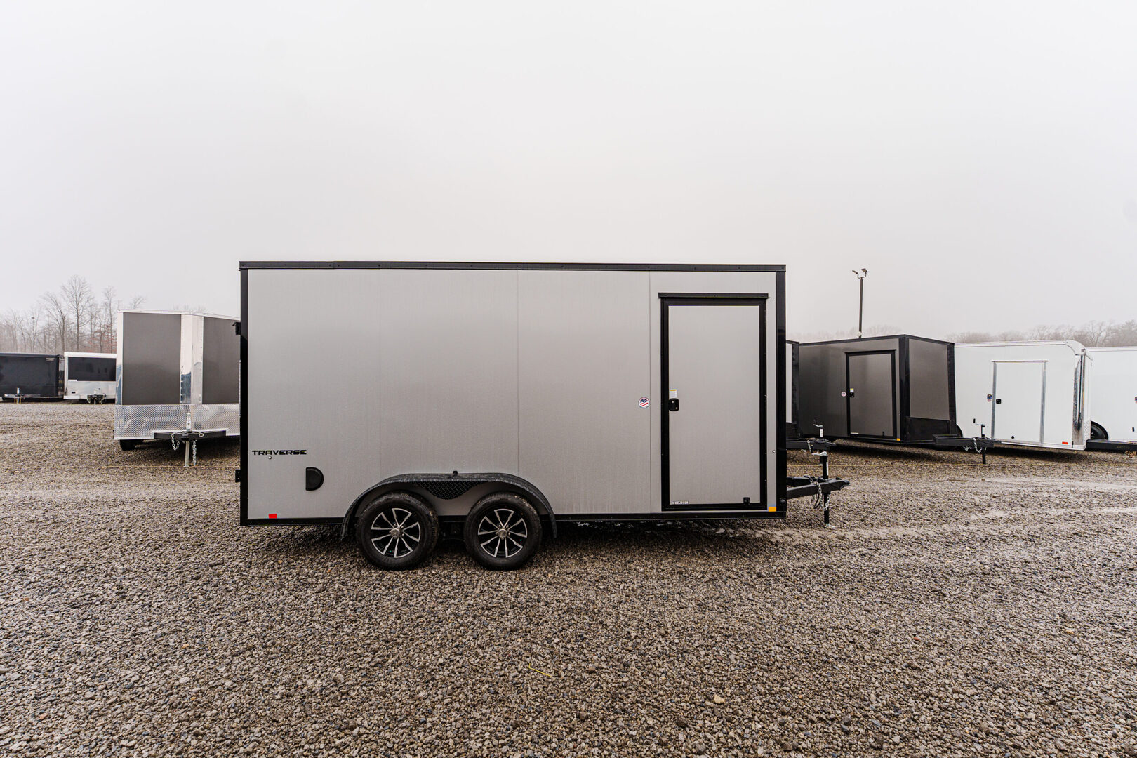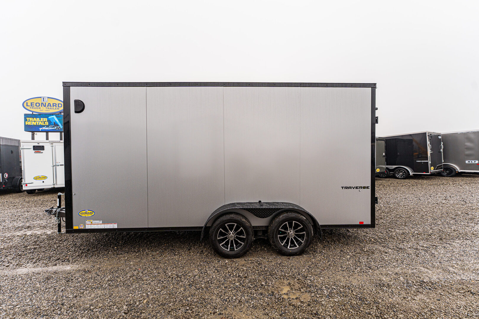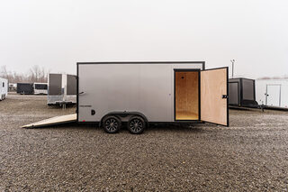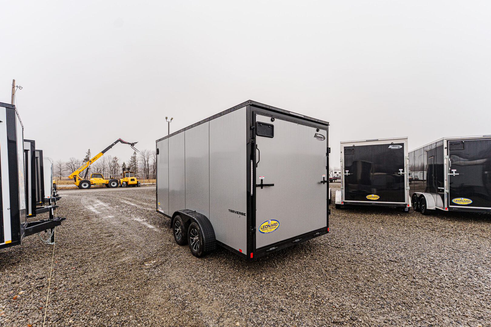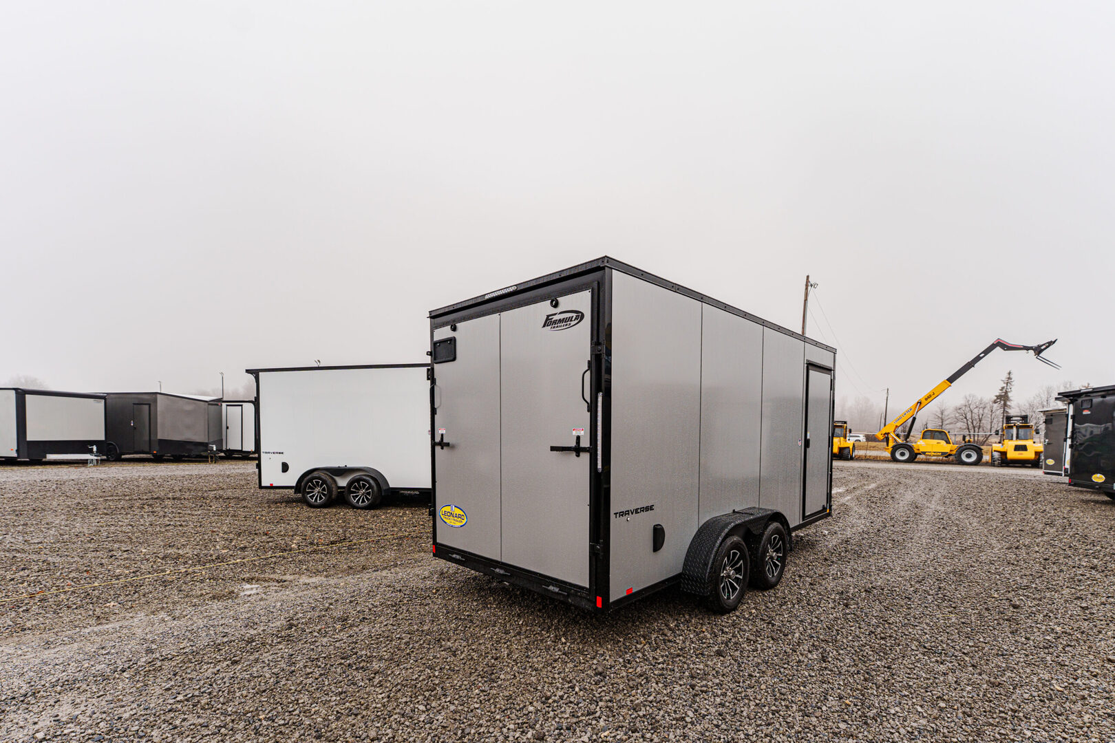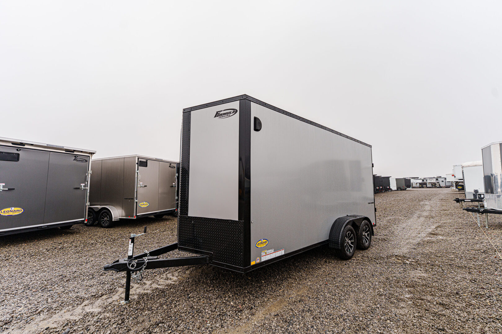 View Inventory: https://leonardtrailers.com/inventory/45798 Stock #45798 – New 2026 Formula 7 x 16 Traverse Enclosed Trailer Flat Top • 16” V-Nose • 7K GVWR (Composite Silver/Black Trim) Key Features 4” x 2” steel frame and tongue with 2-5/16” A-frame coupler DOT safety chains and 2K coupler-mounted jack Steel wall studs and roof bows (24” on center) 2,500 lb. ramp door with assist 36” side door with flush lock and plastic holdback Sidewall airflow vents Running Gear (2) 3,500 lb. drop spring brake axles with Easy Lube hubs Breakaway system: battery, switch, and lanyard ST205/75R15C tires on 15” steel wheels Exterior Composite silver/black trim Flat top seamless aluminum roof 24” ATP stone guard 1.5” bottom & 2.7” top extrusion trim Asphalt emulsion undercoating with polyethylene vapor barrier Semi-screwless color-matched fasteners Full LED exterior lighting Interior 84” interior height × 81” interior width Rear opening: 80” height × 77.5” width Engineered wood walls & transitions Lauan ceiling 3/4” engineered wood floor (1) LED dome interior light with 12V switch Round 7-pin blade connector Selected Options Upgrade to black aluminum wheel assemblies (ST205/75R15, 5-lug) Upgrade wall posts from 24” OC to 16” OC (4) D-Rings (5,000 lb.) with welded steel backers in corners High performance 12” × 3/4” ramp extension Warranty: Limited 3-Year Warranty We offer outstanding financing options and can arrange nationwide NO HASSLE delivery! Inquire today at (888) 333-6613. We believe these specifications to be accurate. Any discrepancies are unintentional. Please verify all information with a sales associate prior to purchase. Stock Number:45798