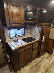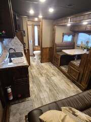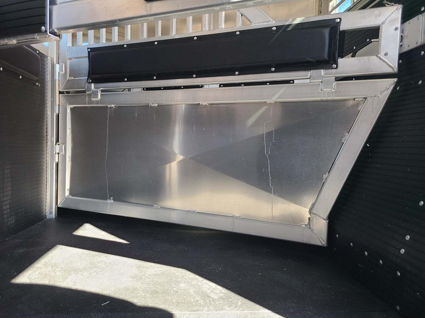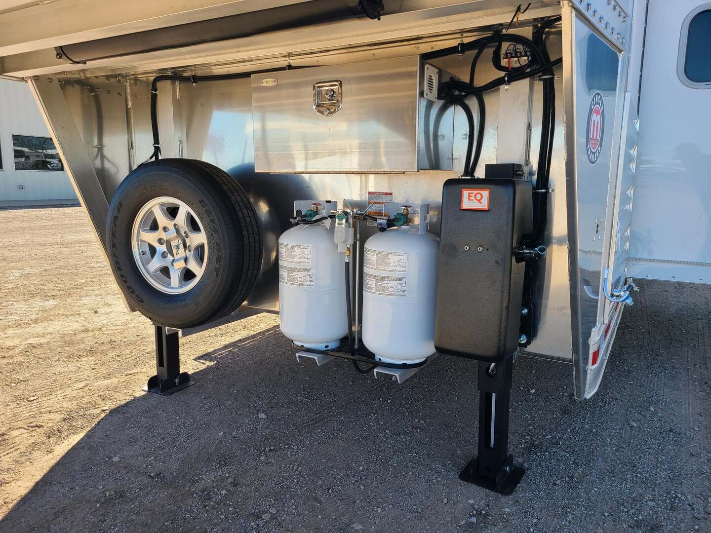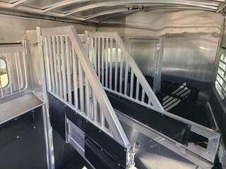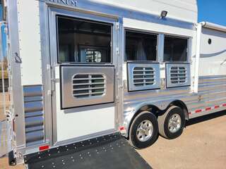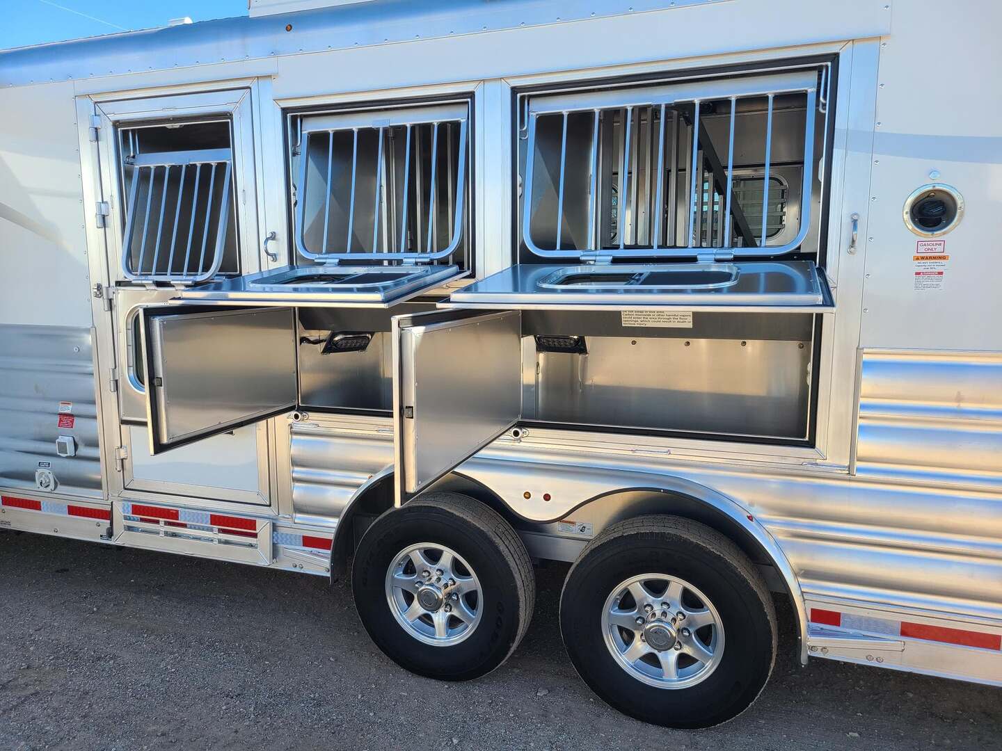 Platinum Coach 3 horse with 14’ Short wall Proline XP by Outlaw Conversions interior SLIDE OUT with 72” Sofa Sleeper and Dinette with SIDE LOAD Platinum Coach features: 8 wide x 30’ long x 7’6” tall 70/30 Rear Doors & SIDE LOAD 2 mangers with escape door at head Drop down window bars on head side Drop down windows on curb side 6’ hay pod & ladder 24” walk through door Baby panel on first divider Flow through and swing back dividers 2” Blocked axles for additional ground clearance 3 outside LED load lights 3 tier saddle rack, surrounded by 30 hooks!! 4 tier swing out blanket bar Flow through style steps 8,000# axles with 14 ply Goodyear tires on Aluminum Wheels Proline XP by Outlaw Conversion Features: 14’ short wall 72” Dinette in 6’ slide out Sofa sleeper at drop wall Enclosed bed for more privacy Dual-Hydraulic Jacks Dark Knotty Alder cabinetry Wardrobe in nose Onan 4.0 MicroQuiet generator on Platform 15,000 BTU A/C with heat strip 20,000 BTU furnace Electric power awning...NICE!!! 6 gallon hot water heater with Propane heat 60 gallon water tank AM/FM/CD/DVD player with 2 interior and 2 exterior speakers 24” LED Smart TV over fridge on door with locking arm 24” LED Smart TV in bed area Almond kitchen sink &  bronze faucet 2 Hardwood hat racks over R/V door 6.0 refrigerator Glass cover 2 Burner cooktop Microwave oven with vent hood Extra wide pocket door to bathroom 32” radius shower w/ bronze glass door & vent overhead Porcelain toilet with foot flush Mirror next to walk through door