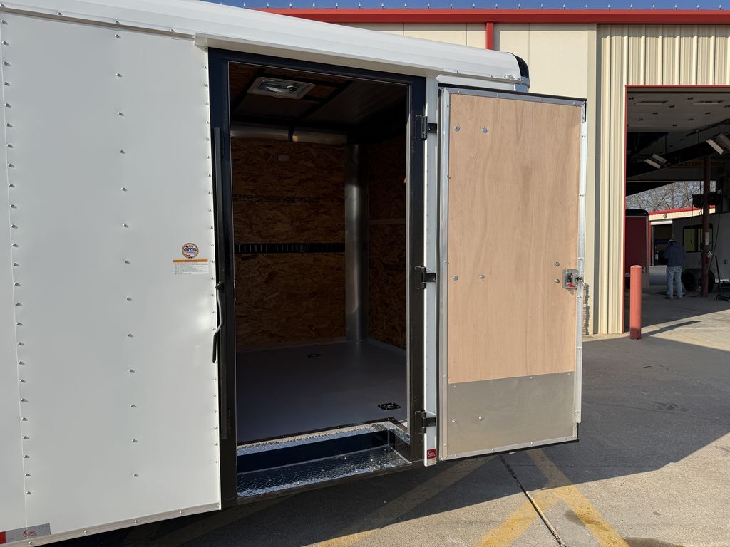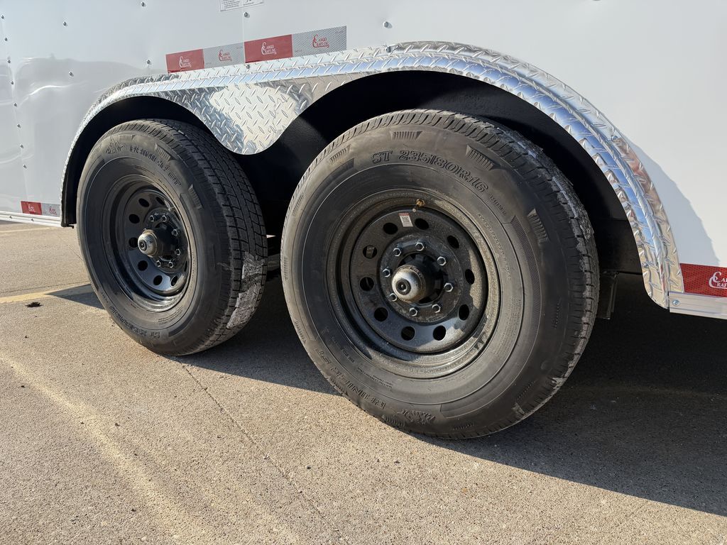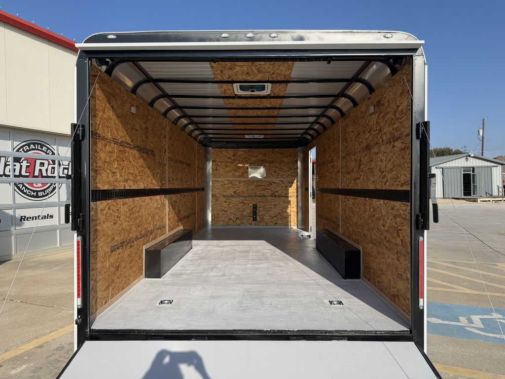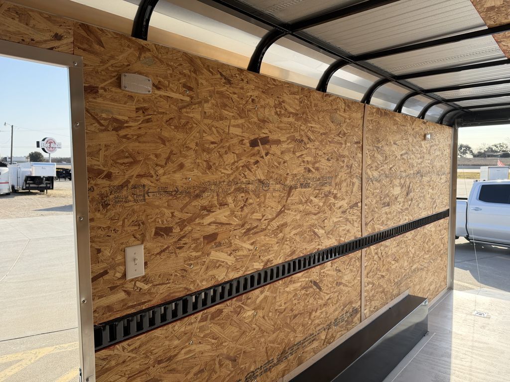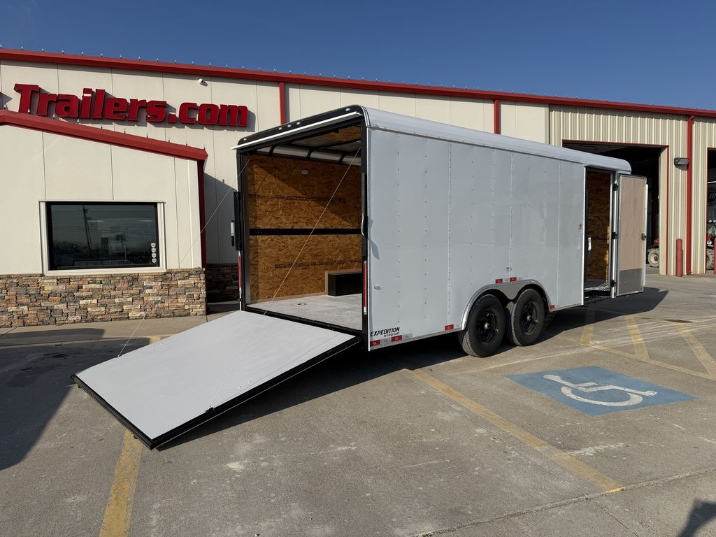 8.5’ x 20’ 14K Cargo Trailer Expedition Series 2 x 7,000 lb. Brake Axles Triple Tongue w/ Extended Hitch 16 in ATP Stone Gaurd ATP Corner Post Covers 3 x 12V Dome Lights w/ Wall Switch Recessed Tail Lights Metallic Silver Trim Package Curved Roof System 2 5/16 in Coupler 235 80 R16 in Radials 7K Drop Leg Jack Smooth Aluminum Fenders 7’ Interior Height E Track Spare Tire Rack 2 Non Power Roof Vents Spring Assist Rear Ramp Door 36 in Side Door w/ RV and Cam Bar Lock Built in Step at Side Door Gray Painted Plywood Floors Empty Weight: 5,000 lbs. GVWR: 14,000 lbs. Carrying Capacity: 9,000 lbs.