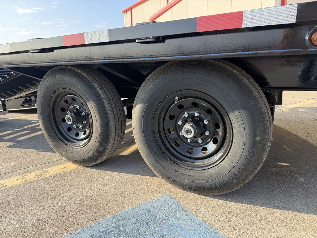 25’ Tandem Axle BP Single Deck Over (20’ + 5’) 2 x 7,000 lb. Electric Brake Axles 2 5/16 in Adj. Ram Coupler 102 in Overall Width 1 x 10K Drop Leg Jacks (Bolt On) 8 in I Beam Frame and Tongue 3 in Channel Cross Members 6 in Tube w/ HD Rub Rail and Stake Pockets Mega / Macho Ramp System ST 235 80 R16 Load Range E Tires & Wheels Black Out Wheel Spare Mount All LED Lights Treated Wood 7 Way RV Plug Empty Weight: 4,500 lbs. GVWR: 14,000 lbs. Carrying Capacity: 9,500 lbs.