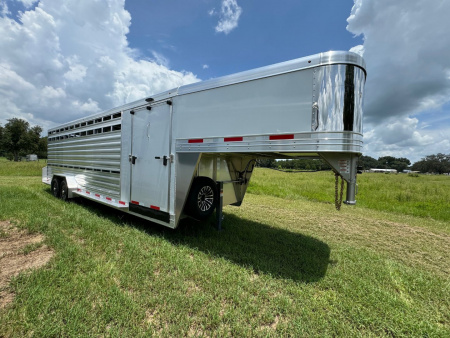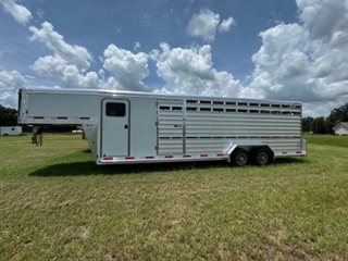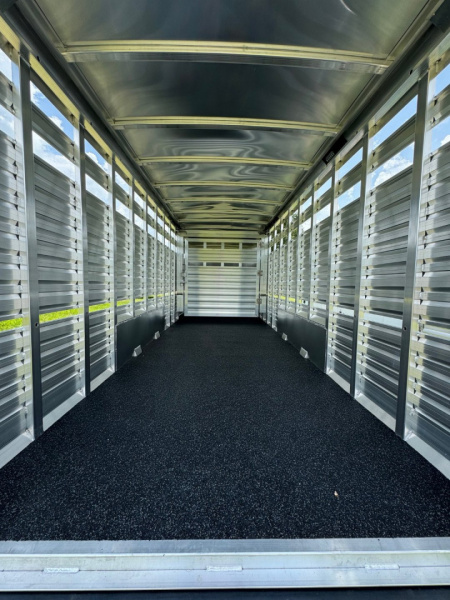2026 Exiss STC 7026 Cattle Trailer - This trailer will not disappoint for the show enthusiast. This trailer has 20' stock space with a floating cut gate, easy care flooring, rear load light, full swing door with calf slider gate an interior lights. The tack/storage area is 6' wide and features side ramp and bridal hooks. Outside of the trailer there are lower tie rails on both sides of the trailer. Trailer is: 7' Wide 7'2" Tall 4.200 Lbs