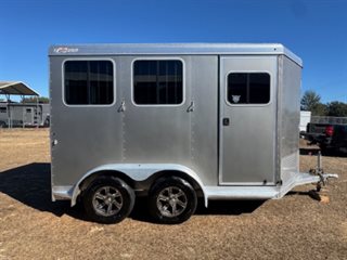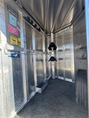 Check out this great used trailer with tons of features. All aluminum frame skin and floor. Single piece roof system with interlocking aluminum plank floor, (2) 3500 lb rubber torsion axles with electric brakes. Eye catching aluminum wheels with newer tires. Interior and exterior fully equipped with LED lights. Horse area consist of 40" stalls, Poly Flooring, Rubber wall lining, Two tie rings per horse, Roof vents, Drop windows on head and sliding windows on hip. Dressing room consist of blanket bar, Brush box, 6 Bridal hooks, Spare tire all in a roomy front tack area that is carpeted.