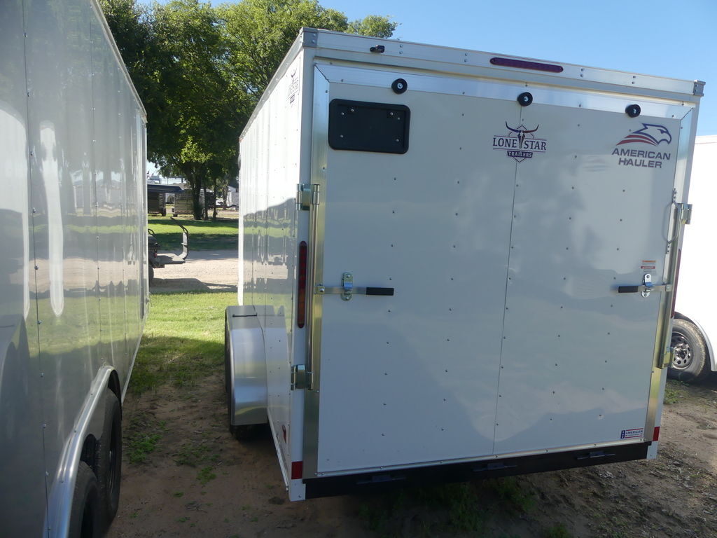 1-Piece Aluminum Roof16in Starbright Stoneguard2in x 4in Tube Main Rails6’6” Approximate Inside HeightCrossmembers 16in On CenterSand PadSmooth Aluminum FendersStandard A-Frame TongueV-Nose12V Dome Light2,000lb Top Wind Tongue Jack3/4in PlexCore DeckingBreakaway Kit Assembly w/ChargerMedium Duty Rear Ramp Door (8’H Max) w/Ramp Extn.Sidewall Flow-Thru VentsST205/75R15C Radial 5B AH Silver Mod Steel WheelTube Roof Bows 24in On Center The Advertised Prices DO NOT Include: *Licensing* & TaxWe have over 200 trailers to choose from. Come in and see us at:6610 N I-35 Lacy Lakeview, TX 76705 (Exit 342B)Not in the great state of Texas? No Problem! We offer local and nation wide delivery.Store Hours:MON–FRI: 8:00 AM - 5:00 PMSATURDAY: 9:00 AM - 2:00 PMSUNDAY: ClosedRemember we handle all your Trailer Sales & Trailer Part Needs!!!Let us help you with servicing your trailer too!It is our pleasure to serve our community of Waco Texas and all of Central Texas