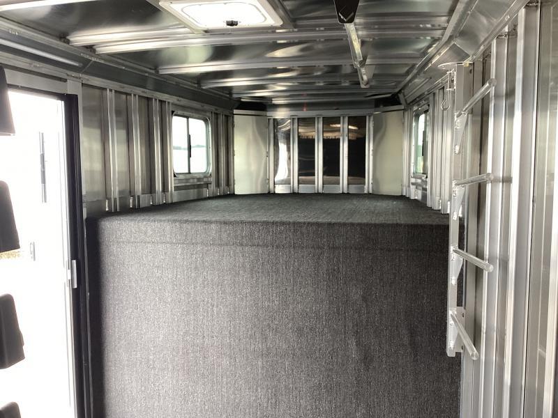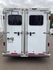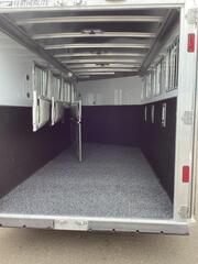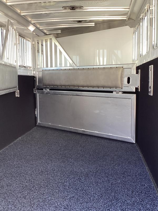 For those that love more, the Model 9600 gooseneck slant load horse trailer is for you! The trailer is available in 2 through 6 horse floorplans with dressing room short wall options of 50” or 72”. The 9600 includes a number of standard features like Air Flo dividers, matching spare tire, rear LED load light, white lining on the walls, one exterior tie ring per horse per side and much more. Model: 9600 Hitch Type: Gooseneck Load Type: Slant Trailer Width: 7’0” Trailer Floor Length: 25’0’’ Inside Height: 7’ 0’’ Horse Stalls: **4** Stall Width: 43” Dressing Room Size: 72’’ Exterior Sides: .040 rivetless aluminum exterior sheets with aluminum wave panels below; Trailer includes stainless steel front sheets and front corners Rear Doors: Double rear doors with windows, stainless double pipe hardware and no center post Unload Doors: Side unload door in front of first horse with nylon strap (not available on 2H) Windows: Drop down feed door with drop down bars in front of each horse; 34 1/4” x 22” window with bars behind each horse; Two 26” x 19” windows in the gooseneck Tack Area: Folding rear tack wall lined on horse area side with white aluminum; Includes turf behind halter hooks in rear tack Stall Dividers: Padded slant stall dividers with AirFlo shoulder separator and spring-loaded slam latch Saddle Rack: Adjustable saddle rack for each horse mounted on removable post; Extra location for post in dressing room Walls: Rubber up 44” on the wall in front of horses; Rubber up 48” on wall behind horses; .090 aluminum up 48” on side walls; .040 white aluminum lining above the wall rubber Doors: 36” square camper door with window & deadbolt for dressing room entry Floor/Floor Mats: Interlocking smooth extruded aluminum floor; 3/4” rubber mats in horse area Roof Vents: One pop-up roof vent per horse Dome Lights: LED light strip in horse area (one per 2 horses); LED light strip for rear tack; Two LED light strips in dressing room; Lights are 12V/20W Dressing Room: 5’ long clothes rod; Turf on floor, drop wall and gooseneck floor; Brush tray; Aluminum halter hooks; Swinging blanket bar Tie Rings: One outside tie ring per horse per side; Five inside tie rings per horse Axles: Two rubber torsion axles with electric brakes; 2H & 3H = 5200#; 4H & 5H = 6000#; 6H = 7000#; E-Z Lube axles standard Tire/Rim: 2H, 3H, 4H & 5H = 16” 6-hole silver aluminum wheels with Goodyear ST235/80R16 Load Range E tires (Qty: 4); 6H = 16” 6-hole silver aluminum wheels with Goodyear ST235/85R16 Load Range E tires (Qty: 4); Matching spare tire and tire carrier standard Exterior Lights: LED clearance lights and 4 wraparound LED stop/turn lights; LED load light above rear load door with switch at rear Butt/Chest Bars: Nylon strap behind rear horse Gravel Guard: NA Coupler: 2 5/16” adjustable gooseneck coupler; Single speed jack with removable crank handle Other: Tapered gooseneck; Aluminum running boards; 1 5/8” side posts; Rubber dock bumper Warranty: 10-year limited structural warranty; 3-year hitch-to-bumper warranty. Transferable warranty** available on qualified trailers. See warranty page or dealer for more info. ** Descriptions Subject to Error** For more information on this trailer please contact Double J Trailers at 360-225-1234. Thank You! Financing available to qualified buyers! All trailer prices are cash prices. Thank you! Trades Welcome Two Lots To Better Serve You! Woodland Washington & Albany Oregon We have over 250 trailers in stock. Please view our entire inventory at [www.double-j.com](http://www.double-j.com/) thank you! *Double J imposes a surcharge of 3% on credit card purchases of amounts greater than $500*