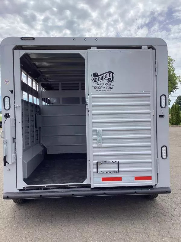 Our Hotshot gooseneck trailer is a 7’6” wide x 7’ tall livestock trailer. The design of this trailer has electro-galvanized seamless corrugated steel sides for strength and durability. This extra-safe stock trailer is light weight and built for safety. This is a great pulling trailer because of the aerodynamic design of the front, cutting the wind while still providing enough space in the gooseneck area for an optional tack package. Check out this great priced trailer that is built for real stock men and women. Upgrades: * Enclosed Rear Gate Features * Aluminum One-Piece Roof * Electro-Galvanized, Corrugated Steel Sides * 7’6” Wide * 7’0” Tall * Slam Latch Rear Gate with Slider * Aluminum Tread Brite Front * Full Aluminum Side Steps * Aerodynamic Bullet Nose * 54” Side Gate on Passenger Side (open stock only) * Gooseneck Calf Gate * Torsion Axles * Radial Tires * Rubber Bumper * 2” x 10” Douglas Fir Flooring * Rubber Wall Mats * 4 Wheel Electric Brakes * Acidic Phosphatizing Wash * Polymer Coating * Epoxy Primer * Choice of Gray or White Paint Color Warranty * One Year Limited Paint/Trim Warranty * Five Year Limited Structure/Floor Warranty ** Descriptions Subject to Error** For more information on this trailer please contact Double J Trailers at 541-812-1234. Thank You! Financing available to qualified buyers! All trailer prices are cash prices. Thank you! Trades Welcome Two Lots To Better Serve You! Woodland Washington & Albany Oregon We have over 250 trailers in stock. Please view our entire inventory at [www.double-j.com](http://www.double-j.com/) thank you! *Double J imposes a surcharge of 3% on credit card purchases of amounts greater than $500*