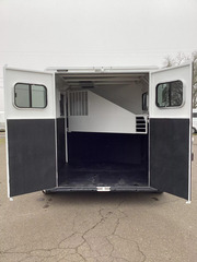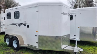 The Adventure MX is the best-priced steel-framed aluminum-skinned trailer in the industry, and features the perfect combination of style and value. This trailer sports a newly designed aerodynamic front, and comes loaded with head-side drop-down feed windows, tail-side sliding windows and rubber-wall mats throughout the horse compartment, making it the best-equipped trailer in its class. Upgrades: Convenience Package which includes: Swing Out Saddle Rack, Spare Tire, Water Tank, Door Mounted Tack Organizer, Sport Bag, Load Light Each Side and Rear Doors. Windows in rear doors Structural Features: Triple Wall Construction Aluminum Exterior Sheets 1 Piece Aluminum Roof 3500# Torsion Axles w/EZ Lube Hubs 4 Wheel Electric Brakes Radial Tires Aluminum Fenders Tread Brite Steps & Front Gravel Guard Rubber Dock Bumper Molded 7-Way RV Plug Tack Room Features: 32” Tack Door Dome Light Tack Door Brush Tray Swing Out Saddle Rack 16 Bridle Hooks 4 Place Blanket Rack Clothes Rod Camper Vent Rubber Floor Mats Carpeted Angle Wall Horse Area Features: Drop Down Feed Doors (head side) Sliding Windows (tail side) Dome Light Rubber Wall Mats Rubber Floor Mats Jailbar Flo Through Slam Latch Dividers Tie Ring Each Stall Double Rear Doors Roof Vent Each Stall Paint/Trim Features: Acidic Phosphatizing Wash Polymer Coating Epoxy Primer Polyurethane Paint Infrared Cured Warranty: One Year Paint/Trim Five Year Structure/Floor ** Descriptions Subject to Error** For more information on this trailer please contact Double J Trailers at 541-812-1234. Thank You! Financing available to qualified buyers! All trailer prices are cash prices. Thank you! Trades Welcome Two Lots To Better Serve You! Woodland Washington & Albany Oregon We have over 250 trailers in stock. Please view our entire inventory at [www.double-j.com](http://www.double-j.com/) thank you! *Double J imposes a surcharge of 3% on credit card purchases of amounts greater than $500*