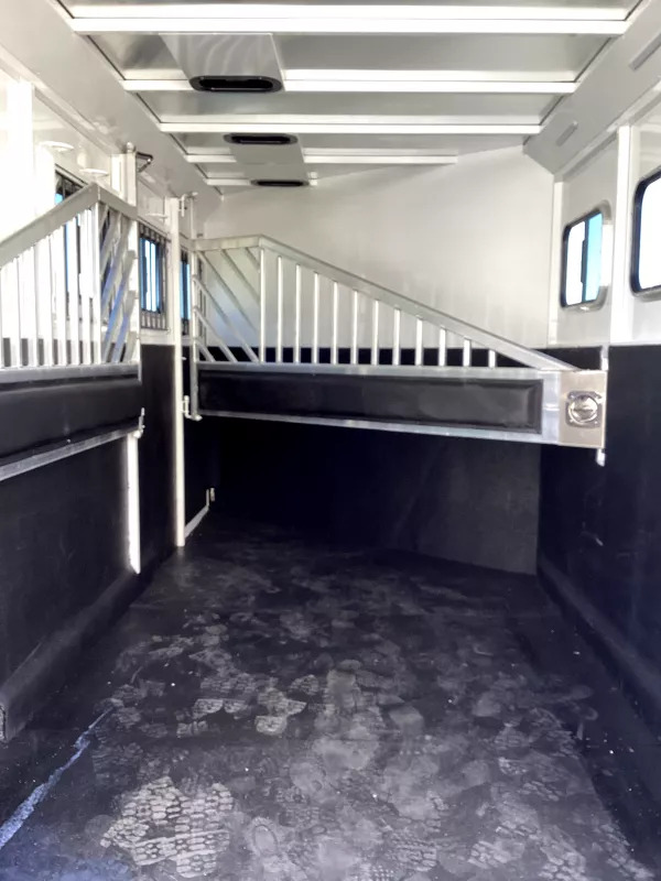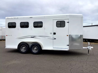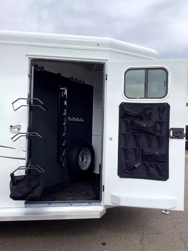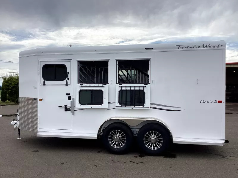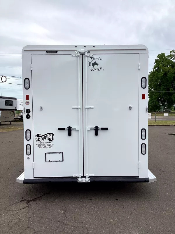 The Classic model is constructed with a steel frame and aluminum skins. It’s 7’0? wide, 7’0? tall with custom drop down feed doors with face grills on the head side, a roof vent in each stall and sliding windows on the tail side. The large 41? stalls provide room and comfort for your horse locked in with the industry’s best slam latch divider system. The tack room is very roomy and functional with swing-out saddle and blanket racks. Upgraded Features: * Convenience Package; Includes Spare Tire, Water Tank, Door-Mounted Organizer, Sport Bag, Flood Light Each Side & Rear * Warmblood Height * Rubber Floor Mats Structural Features: * Floor Length: 18’3” * Width: 7’0” Wide * Height: 7’4” Tall * .050 Aluminum Exterior Sheets * Torsion Axels with Easy Lube Hubs * Four Wheel Electric Brakes * Aluminum Wheels * Radial Tires * Rubber Bumper * 2x10 Douglas Fir Flooring Horse Area Features: * Triple Wall Construction * Bottom Latch Drop Down Feed Doors Head Side * Drop Down Window w/ Safety bars * Sliding Windows Tail Side * Roof Vent in Each Stall * LED Dome Light in Each Stall * Slam Latch, Aluminum, Jailbar Dividers * Divider Pads * Floor Mats * Wal Mats * 45/55 Double Rear Doors Tack Room Features: * Fully Sealed Angle Wall W/Full Carpet * 38” Tack Door with Window * Dome Light * Clothes Rod * 12 Bridle Hooks * 4 Headstall Holders * 2 Brush Trays * Swing-Out Saddle Rack * Swing-Out Blanket Rack Paint & Trim: * Acidic Phosphatizing Wash * Polymer Coating * Epoxy Primer * Polyurethane Paint * Infrared Cured * Double Tail Lights * LED Lighting * Backup Lights Warranty: * Three Year Limited Paint/Trim * Five Year Limited Structure * Eight Year Limited Floor ** Descriptions Subject to Error** For more information on this trailer please contact Double J Trailers at 541-812-1234. Thank You! Financing available to qualified buyers! All trailer prices are cash prices. Thank you! Trades Welcome Two Lots To Better Serve You! Woodland Washington & Albany Oregon We have over 250 trailers in stock. Please view our entire inventory at [www.double-j.com](http://www.double-j.com/) thank you! *Double J imposes a surcharge of 3% on credit card purchases of amounts greater than $500*