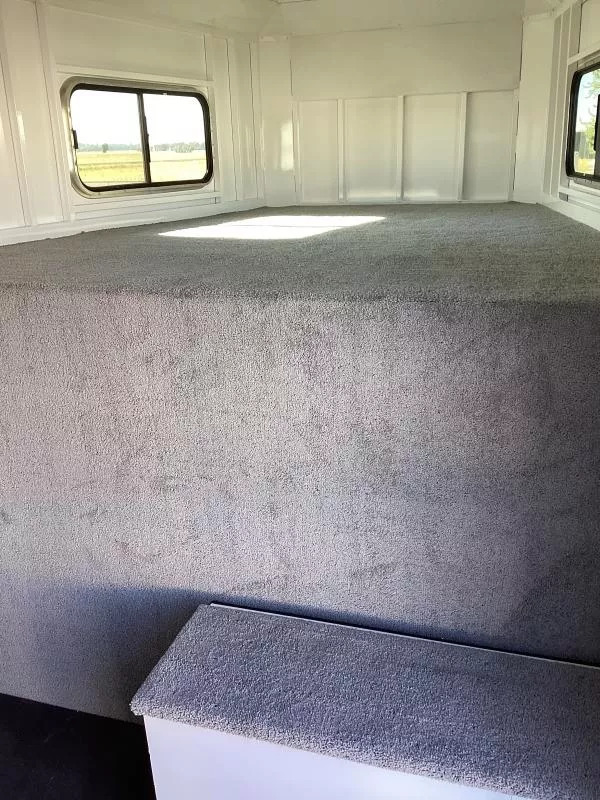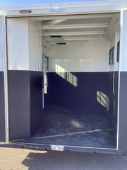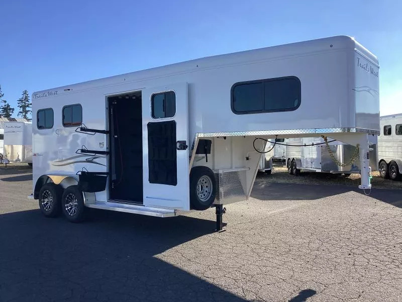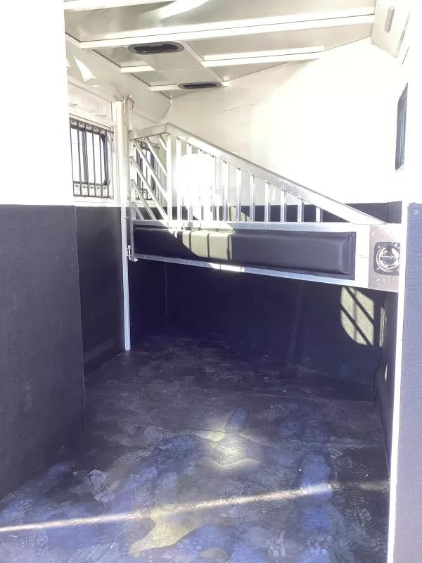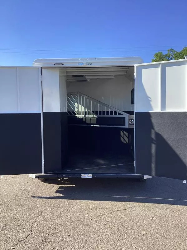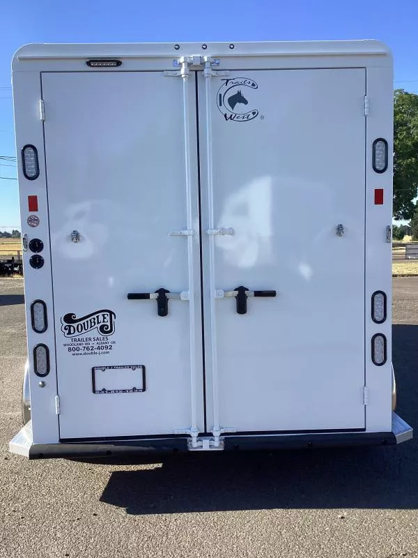 UPGRADED OPTIONS: Warmblood Height Convenience Package Rubber Mats ILO of Carpet Broom Closet 14x14 Camper Vent STRUCTURAL FEATURES: 7’ Wide, 7’4” Tall Aluminum One-Piece Roof .050 Aluminum Exterior Sheets Torsion Axles with Easy Lube Hubs Four Wheel Electric Brakes Radial Tires Aluminum Wheels Rubber Bumper 2 x 10 Douglas Fir Flooring TACK ROOM FEATURES: Fully Sealed Angle Wall W/Full Carpet 38’’ Tack Door with Window Clothes Rod 12 Bridle Hooks 4 Headstall Holders 2 Brush Trays Swing-out Blanket Rack Swing-out Saddle Rack HORSE COMPARTMENT FEATURES: Triple Wall Construction Bottom Latch Drop Down Feed Doors Head Side Drop Down Feed Door Safety Grill Sliding Windows Tail Side Roof Vent in Each Stall LED Dome Light in Each Stall Slam latch, Aluminum, Jailbar Dividers Divider Pads Floor Mats Wall Mats 45/55 Double Rear Doors PAINT & TRIM: Acidic Phosphatizing Wash Polymer Coating Epoxy Primer Polyurethane Paint Infrared Cured Choice of Graphic Color Tread Brite Front & GN Gussets Backup Lights Double Tail Lights Molded 7 ” Way RV Plug Hotwire package w/battery box LED Lighting WARRANTY Three Year Limited Paint/Trim Five Year Limited Structure Eight Year Limited Floor ** Descriptions Subject to Error** For more information on this trailer please contact Double J Trailers at 541-812-1234. Thank You! Financing available to qualified buyers! All trailer prices are cash prices. Thank you! Trades Welcome Two Lots To Better Serve You! Woodland Washington & Albany Oregon We have over 250 trailers in stock. Please view our entire inventory at [www.double-j.com](http://www.double-j.com/) thank you! *Double J imposes a surcharge of 3% on credit card purchases of amounts greater than $500*