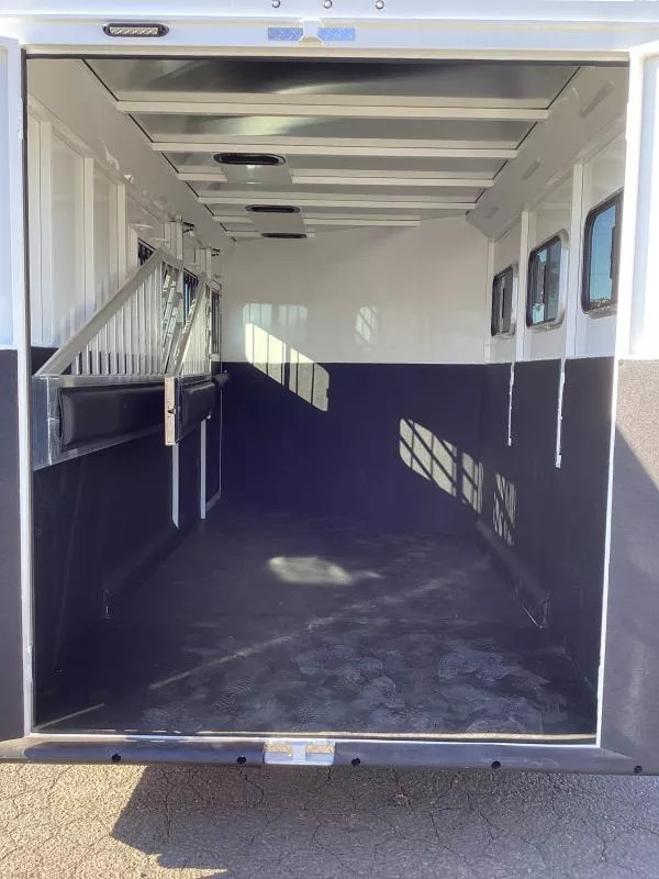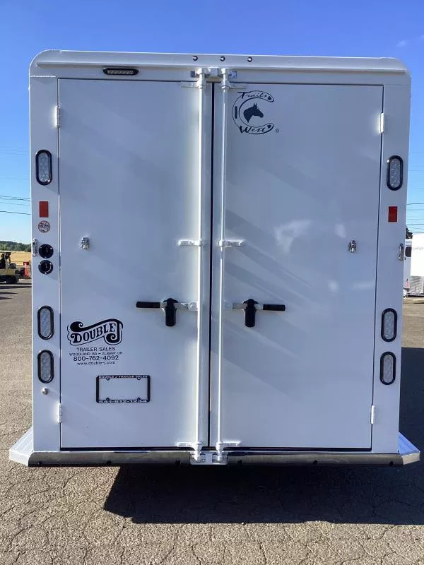 The Classic model is constructed with a steel frame and aluminum skins. It’s 7’0? wide, 7’4” tall with custom drop down feed doors with face grills on the head side, a roof vent in each stall and sliding windows on the tail side. The large 41? stalls provide room and comfort for your horse locked in with the industry’s best slam latch divider system. The tack room is very roomy and functional with swing-out saddle and blanket racks. Upgraded Features: * Convenience Package; Includes Spare Tire, Water Tank, Door-Mounted Organizer, Sport Bag, Flood Light Each Side & Rear * Warmblood Height * Rubber Floor Mats * 2ft added to tack room Structural Features: * Floor Length = 19’ 6” * Box Length = 16’ 9” * Width: 7’0” Wide * Height: 7’4” Tall * .050 Aluminum Exterior Sheets * Torsion Axels with Easy Lube Hubs * Four Wheel Electric Brakes * Aluminum Wheels * Radial Tires * Rubber Bumper * 2x10 Douglas Fir Flooring Horse Area Features: * Triple Wall Construction * Bottom Latch Drop Down Feed Doors Head Side * Drop Down Window w/ Safety bars * Sliding Windows Tail Side * Roof Vent in Each Stall * LED Dome Light in Each Stall * Slam Latch, Aluminum, Jailbar Dividers * Divider Pads * Floor Mats * Wal Mats * 45/55 Double Rear Doors Tack Room Features: * Fully Sealed Angle Wall W/Full Carpet * 38” Tack Door with Window * Dome Light * Clothes Rod * 12 Bridle Hooks * 4 Headstall Holders * 2 Brush Trays * Swing-Out Saddle Rack * Swing-Out Blanket Rack Paint & Trim: * Acidic Phosphatizing Wash * Polymer Coating * Epoxy Primer * Polyurethane Paint * Infrared Cured * Double Tail Lights * LED Lighting * Backup Lights Warranty: * Three Year Limited Paint/Trim * Five Year Limited Structure * Eight Year Limited Floor ** Descriptions Subject to Error** For more information on this trailer please contact Double J Trailers at 541-812-1234. Thank You! Financing available to qualified buyers! All trailer prices are cash prices. Thank you! Trades Welcome Two Lots To Better Serve You! Woodland Washington & Albany Oregon We have over 250 trailers in stock. Please view our entire inventory at [www.double-j.com](http://www.double-j.com/) thank you! *Double J imposes a surcharge of 3% on credit card purchases of amounts greater than $500*