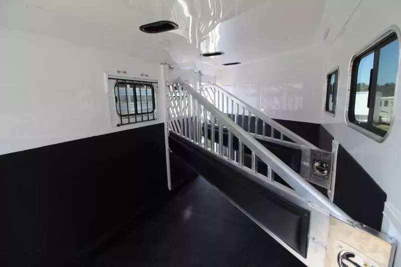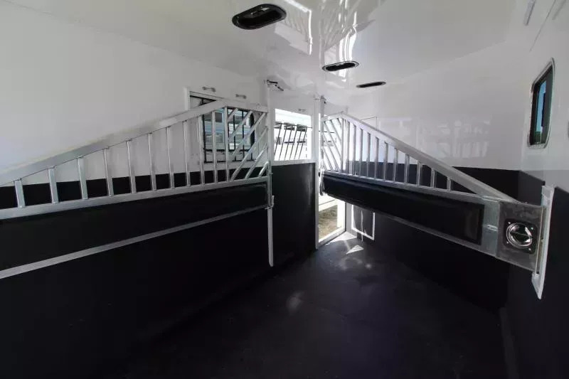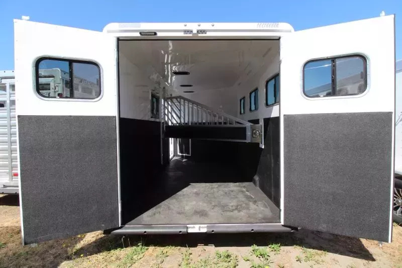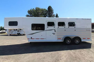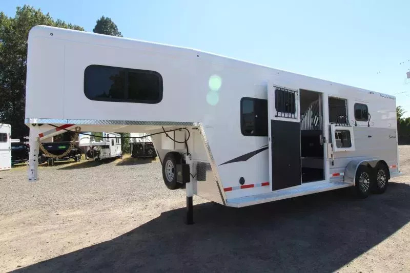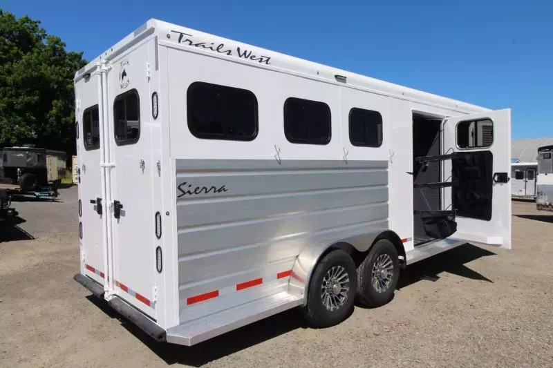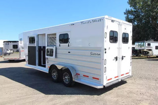 **PICTURES OF TRAILER ARE STOCK IMAGES NOT OF ACTUAL TRAILER** The Sierra is our flagship horse trailer model. It comes loaded with standard features such as aluminum wheels, anodized aluminum exterior extrusion, stainless-steel front, and fully-lined and insulated horse compartment. A fully-carpeted angle wall in the tack room allows you to hang plenty of tack without damaging your trailer. Its abundance of features makes this THE trailer that serious equine enthusiasts are looking for. UPGRADES: Comfort Package Fantastic Fan & converter Extra Tall Convenience Package which includes: Spare Tire, Water Tank, Tack Door Organizer, (3) Exterior Load Lights and Sport Bag. Hydraulic Jack Escape Door Pass Through Door TRAILER FEATURES: 7’0” Wide 7’4” Inside Height Aluminum One-Piece Roof .050 Aluminum Exterior Sheets/Anodized Aluminum Extrusions 2x10 Douglas Fir Floor 6000lb Torsion Axles Four Wheel Electric Brakes E-Z Lube Hubs Locking Battery Box Aluminum Wheels Double Tail Lights Rubber Dock Bumper LED Lighting Reverse Lights Molded 7-Way RV Plug DRESSING ROOM FEATURES: Day/Night Shades 38” Door w/Window 4 LED Dome Lights Paneled & Insulated Boot Box Vanity Cabinet Hat Racks Coat Hooks Clothes Rod Mirror Cup Holder Carpeted Gooseneck Deck & Drop Wall Pass through door to horse area TACK ROOM FEATURES: Swing Out Saddle Rack Carpeted Walls Rubber Floor Mat - UPGRADE Swing Out Blanket Bar Water Tank Bridle/Halter Hooks Brush Box Tack Door Organizer Sport Boot Bag HORSE AREA FEATURES: Triple Wall Construction Lined & Insulated Roof & Walls Bottom Latch Drop Down Feed Doors w/Drop Down Bars- Head Side Sliding Windows - Tail Side Slam Latch Aluminum Jailbar Dividers w/Pads Roof Vent in Each Stall Rubber Wall Mats LED Dome Light per Stall w/Exterior Switch Rubber Floor Mats 45/55 Double Rear Doors w/Windows Escape Door PAINT & TRIM: Acidic Phosphatizing Wash Polymer Coating Epoxy Primer Polyurethane Paint Infrared Cured Tread Brite Front & GN Gussets Chrome Grab Handle Near Dressing Room Door WARRANTY: 3 Year Paint/Trim 5 Year Limited Structure 8 Year Limited Floor ** Descriptions Subject to Error** For more information on this trailer please contact Double J Trailers at 360-225-1234. Thank You! Financing available to qualified buyers! All trailer prices are cash prices. Thank you! Trades Welcome Two Lots To Better Serve You! Woodland Washington & Albany Oregon We have over 250 trailers in stock. Please view our entire inventory at [www.double-j.com](http://www.double-j.com/) thank you! *Double J imposes a surcharge of 3% on credit card purchases of amounts greater than $500*