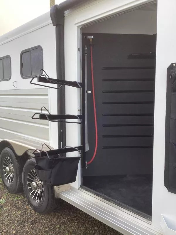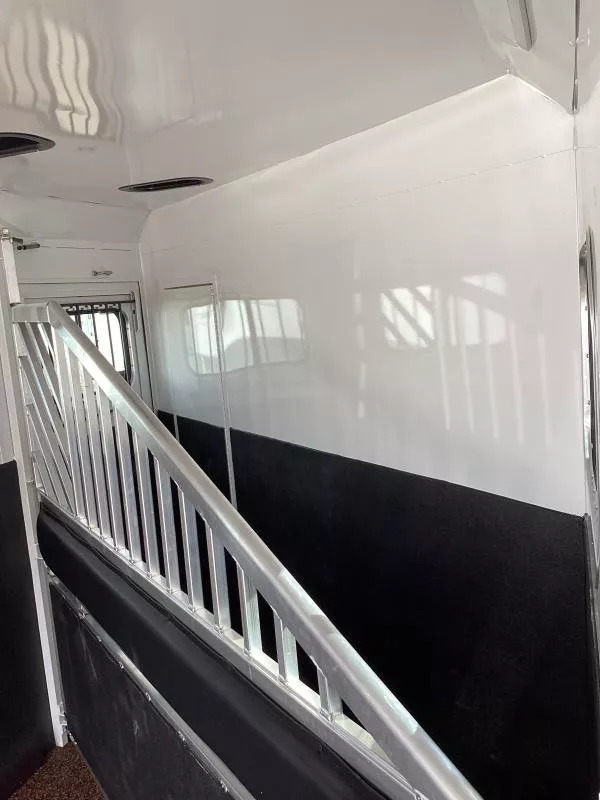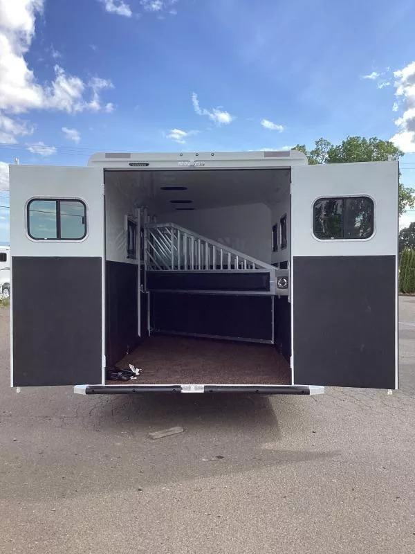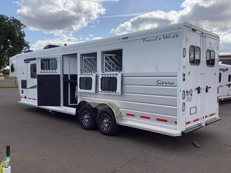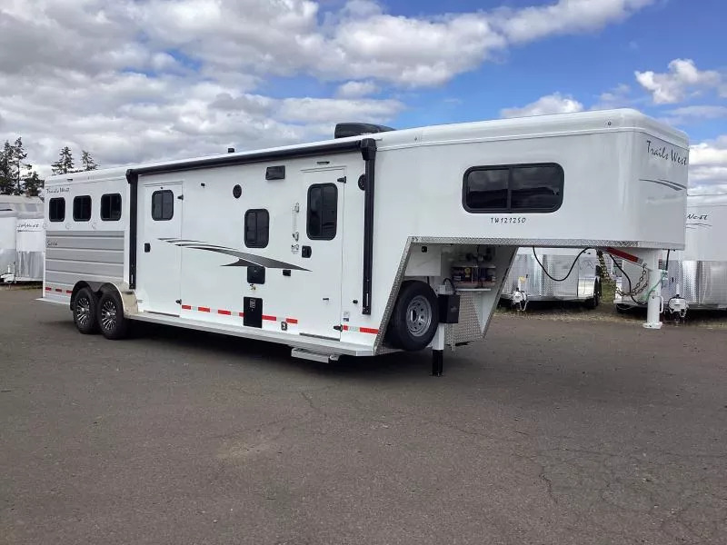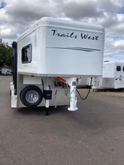 ***PICTURES ARE NOT OF ACTUAL TRAILER, FOR ACTUAL TRAILER FEATURES PLEASE REVIEW DESCRIPTION, COLOR OF INTERIOR COULD BE DIFFERENT OF ACTUAL TRAILER THAN PICTURES SHOW.*** Come see why Trails West has built a reputation for quality, durability and dependability with this unit being a prime example! Travel in style and comfort with this spacious trailer to your next outing with your equine partners. UPGRADES: * Exterior Faucet * Exterior Speakers * Roll Out Screen Door * Exterior 110v Outlet * Shower Dome * Glass Shower Door * Exterior Shower * Escape Door * Stud Divider * Convenience Package which includes: swing out saddle rack, spare tire, water tank, door mounted tack organizer, sport bag, load light each side and rear gate. CONSTRUCTION & EXTERIOR: * Camper Door w/24” Window * 24” x 48” Egress Window * 18” x 18” Kitchen Window * 8’0” Gooseneck * Hydraulic Jack * Retractable Step Under Camper Door * Stabilizer Jacks Under Each Side- Front * Side Tack INTERIOR: * Soft Touch Ceiling * Synthetic Leather Sofa or Cushions * Wood Valanes * Day/Night Shades * Color Coordinated Interior * Vinyl Floor w/Wood Print Throughout * Hardwood Cabinetry HORSE COMPARTMENT: * 7’0” Wide * 7’4” Tall * .050 Aluminum Exterior Sheets * Drop Down Feed Doors- Head Side * Sliding Windows- Tail Side * Double Rear Doors * Rubber Wall Mats * Hoof Grip Flooring * Pop-Up Roof Vent Each Stall * Slam Latch Dividers SAFETY: * Locking Water Fill Door * Fire Extinguisher * CO/Smoke Detector * L.P. Detector * Alternate Emergency Exit HEATING /INSULATION: * Dual 5 gal. Propane Tanks w/Auto Changeover * Fully Insulated Floor, Roof and Walls * 18,000 BTU Furnace * A/C GALLEY: * 2 Burner Cooktop w/Range Hood * 6 cu. ft Double-door Refrigerator * Galley Sink * Wood Trimmed Counter Tops * Flip-up Counter Top Extension * Microwave/Convection Oven ELECTRICAL: * Locking Battery Box * AM/FM Stereo * Monitor Panel * 12v Outlets * 110v Outlets * 110v/12v Power Converter w/Charger * 30” Service Cord * TV Antenna w/Power Booster * Porch Light by Camper Door * Recessed LED Lighting * Lighted Grab Handle by Exterior Door SLEEPING ACCOMODATIONS: * Queen Size Bed * Bedspread, Pillows & Shams * Sofa/Dinette Converts into Bed BATHROOM: * 25” x 30” Shower Stall * 12v Exhaust Fan * Fresh Water Flush Toilet * Wash Basin w/Vanity FRESH & WASTE WATER SYSTEMS: * Low Point Fresh Water Drains * Demand Type Water Pump * Combination Locking Water Center * 48 gal. Fresh Water Tank * 28 gal. Black Holding Tank * 28 gal. Gray Holding Tank * Water Heater By-pass * Sewer Hose Storage Compartment * Sewer Hose & Adapter ** Descriptions Subject to Error** For more information on this trailer please contact Double J Trailers at 360-225-1234. Thank You! Financing available to qualified buyers! All trailer prices are cash prices. Thank you! Trades Welcome Two Lots To Better Serve You! Woodland Washington & Albany Oregon We have over 250 trailers in stock. Please view our entire inventory at [www.double-j.com](http://www.double-j.com/) thank you! *Double J imposes a surcharge of 3% on credit card purchases of amounts greater than $500*