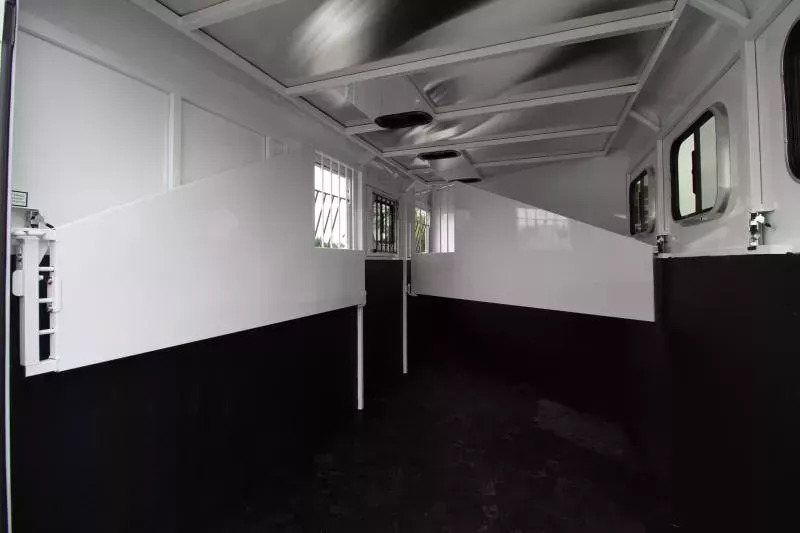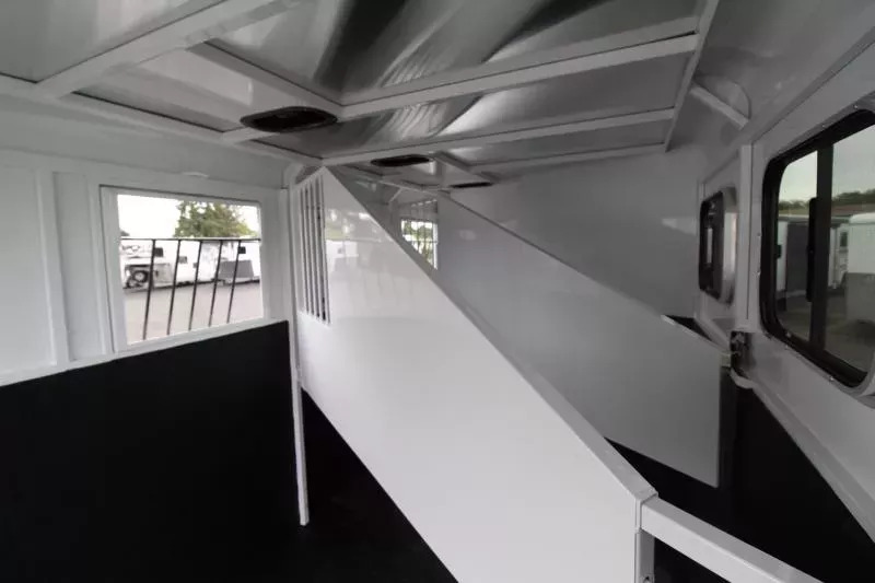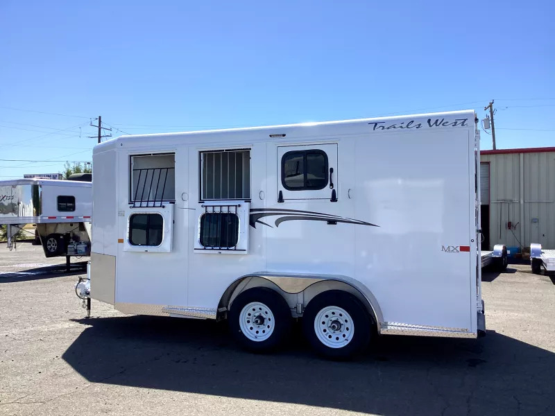 The Adventure MX is our best seller. It is the best priced steel framed aluminum skinned trailer in the industry, having the perfect combination of style, user friendly features and value. This trailer has our newly designed aerodynamic front, head side drop down feed windows, tail side sliding windows and rubber wall mats all the way around the horse compartment making it the best equipped trailer in its class. UPGRADED FEATURES: * Convenience Package* (* Convenience Package includes: swing-out saddle rack, spare tire, water tank, door mounted tack organizer, sport bag, load light by each side and rear gate) * Rubber Floor mats in Tack room * Star Caps * Rear Door Windows * Standard Features: * 6 9 Wide, 70 Tall * Triple Wall Construction * Aluminum Exterior Sheets * 1 Piece Aluminum Roof * 5200# Torsion Axles * 4 Wheel Electric Brakes * Easy Lube Hubs * Radial Tires * Aluminum Fenders, Tread Brite Tapered Steps Front Gravel Guard * Drop Down Feed Windows * Windows Tail Side * Rubber Bumper * Molded Seven-Way RV Plug * One Year Limited Warranty Tack Room Features: * 32 Inch Inset Tack Door * Dome Light * Tack Door Brush Tray * Three Place Saddle Racks * 16 Bridle Hooks * Blanket Rod * Clothes Rod * Camper Vent Horse Compartment Features: * Drop Down Feed Windows (head side) * Sliding Windows (tail side) * Dome Light * Rubber Wall Mats * Rubber Floor Mats * Slam Latch Dividers * Tie Ring Each Stall * Double Rear Doors Paint Finish Features: * Acidic Phosphatizing Wash * Polymer Coating * Epoxy Primer * Polyurethane Paint * Infrared Cured ** Descriptions Subject to Error** For more information on this trailer please contact Double J Trailers at 541-812-1234. Thank You! Financing available to qualified buyers! All trailer prices are cash prices. Thank you! Trades Welcome Two Lots To Better Serve You! Woodland Washington & Albany Oregon We have over 250 trailers in stock. Please view our entire inventory at [www.double-j.com](http://www.double-j.com/) thank you! *Double J imposes a surcharge of 3% on credit card purchases of amounts greater than $500*