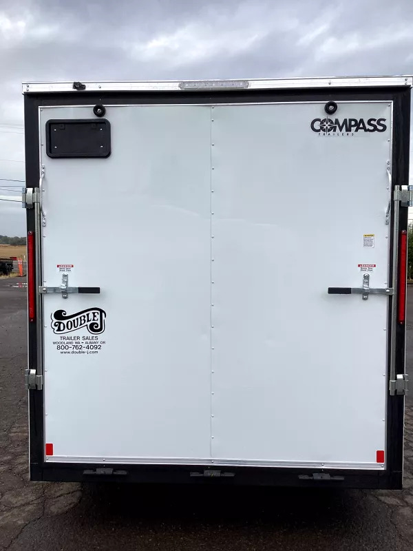 This trailer is great for hauling anything you might need, such as your tools, camping gear or to haul your toys for a weekend getaway. The simple and sturdy design of the trailers make them easy to customize to your needs, especially with the V nose front that adds extra floor space. Check out more of the trailer’s features below. COMPASS TRAILERS ADD ONS: -BLACK Exterior Aluminum Skin -Additional 6’’ Height to standard height (84” total) -Spare Tire (205/75R15 5 lug w/ BLACK Mod) -Fold Down Stabilizer Jacks 11 1/2” Standard Features INDIGO 7’ Wide Cargo Trailers * Flat Top, 16” V-Nose * 4” Tube Main Frame * 24” On-Center Crossmembers * 4” A-Frame Tube Tongue * 24” On-Center Z-Post Sidewalls * Smooth Aluminum Fenders * Drop Spring Brake Axles * 7-Way Electric Plug * Breakaway Battery with Switch * 32” Wide Entry Door with Flush Lock Metal Wire Door Holdback * RAMP DOOR CAPACITY : 2500 * 24” On-Center Roof Bows * Lauan Ceiling Liner Strip * Safety Chains * Bullet LED Marker and Clearance Lights * 16” Tall Straight ATP Stone Guard * 2K Coupler Mounted Jack * Slimline LED Stop/Turn/Tail Lights * 1.5” Top Trim * Superlube Hubs * (1) LED Dome Light with Switch * 1.5” Bottom Trim * 15” Silver Steel Wheels * 0.030 Aluminum Exterior Seamless Aluminum Roof * High Performance Wood Walls * Color Matching Rear Hoop * Rear Ramp Door with Spring Assist * 3/4” High Performance Wood Flooring * Sidewall Vents * Automotive Undercoating * Fully Screwed Exterior (Color Matching Screws When Applicable) * Limited 3 Year Warranty** ** Descriptions Subject to Error** For more information on this trailer please contact Double J Trailers at 541-812-1234. Thank You! Financing available to qualified buyers! All trailer prices are cash prices. Thank you! Trades Welcome Two Lots To Better Serve You! Woodland Washington & Albany Oregon We have over 250 trailers in stock. Please view our entire inventory at [www.double-j.com](http://www.double-j.com/) thank you! *Double J imposes a surcharge of 3% on credit card purchases of amounts greater than $500*