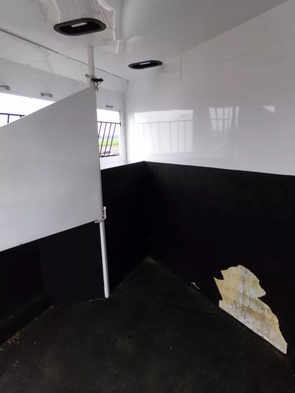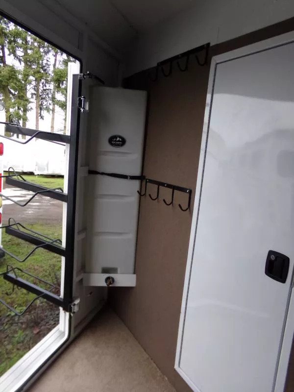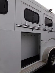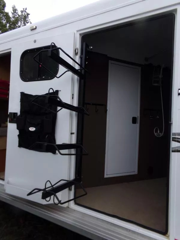 This Sierra 2 Horse Gooseneck model with a mid-tack has been converted into a cozy custom partial living quarters trailer with an abundance of storage. The mid-tack area now boasts a cowboy shower while still providing ample space for your tack, with a 4 tier swing-out saddle rack, door organizer, blanket/pad rack, water tank and plenty of hooks. There is additional storage under the mangers, with hooks and a light. The kitchen area consists of a sink, stove, fridge and freezer along with plenty of cabinet space. Bring your questions ~ this one is as unique as the markings of a painted horse! ** Descriptions Subject to Error** For more information on this trailer please contact Double J Trailers at 541-812-1234. Thank You! Financing available to qualified buyers! All trailer prices are cash prices. Thank you! Trades Welcome Two Lots To Better Serve You! Woodland Washington & Albany Oregon We have over 250 trailers in stock. Please view our entire inventory at [www.double-j.com](http://www.double-j.com/) thank you! *Double J imposes a surcharge of 3% on credit card purchases of amounts greater than $500*