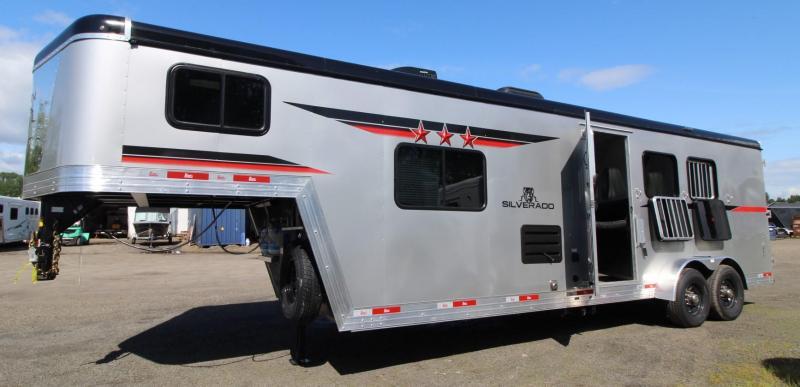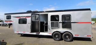 PRICE REDUCED BELOW COST! 10/7/23 All Aluminum! Looking for an affordable way to have extended stays with your equine companion without sacrificing all the creature comforts of home? Then look no further and come see what this feature rich Bison trailer has to offer at our Woodland Washington location we look forward to meeting you! Upgraded Features: * Single Leg Hydraulic Jack * 2 Batteries Group 24 w/Shut Off * Lined and Insulated Horse Area Ceiling * Load light package * 13500 BTU Air Conditioner * Stereo with interior and exterior speakers * Recessed cooktop with range hood * 18000 BTU furnace * Powered Awning with LED light strip * Retractable Shower Door ILO of shower curtain * 30 AMP Service w/ Detachable 30 AMP power cord Build Features: * Aluminum Frame * Aluminum Skin * Extruded Aluminum Plank Horse area Flooring * LED Exterior Lights * LP Tanks (2) w/Dual Regulator * ST235/80R16 LRE Tires w/ Black Mod Steel Wheel * Spare Tire & Rim * Exterior Water Spigot Horse Area Features: * Lined and Insulated Horse Area Ceiling * 3-Way Switch for Horse Area * Drop Down Feed Windows (Drivers Side) * Side Escape Door w/ Drop Down Feed Window * Sliding Window on hip side of each stall * Stud Walln* 60/40 Rear Load Doors * Rear Tack which includes: Bridle hooks & Saddle Tree Interior Features: * Chestnut Brown Interior * Westport Mink Flooring * Artist Maple Cabinets * 13500 BTU Air Conditioner * 6 Gal gas water heater * Stereo with Interior and Exterior Speakers * Vinyl Valances with Mini Blinds * Upgraded Flooring Throughout * TV/Radio Antenna * Shirt Closets w/ Mirrored Inserts in bedroom * LED interior Lighting * Sofa Kitchen: * Recessed Cook Top w/Range Hood * Microwave * Refrigerator * Stainless Steel Kitchen Sink * Upgraded Countertop throughout * Countertop Extension Bathroom: * Porcelain Toilet * Shower w/Dual Control Handles * Skylight in Shower * Retractable Shower Door Specs: * Hitch Weight: 2513 * 39 Gal Fresh Water * 35 Gal Grey Water * 35 Gal Black Water ** Descriptions Subject to Error** For more information on this trailer please contact Double J Trailers at 360-225-1234. Thank You!nnFinancing available to qualified customersnAll trailer prices are cash prices. Thank you!nnTrades WelcomenTwo Lots To Better Serve You! Woodland Washington & Albany OregonnnWe have over 100 trailers in stock. Please view our entire inventory at [www.double-j.com](http://www.double-j.com/) thank you!nDouble J imposes a surcharge of 3% on credit card purchases of amounts greater than $500