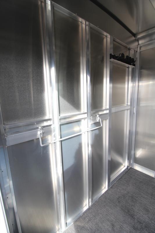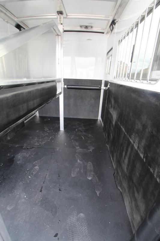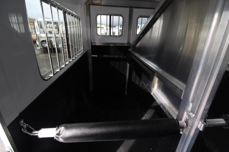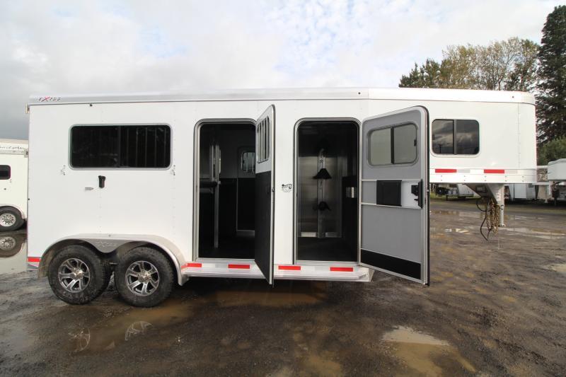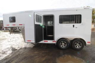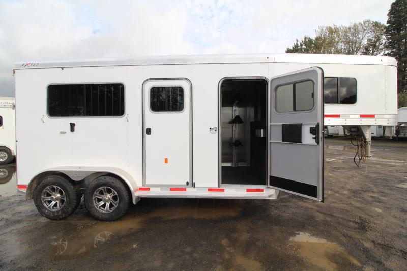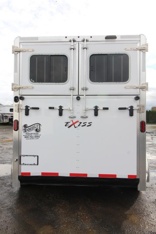 *** Huge price drop!!! The Exiss 7200 ST is the perfect horse trailer for transporting two horses with maximum ease, comfort and safety. Designed specifically for large horses, this 7’ wide, 2 horse straight load, all-aluminum gooseneck trailer provides maximum value with advanced engineering and the most durable construction. Coupler Type: Gooseneck * Load Type: Straight load * Trailer Width: 7’0” width * Inside Height: 7’8” inside height * Exterior Sides: .040 white aluminum side sheets w/ stainless nose; Extruded aluminum slat outside of horse area * Axles: (2) 5,200 lbs. rubber torsion axles w/ electric brakes (2H) * Wheels: Five 16” 6 hole aluminum wheels w/ 10 ply tires (includes spare) for 2H Horse Stalls: 2H (Model 7200) * Stall Width: 40” stall width * Horse Area Walls: Horse area walls insulated and lined w/ white aluminum; Rubber installed 48” high w/ white aluminum lining above; Aluminum kickplate behind rubber lining * Horse Area Windows: One 24” x 57” window w/ bars and screen (each side); Two access doors w/ 18” x 24” window w/ screen and bars; One window in each rear door * Windows: One 19” x 26” window on each side of gooseneck * Stall Dividers: One padded 7’ divider w/ body, shoulder and head separator; Hardware allows for (optional) removable head divider (NOT FEATURED) * Breast/Butt bars: One padded aluminum butt bar and breast bar per stall Structural features: * Rear Doors : Two top doors above ramp w/ 19” x 26” windows; Cam locks & locking keyed hasps on rear doors * Rear Bumper: Full-width rear ramp, spring assisted with safety cover * Roof: Single piece aluminum roof w/ one roof vent per stall * Floor: Interlocking extruded plank flooring w/ 2” x 4” I-beams on 16” centers * Floor Mats: Lifetime rubber floor mat in horse area * Running Boards: Only on dressing room/tack room side; Tear drop fenders on driver side * Tie Rings: Two inside tie rings and two outside tie rings per horse * Coupler: Kingpin hitch w/ 2 5/16” adjustable coupler * Landing Gear: Single leg landing gear w/ removable crank handle * Hitch Safety: Breakaway switch w/ battery & slip hook safety chains * Exterior Lighting: LED brake, running lights and rear load light * Interior Lighting: One interior LED light per divider in horse area; Two interior LED lights in dressing room; One interior LED light in rear tack Dressing room/ Tack room Features: * Dressing Room Size: 4’6” shortwall Straight wall * Carpet: Carpeted dressing room floor, drop wall and gooseneck bed * Saddle Rack: Adjustable saddle rack on removable post (3 saddle tiers) in tack room (2H); * Tack Items: Blanket bar, brush tray, clothes rod and six halter hooks; One set of 6 halter hooks in rear tack * Other: Camper door with sliding window & screen door in dressing room Warranty: * 3/8 transferable warranty ** Descriptions Subject to Error** For more information on this trailer please contact Double J Trailers at 360-225-1234. Thank You! Financing available to qualified buyers! All trailer prices are cash prices. Thank you! Trades Welcome Two Lots To Better Serve You! Woodland Washington & Albany Oregon We have over 250 trailers in stock. Please view our entire inventory at [www.double-j.com](http://www.double-j.com/) thank you! *Double J imposes a surcharge of 3% on credit card purchases of amounts greater than $500*