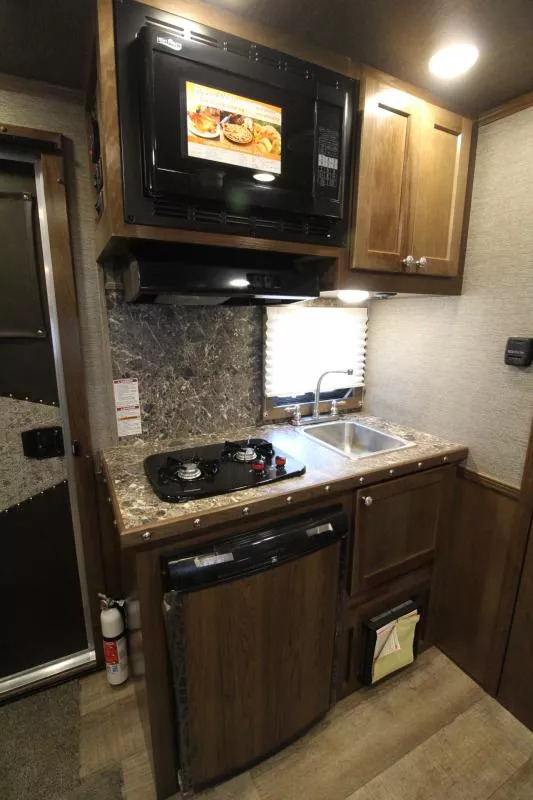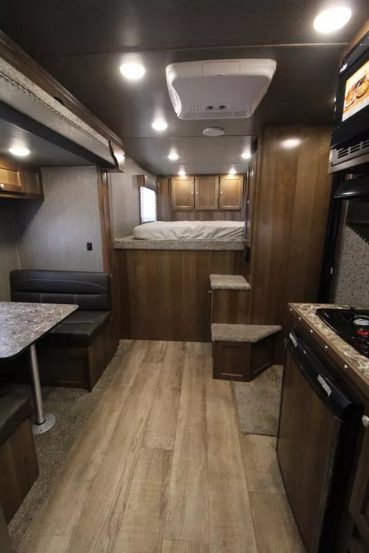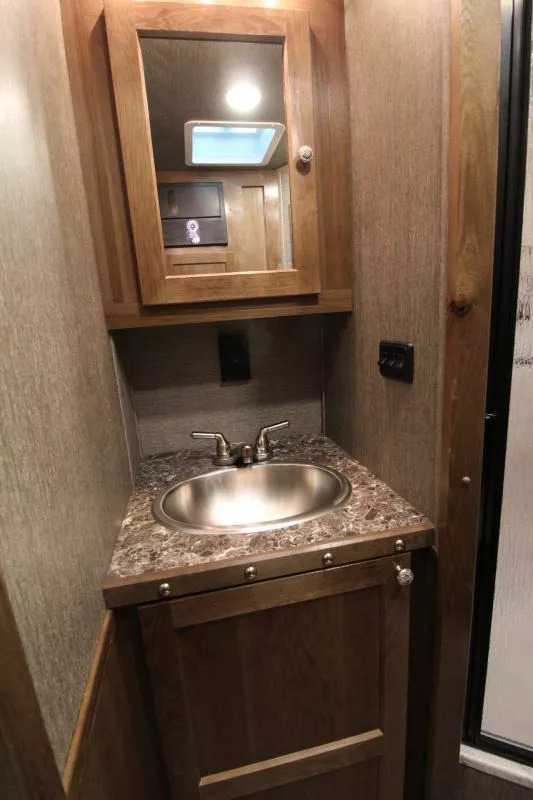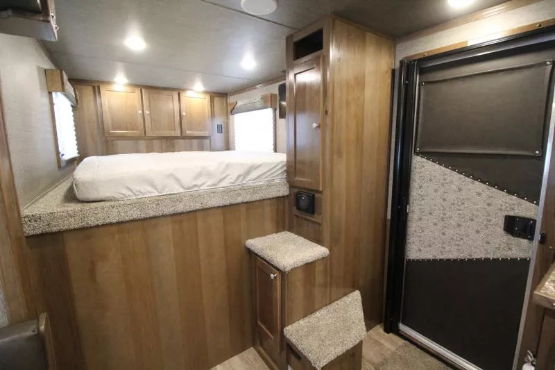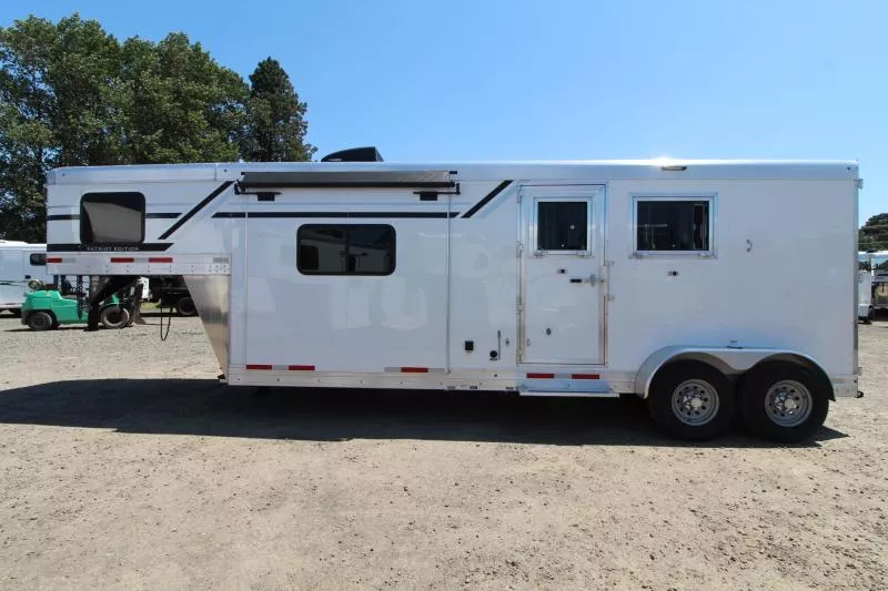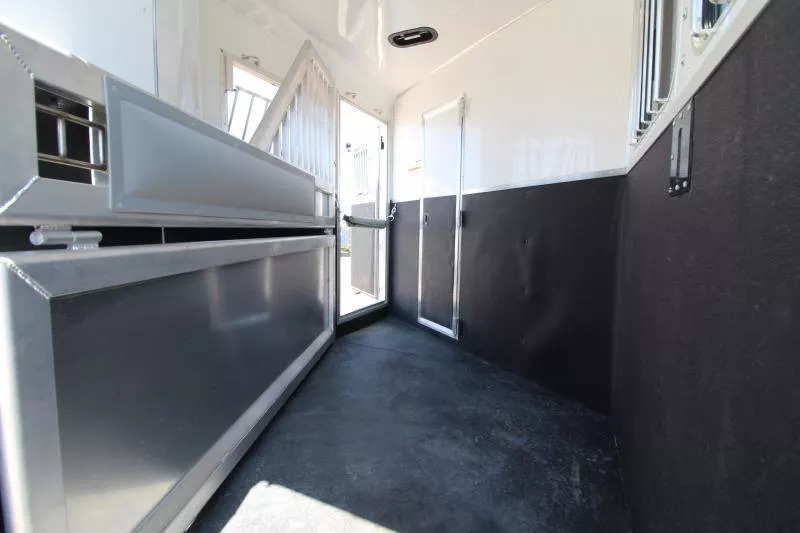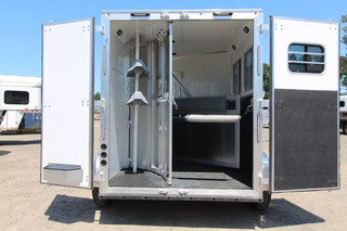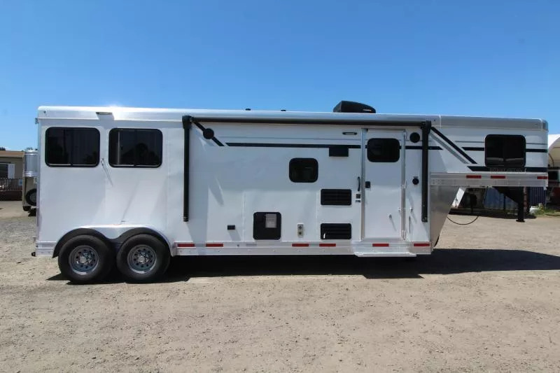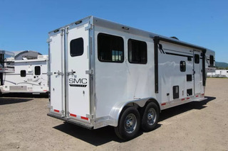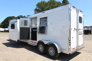 PRICE REDUCED $2,000 Upgrades/Added Options: * Air-flow horse dividers * Step at escape door * 10 Gallon hot water heater * Entertainment Package: ( Includes a 24” TV , Stereo, and 2 Interior & 2 Exterior speakers. ) * Convection Microwave * Porceline Toilet * Extra set of tail lights Standard Features: * All Aluminum Construction * 6’9” Wide * 9ft Short Wall Living Quarters * Aluminum Kick Plate w/ Rubber Horse Area * Single Leg Hydraulic Jack * Collapsible Rear Tack * Saddle Boss Saddle Tiers * Stud Divider 1st Stall * 55/45 Rear Doors w/ Full Height Cam Bars * Single Piece Aluminum Roof * Escape Door w/ Drop-Down Window * Side & Rear Load Lights * Spare Tire * LED Lighting in Horse Area * Cable Driven Slide-Out * Awning * A/C Unit * Exterior Water Spigot * 12V Fan in Bathroom * (2) 20# LP Tanks * (2) RV Batteries * Glass Shower Door * Solid Wood Cabinet Doors * (2) Burner Cooktop * Stainless Steel Sinks * Soft Touch Pleated Shades * Dinette - Converts to a bed * Mattress * Gas Furnace * LED Puck Lighting in Ceiling * Gas Water Heater * Dometic RV Fridge Horse area Dimensions: 1st stall: 32” W 95” Long divider 2nd Stall: 33” W (Narrowest part between divider and rear tack) Divider to rear door along wall: 36” Tail Wall: 76” Head wall: 88” not including rear tack, Rear tack is 42” long Interior width: 77.5” 40” door opening with rear tack ** Descriptions Subject to Error** For more information on this trailer please contact Double J Trailers at 360-225-1234. Thank You! Financing available to qualified buyers! All trailer prices are cash prices. Thank you! Trades Welcome Two Lots To Better Serve You! Woodland Washington & Albany Oregon We have over 250 trailers in stock. Please view our entire inventory at [www.double-j.com](http://www.double-j.com/) thank you! *Double J imposes a surcharge of 3% on credit card purchases of amounts greater than $500*