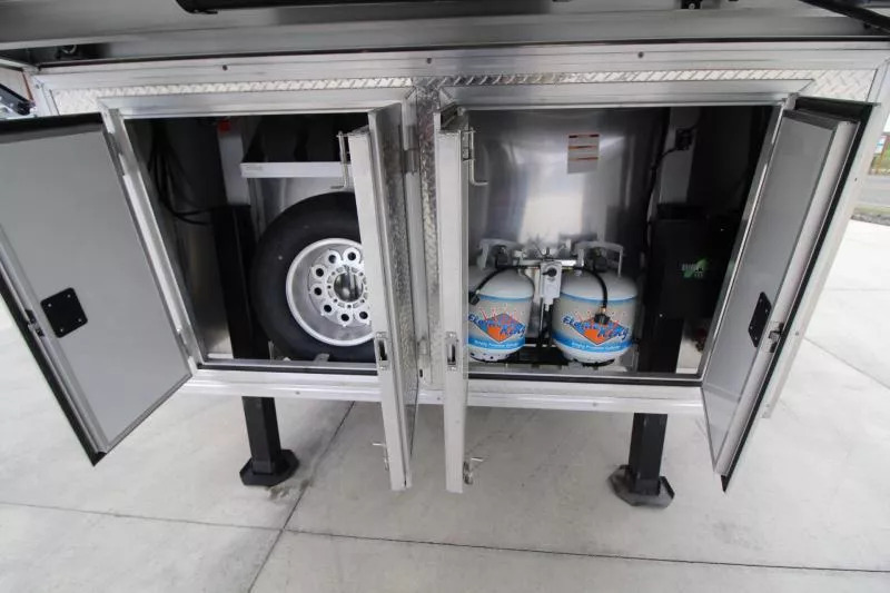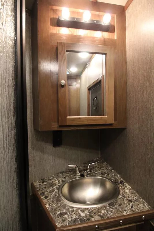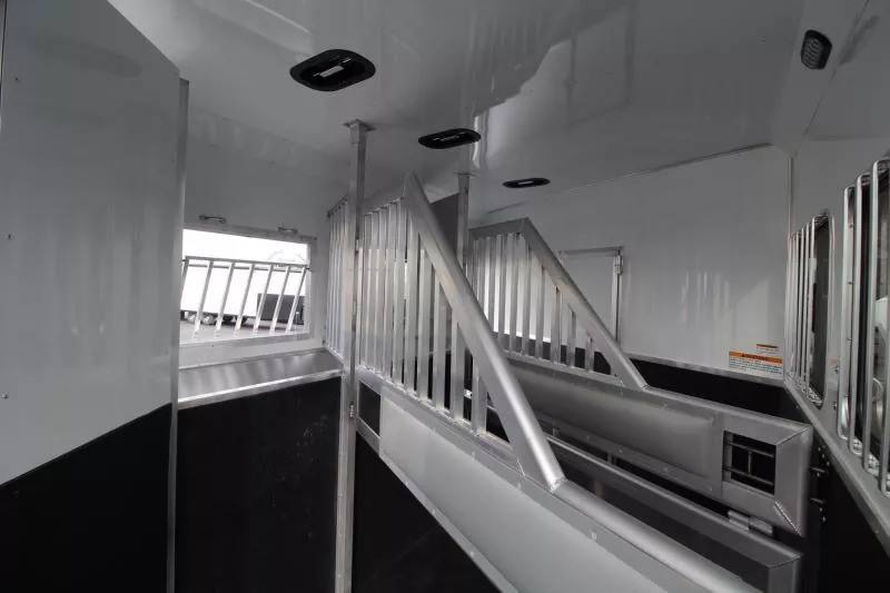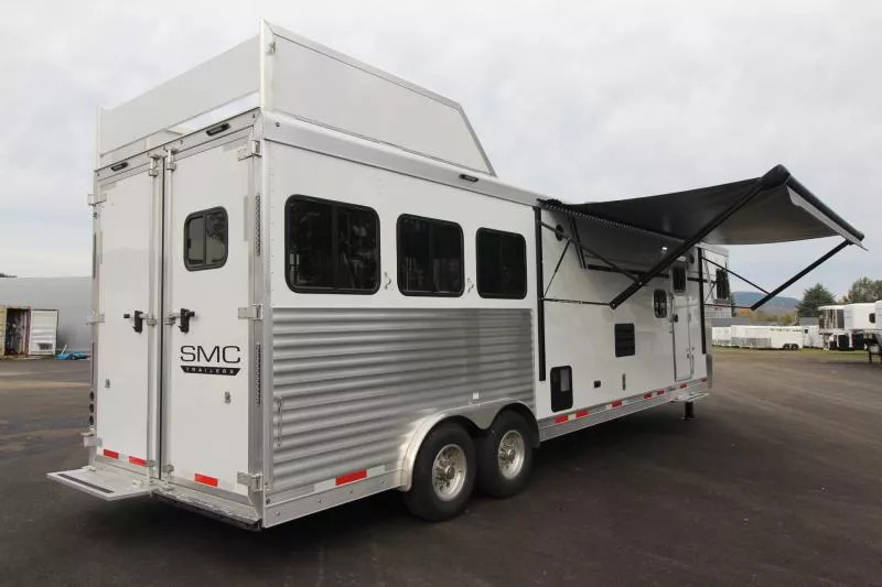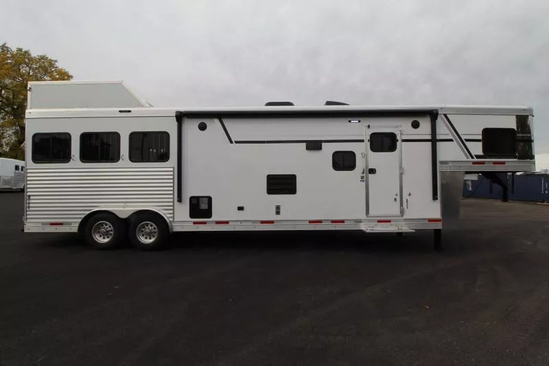 Trailer Features: All Aluminum Construction 8’ Wide 7000# Axles Polished Aluminum Wheels Dual Leg Hydraulic Jack Extruded Slat Outside of Horse Area Folding step at escape door Hay Rack & Ladder Stainless Steel Nose Wrap Full Front Riser Wall Cover Keyless Entry 320W Solar Panel Power Awning w/ Weather shield and light Single Piece Aluminum Roof Side & Rear Load Lights Spare Tire (2) 5 gal. LP Tanks (2) RV Batteries Double Tail Lights LQ Features: LED Puck Lighting in Ceiling Barnwood Linoleum Floor 10 gal. Water Heater Convection Microwave Dream Dinette 2 Burner Recessed Cooktop Dometic Refrigerator Porcelain Toilet Cable Driven Slide Out A/C 12V Fan in Bathroom Glass Shower Door Solid Wood Cabinet Doors Stainless Steel Sinks Soft Touch Pleated day/night Shades Sofa/Sleeper Mattress Gas Furnace 24” TV Radio - interior & exterior speakers Horse Area Features: Air Flow Dividers Escape Door w/ Drop Down Window Step at Escape Door Feed Bag in 1st Stall Stud Divider 55/45 Rear Doors LED Lighting Rubber Wall Mats Rubber Floor Mats Tack Area Features: Collapsible Rear Tack Flip down step Blanket Bar Brush Tray Bridle/Halter Hooks - extra added 3 Tier Saddle Rack on Removable Post LED Dome Light Total height from ground to top of hayrack: 11’6” ** Descriptions Subject to Error** For more information on this trailer please contact Double J Trailers at 360-225-1234. Thank You! Financing available to qualified buyers! All trailer prices are cash prices. Thank you! Trades Welcome Two Lots To Better Serve You! Woodland Washington & Albany Oregon We have over 250 trailers in stock. Please view our entire inventory at [www.double-j.com](http://www.double-j.com/) thank you! *Double J imposes a surcharge of 3% on credit card purchases of amounts greater than $500*