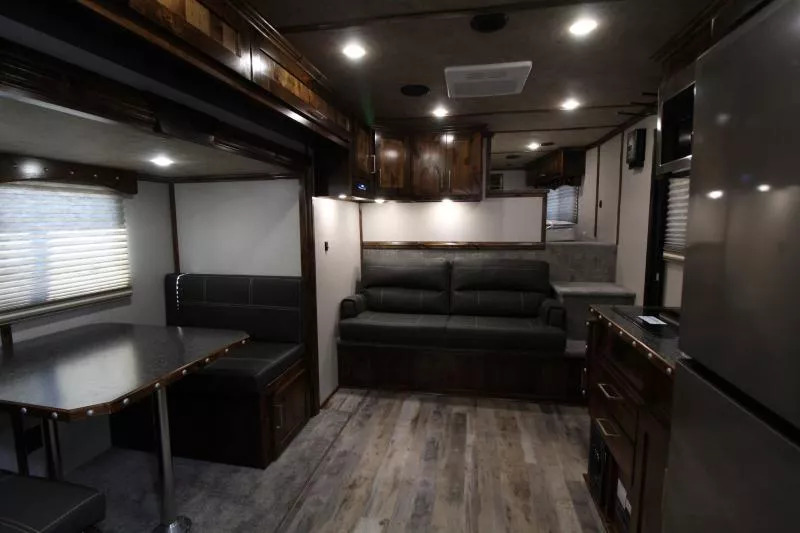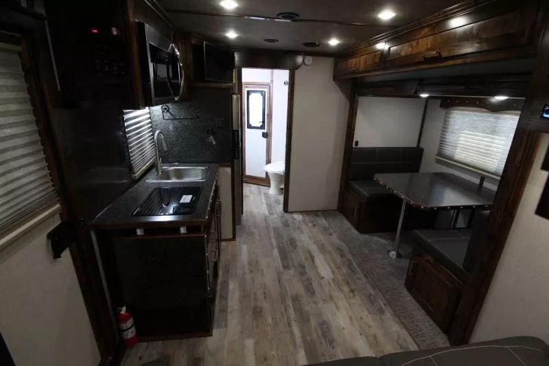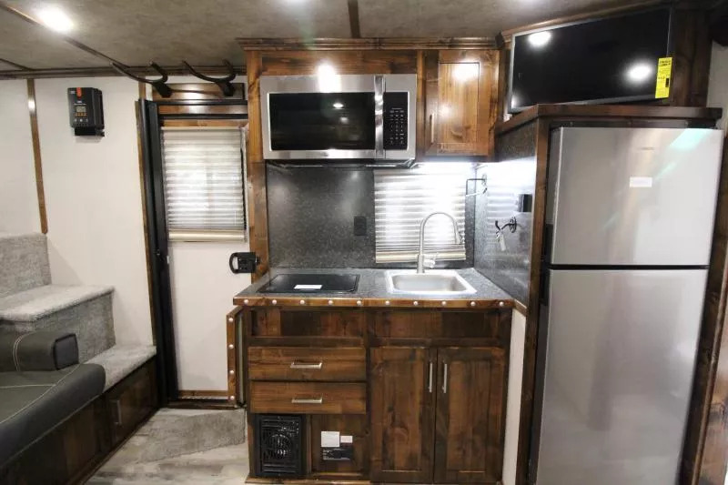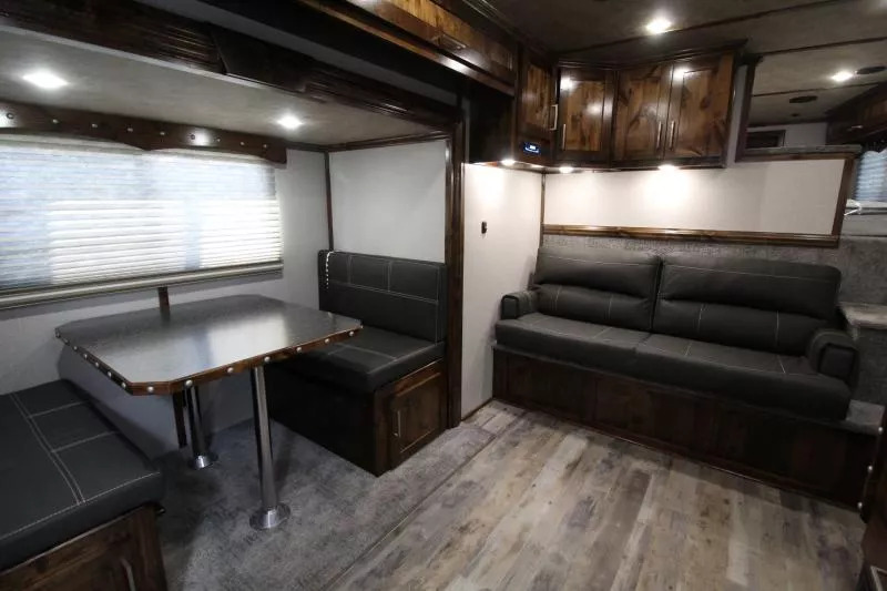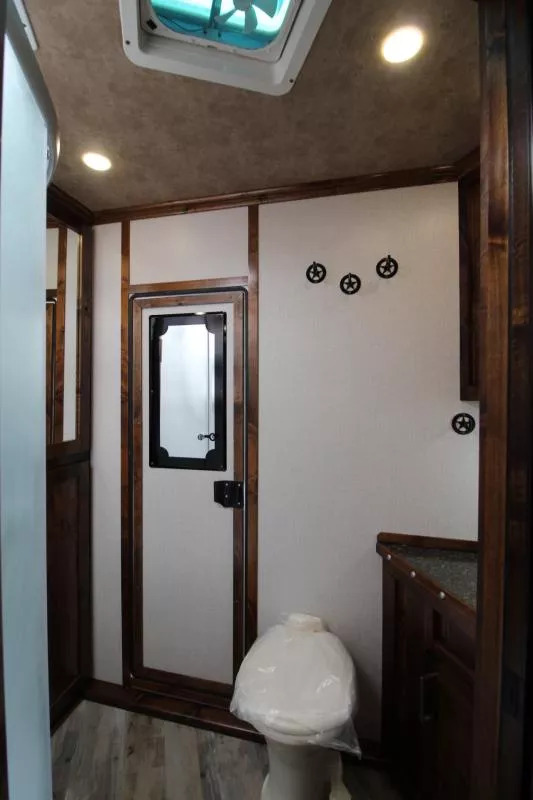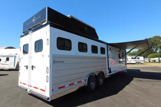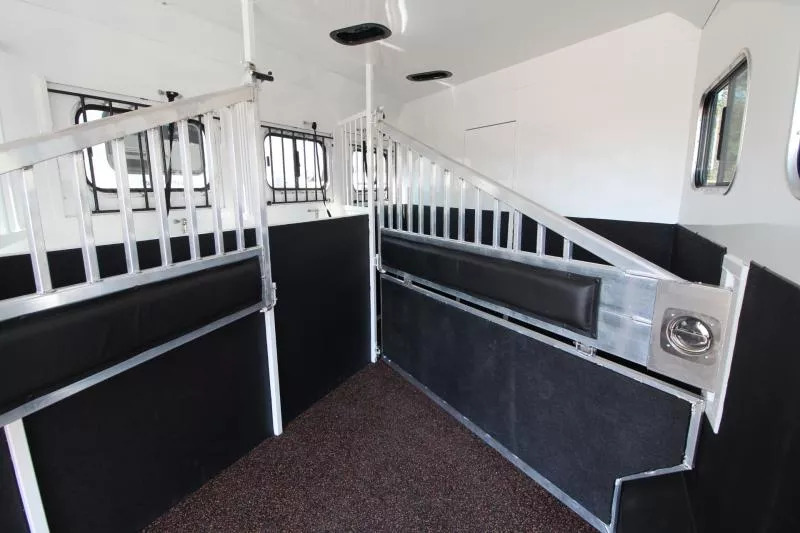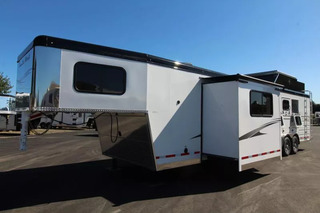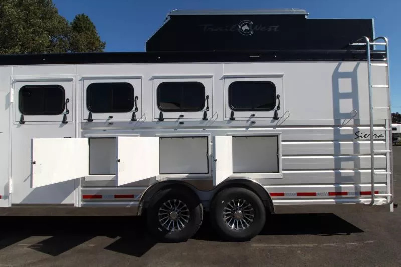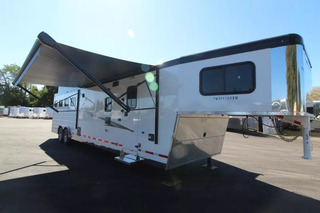 Trails West knows the importance of ease on the road. That’s why we design each living quarters horse trailer to suit your needs. We take the extra step of constructing not only the trailer shell, but the living quarters area as well in our in-house facility in Preston, Idaho. Trails West knows the importance of ease on the road. That’s why Trails West designs each living quarters horse trailer to suit your needs. We take the extra step of constructing not only the trailer shell, but the living quarters area as well in our in-house facility in Preston, Idaho. UPGRADED OPTIONS: Hay pod Portable Gen-ready 320 watt Solar Black-out package 3 Burner Cooktop w/ Oven Convenience Package Exterior Faucet Stud Divider Manger Package w/ Drain Exterior Outlet Pass through Door Shower Dome Exterior Shower Escape Door 2 Exterior Speakers Power Awning Roll out screen door CONSTRUCTION & EXTERIOR: Camper Door w/ 24” Window 24 x 48 Escape Window 18 x 18 Window 8’0” Wide 7’6” Tall 8’ Gooseneck Side Tack Slide-out Dual Hydraulic Jacks Retractable Step Under Camper Door Power Awning Hoof Grip Flooring in Horse Compartment INTERIOR: Soft Touch Ceiling Synthetic Leather Sofa & Dinette Cushions Day/Night Shades w/ Valances Color coordinated interior Vinyl floor w/wood print throughout Hardwood Cabinetry Stairs into bed area FRESH & WASTE WATER SYSTEMS: Low point fresh water drains Demand type water pump Combination locking water center 48 gal. fresh water tank 28 gal. black holding tank 28 gal. gray holding tank 6 gal. DSI water heater Sewer hose storage compartment Sewer hose and adapter GALLEY: 2 burner cooktop with range hood 8 cu ft. Electric refrigerator Sink Wood trimmed counter tops Flip up counter top extension Microwave/Convection Oven HEATING/INSULATION: Dual 5 gal. propane tanks w/ auto changeover Fully insulated floor, roof and walls 18,000 BTU furnace (ducted to bathroom) Ducted Air Conditioning SAFETY: Locking water fill door Fire extinguisher CO/Smoke detector L.P. detector Alternate emergency exit BATHROOM: 36” x 40” Shower stall with glass door 12 volt exhaust fan Fresh water flush toilet Wash basin with vanity Large Wardrobe Closet (2) Drawers SLEEPING ACCOMMODATIONS: Queen size bed Bedspread, pillows & shams Dinette & Sofa coverts into a bed ELECTRICAL: Locking battery box Monitor Panel 320 watt Solar 12 volt outlets 110 volt outlets 110V/12V power converter w/charger 30’ service cord AM/FM stereo with CD player TV antenna with power booster Porch light by camper door Lighted grab handle by exterior door Recessed LED lighting STRUCTURAL 8’0” Wide, 7’6” Tall Aluminum One-Piece Roof .050 Aluminum Exterior Sheets/Anodized Aluminum Extrusions Steel Frame 2 x 10 Douglas Fir Floor Torsion Axles with Easy Lube Hubs Four Wheel Electric Brakes Radial Tires HORSE COMPARTMENT FEATURES Triple Wall Construction Lined and Insulated Roof and Walls Bottom Latch Drop Down Feed Doors Head Side Drop Down Safety Grill Slam Latch, Aluminum, Jailbar Dividers Divider Pads Sliding Windows Tail Side Roof Vent in Each Stall Rubber Wall Mats Stall Light per Stall with Exterior Switch Floor Mats 45/55 Double Rear Doors with Windows PAINT & TRIM Stainless Steel Nose Tread Brite Front and GN Gussets Aluminum Wheels Double Tail Lights Rubber Bumper LED Lighting Backup Lights Molded Seven-Way RV Plug Hot wire Package with Battery Box Acidic Phosphatizing Wash Polymer Coating Epoxy Primer Polyurethane Paint Infrared Cured WARRANTY Three Year Limited Paint/Trim Five Year Limited Structure Eight Year Limited Floor ** Descriptions Subject to Error** For more information on this trailer please contact Double J Trailers at 360-225-1234. Thank You! Financing available to qualified buyers! All trailer prices are cash prices. Thank you! Trades Welcome Two Lots To Better Serve You! Woodland Washington & Albany Oregon We have over 250 trailers in stock. Please view our entire inventory at [www.double-j.com](http://www.double-j.com/) thank you! *Double J imposes a surcharge of 3% on credit card purchases of amounts greater than $500*