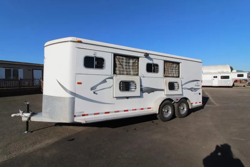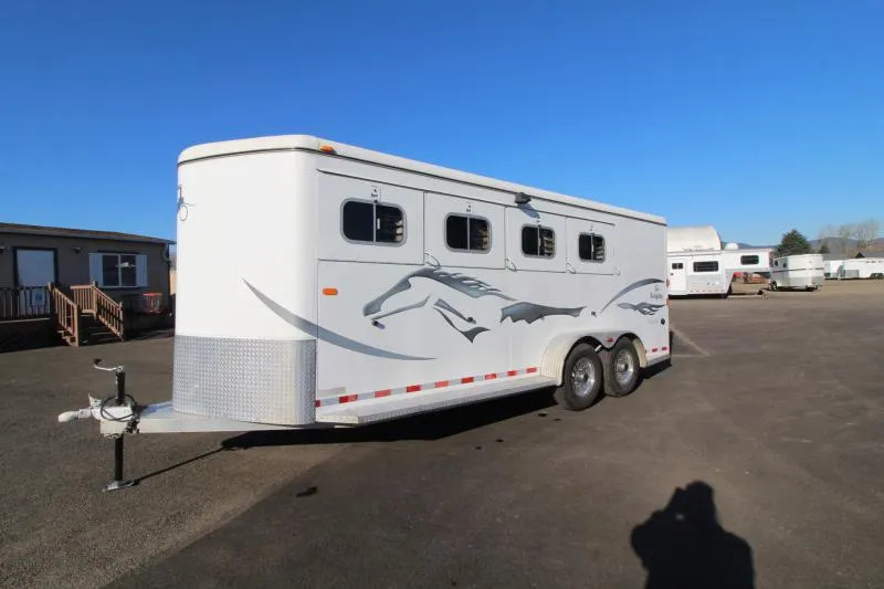 Trailer Features: 7’ Inside Height 6’ 9” Width 21’ Floor Length Tread Brite Gravel Guard Full Length Running Boards Tie Rings 50/50 Double Rear Doors Load Lights Tack Room Features: Tack Door Organizer Saddle Rack Blanket Bars Hat racks Bridle/ Halter Hooks Spare Tire Water Tank w/Stand Carpeted Slant Wall Clothes Rod Boot Box Carpeted Floor Horse Area Features: Rubber Floor Mats Rubber Wall Mats Padded Adjustable Dividers Safety Screens (4) Drop Down Windows - Head Side (3) Drop Down Windows -Tail Side Roof Vents Tie Rings ** Descriptions Subject to Error** For more information on this trailer please contact Double J Trailers at 360-225-1234. Thank You! Financing available to qualified buyers! All trailer prices are cash prices. Thank you! Trades Welcome Two Lots To Better Serve You! Woodland Washington & Albany Oregon We have over 250 trailers in stock. Please view our entire inventory at [www.double-j.com](http://www.double-j.com/) thank you! *Double J imposes a surcharge of 3% on credit card purchases of amounts greater than $500*