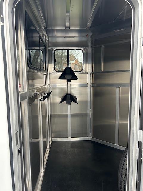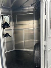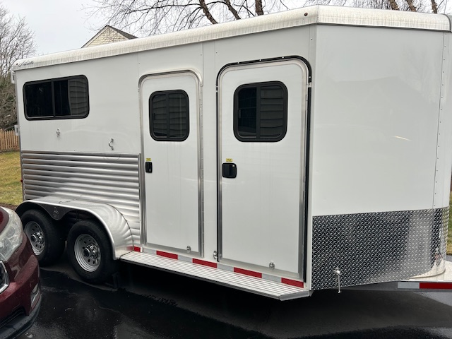 -4’ dressing room includes 2 saddle racks, 6 bridle hooks, rubber mats on dressing room floor, sliding window over saddle racks, camper style door with sliding window and screen door.