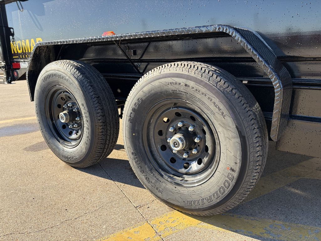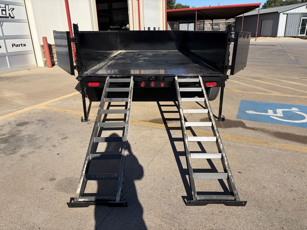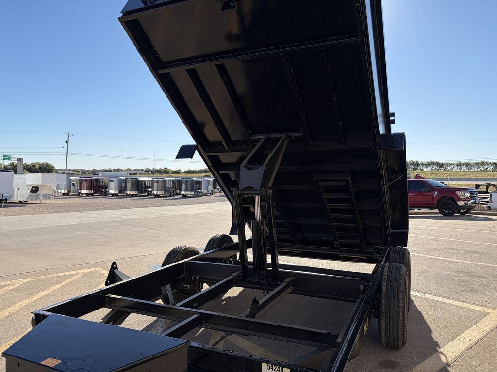 83 in x 14ft Tandem Axle Dump Low Profile Frame Hand Crank Tarp 2 x 7,000 lb. Self Adjusting Brake Axles 2 5/16 in Adjustable EZ Latch Coupler 7K Drop Leg Top Wind Jack 6 in Channel Frame and Tongue ST235 80 R16 in LR E (8 Hole) (10 Ply Radials) Lockable Pump and Battery Box Fully Self Contained Elec. Hyd. Scissor Lift Power Up & Down + Gravity Option Option To Gravity Lower To Save Battery Included 24 in Sides 10 Gauge Steel Sides With Formed Channel Supports 10 Gauge Steel Floor 3 in x 2 in Tube Top Rail Diamond Plate Steel Fenders Barn Style Rear Gate (Spreader) 5 AMP On Board Charger 4 x ½ in D Rings Rear Stabilizer Jacks 6ft 6 in Rear Slide Out Ramps LED Lights 3 Stake Pockets on Each Side (Accepts Board Brackets) 7 Way RV Plug Empty Weight 3,660 lb. G.V.W.R. 14,000 lb. Carrying Capacity 10,340 lb. 7.25 Cubic Yards Black