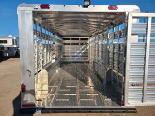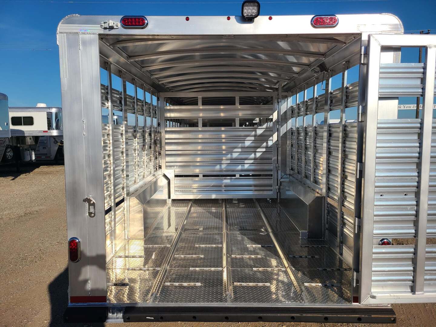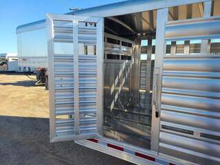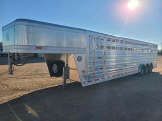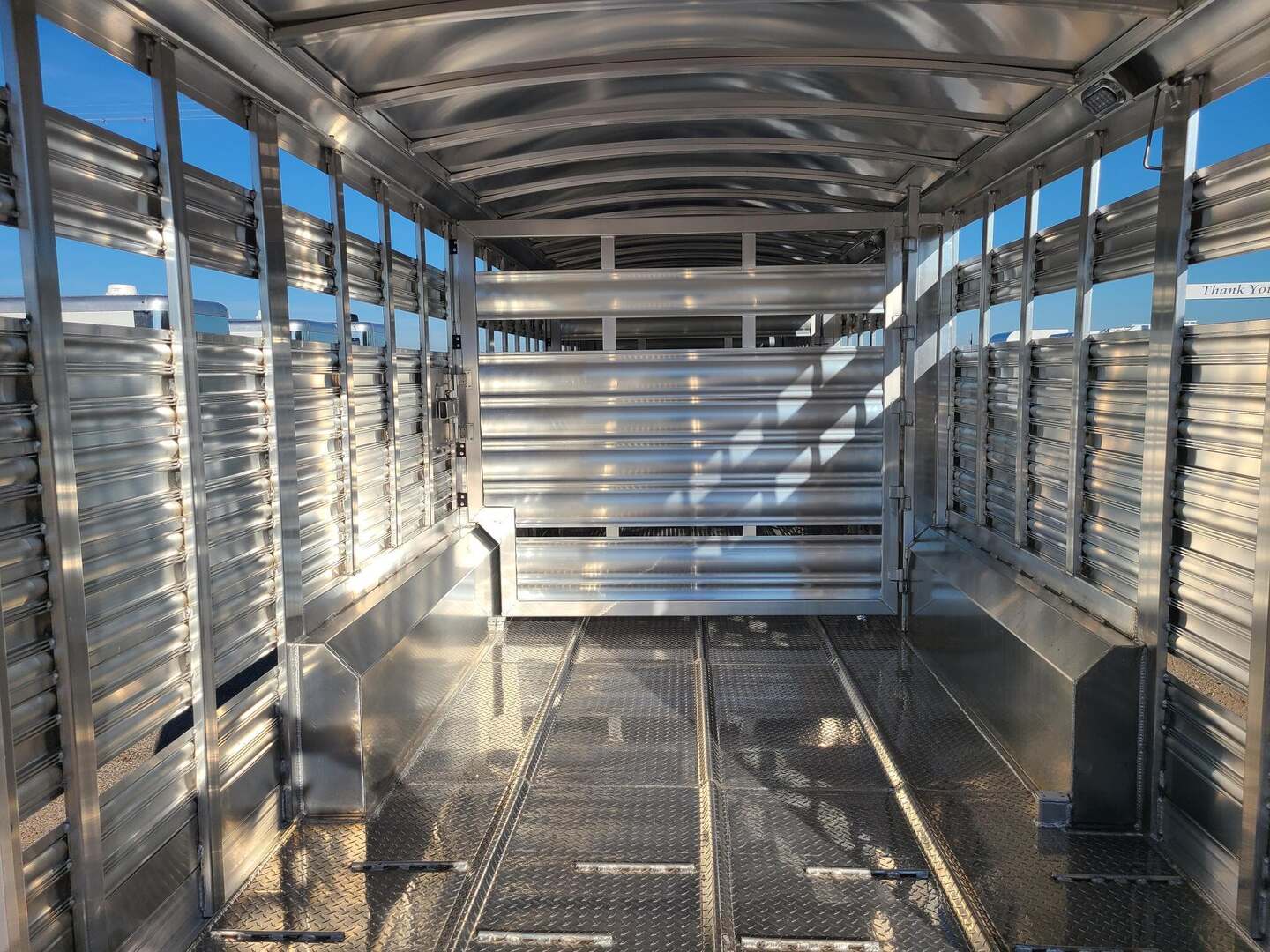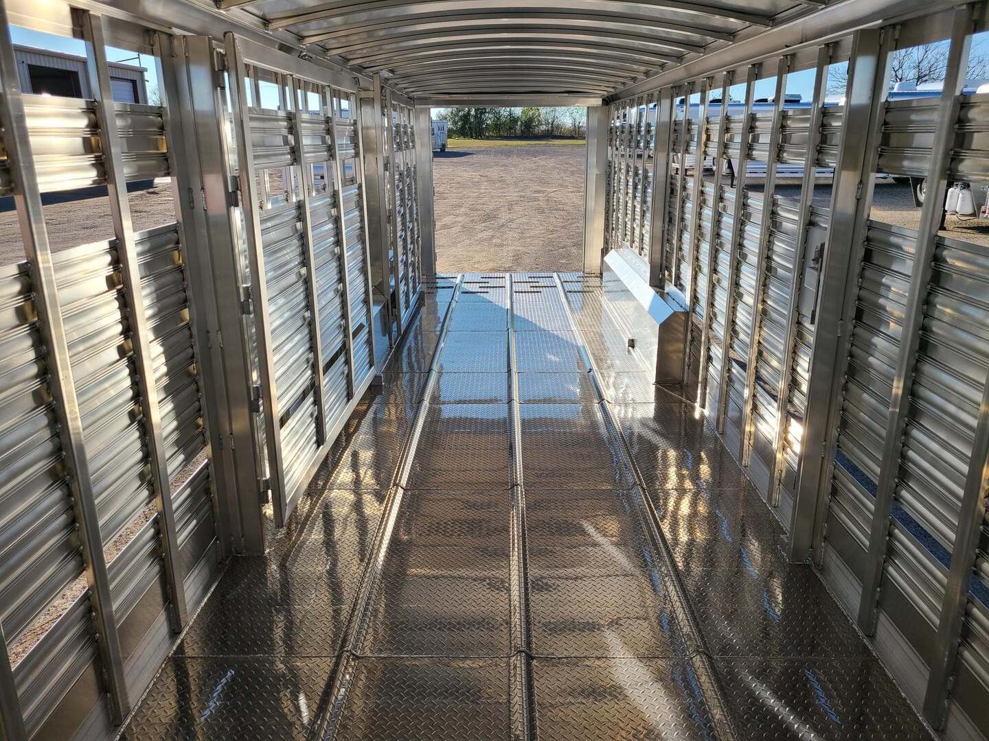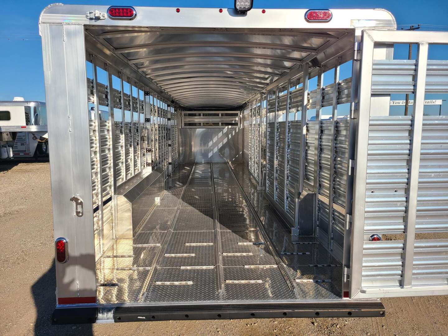 THIS TRAILER IS ON ORDER AND WILL ARRIVE IN APRIL Platinum Coach 32’ Stock Trailer  3-7,200# AXLES Mill Finish exterior skin 235/80R 16” spare 8 WIDE X 7” TALL Two 10’4” sections, one 11’4” section Corrugated aluminum floor Anti-Slip rods at rear Slider on rear gate Stock escape door at head side 7 lights on top rail Halogen load at rear 2” air crack 22” off floor